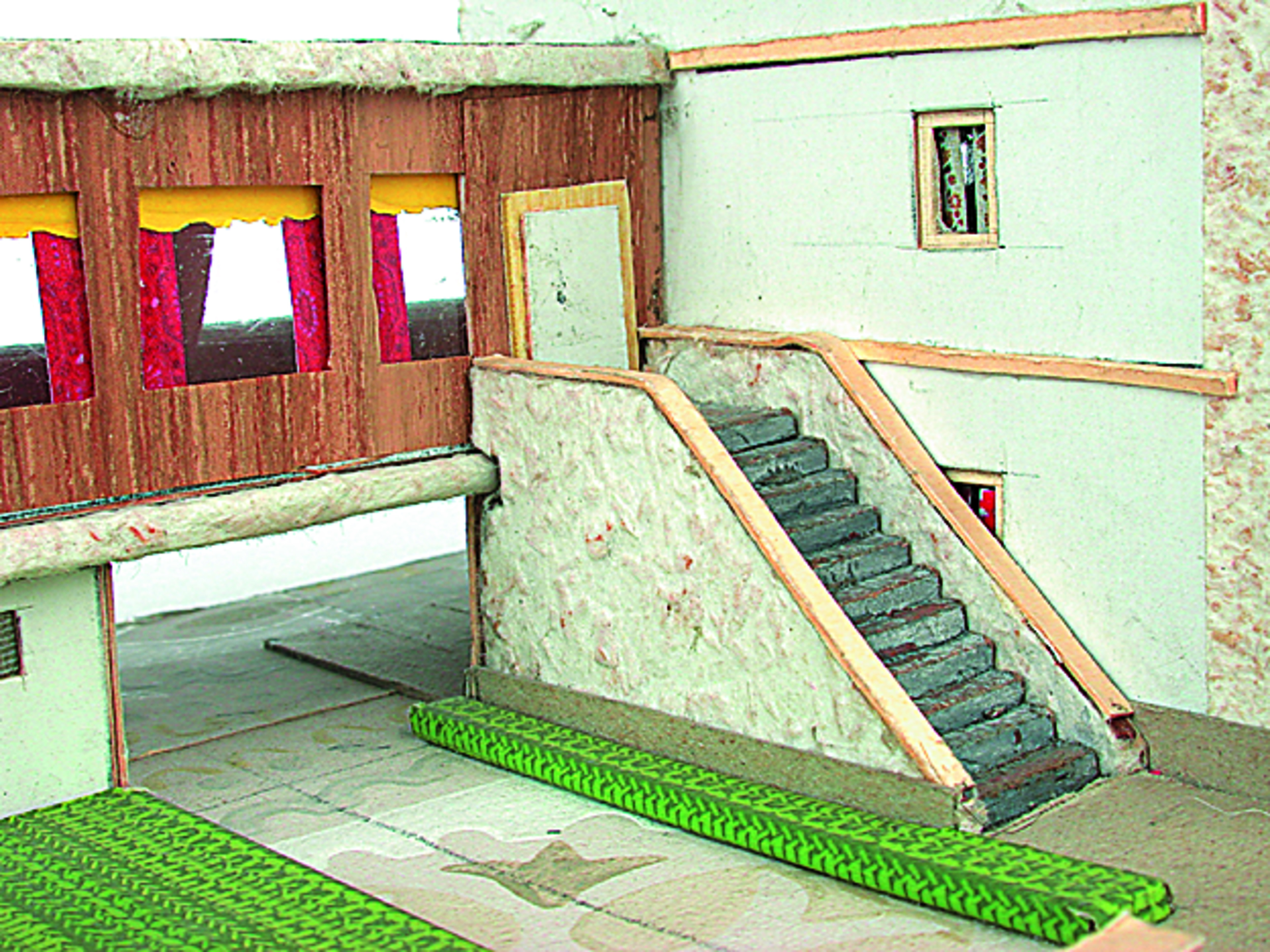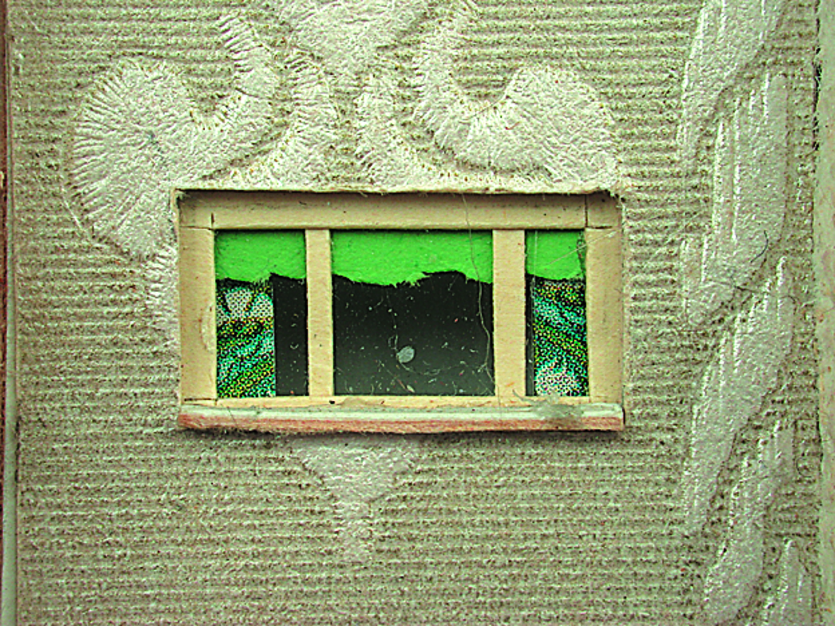 Anmerkung der Redaktion: Nicht von jedem Haus sind alle einzelnen verwendeten Materialien dokumentiert. Tatsächlich verbaute der Bastler auch Zigarettenschachteln, Spinnenpapier, Pappmaschee, Tapetenreste, Bunt- und Silberpapiere, Stoffe, Synthetikfasern, d-c-fix-Folien, Schriftproben, Zeitungsschnipsel und ausgewertete Illustrierte, Kartonagen, Holzabfälle aller Art, Uhu, Holzleim und Tapetenkleister.