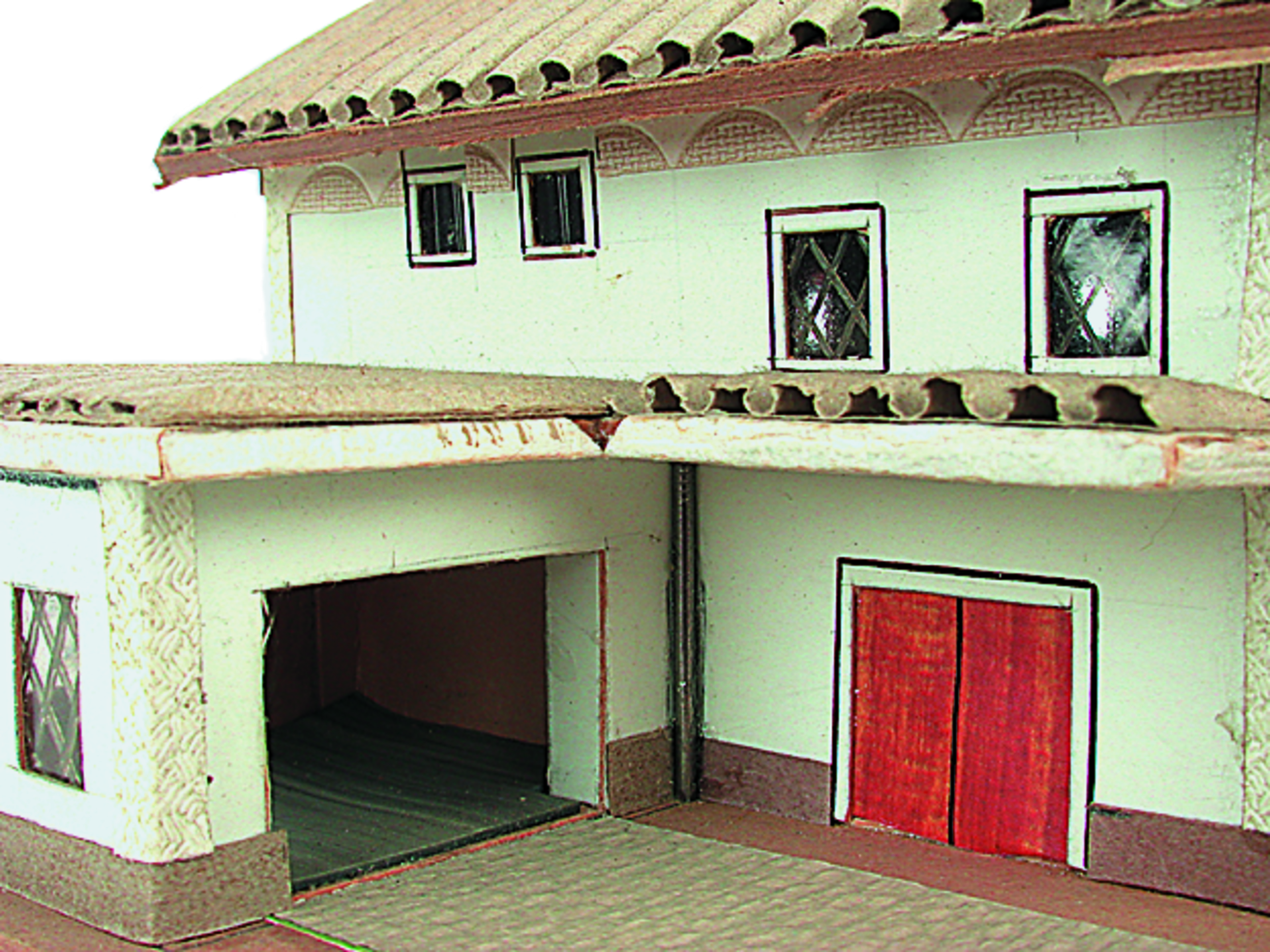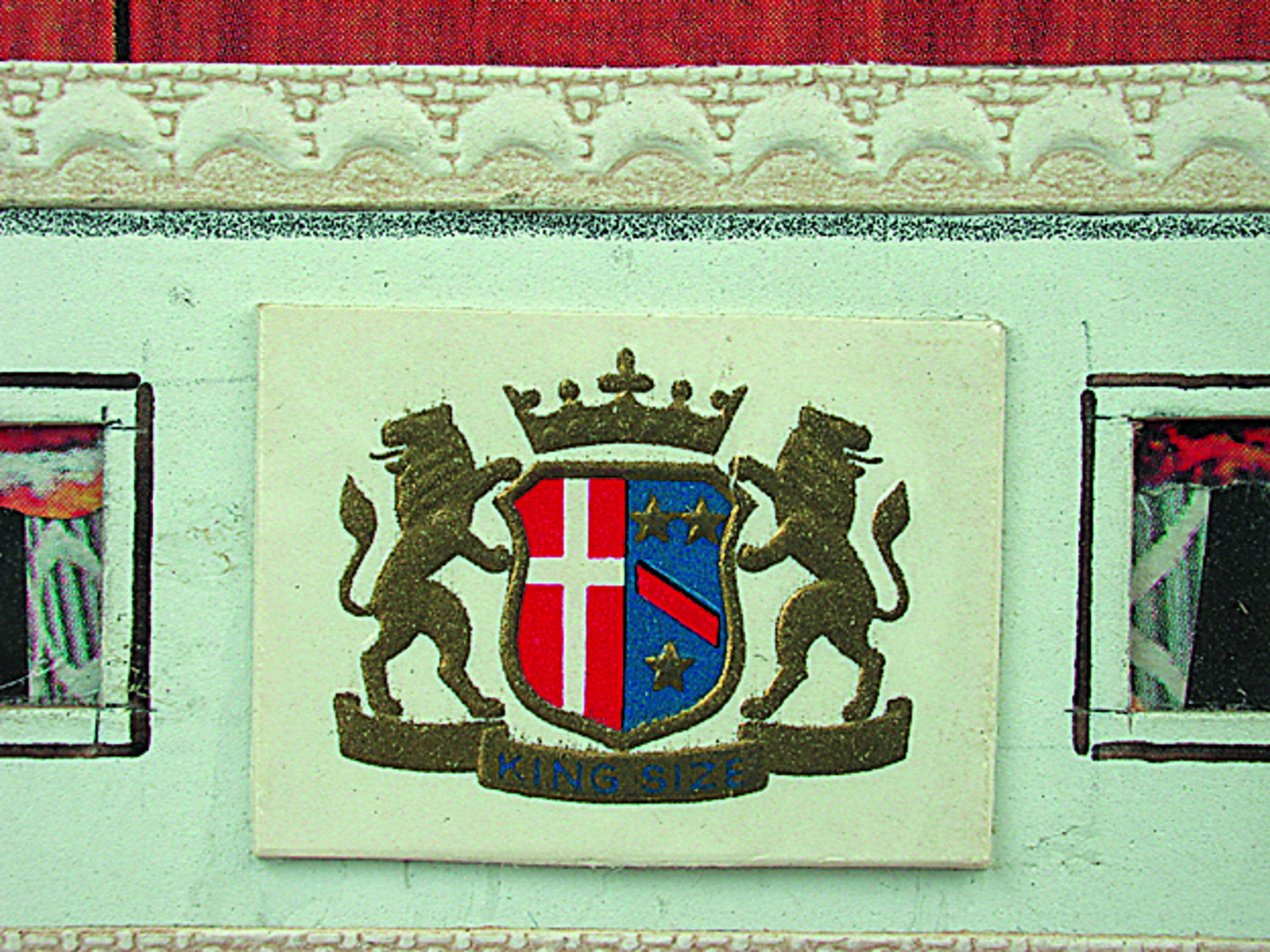 Anmerkung der Redaktion: Nicht von jedem Haus sind alle einzelnen verwendeten Materialien dokumentiert. Tatsächlich verbaute der Bastler auch Zigarettenschachteln, Spinnenpapier, Pappmaschee, Tapetenreste, Bunt- und Silberpapiere, Stoffe, Synthetikfasern, d-c-fix-Folien, Schriftproben, Zeitungsschnipsel und ausgewertete Illustrierte, Kartonagen, Holzabfälle aller Art, Uhu, Holzleim und Tapetenkleister.