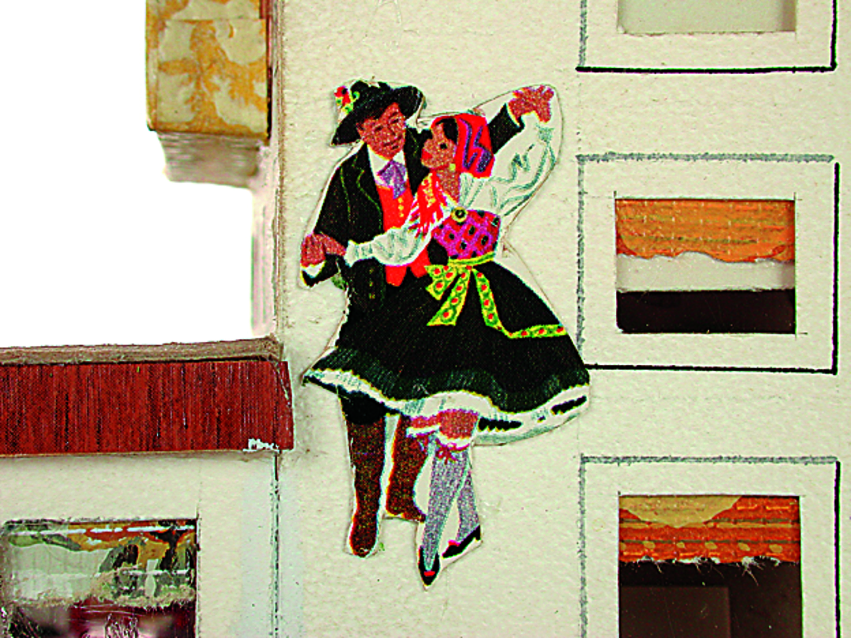 Anmerkung der Redaktion: Nicht von jedem Haus sind alle einzelnen verwendeten Materialien dokumentiert. Tatsächlich verbaute der Bastler auch Zigarettenschachteln, Spinnenpapier, Pappmaschee, Tapetenreste, Bunt- und Silberpapiere, Stoffe, Synthetikfasern, d-c-fix-Folien, Schriftproben, Zeitungsschnipsel und ausgewertete Illustrierte, Kartonagen, Holzabfälle aller Art, Uhu, Holzleim und Tapetenkleister.