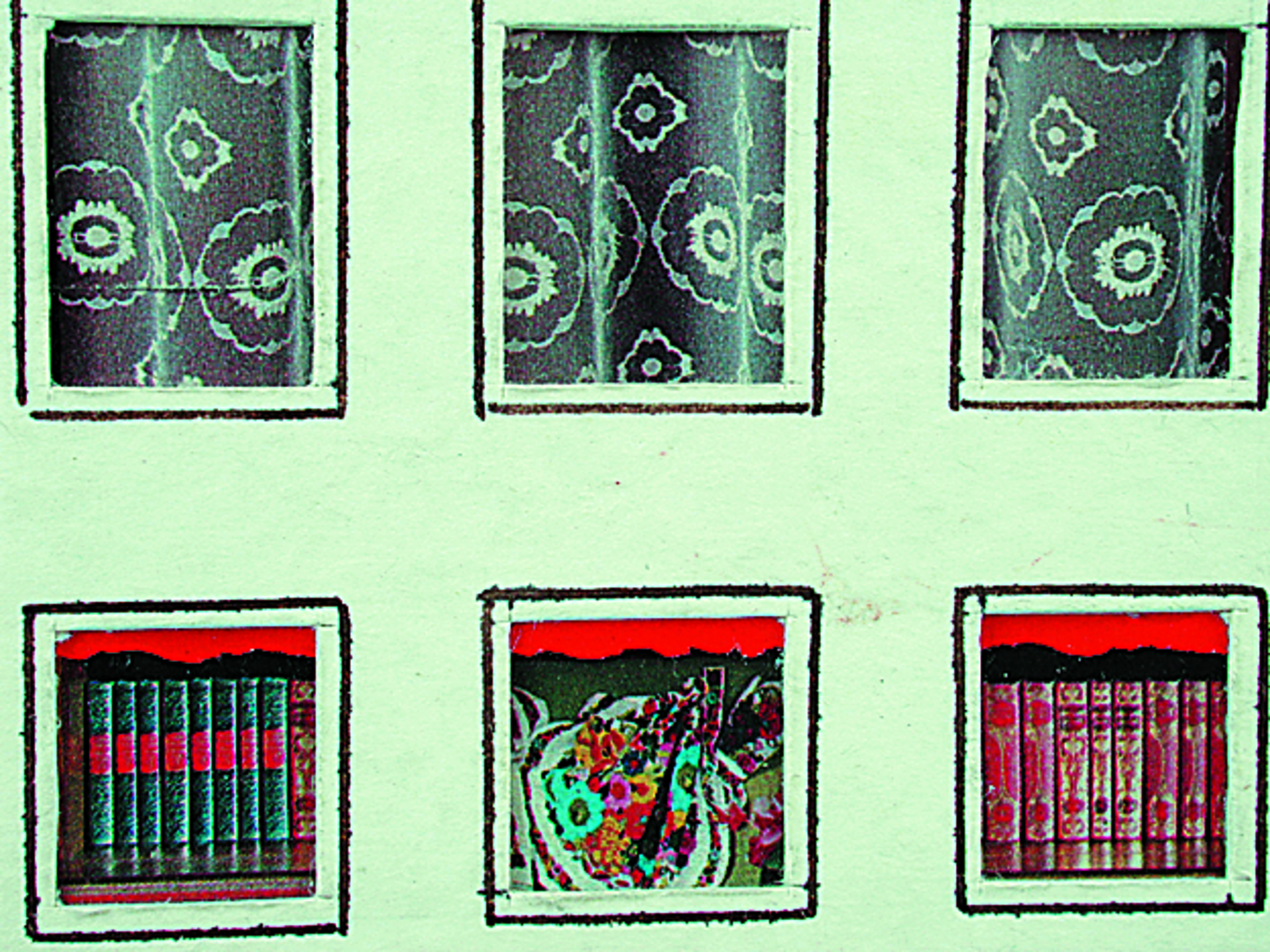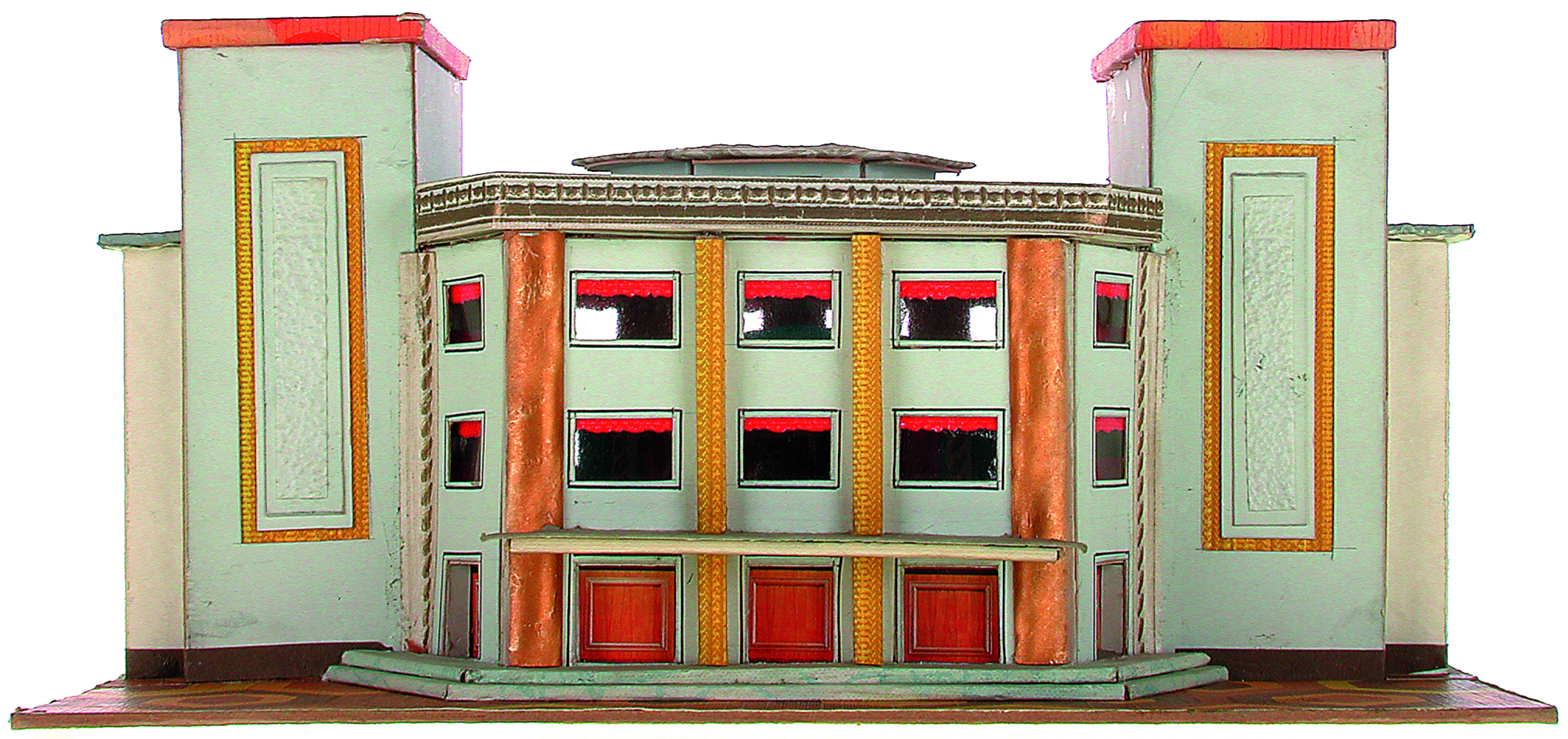 Anmerkung der Redaktion: Nicht von jedem Haus sind alle einzelnen verwendeten Materialien dokumentiert. Tatsächlich verbaute der Bastler auch Zigarettenschachteln, Spinnenpapier, Pappmaschee, Tapetenreste, Bunt- und Silberpapiere, Stoffe, Synthetikfasern, d-c-fix-Folien, Schriftproben, Zeitungsschnipsel und ausgewertete Illustrierte, Kartonagen, Holzabfälle aller Art, Uhu, Holzleim und Tapetenkleister.