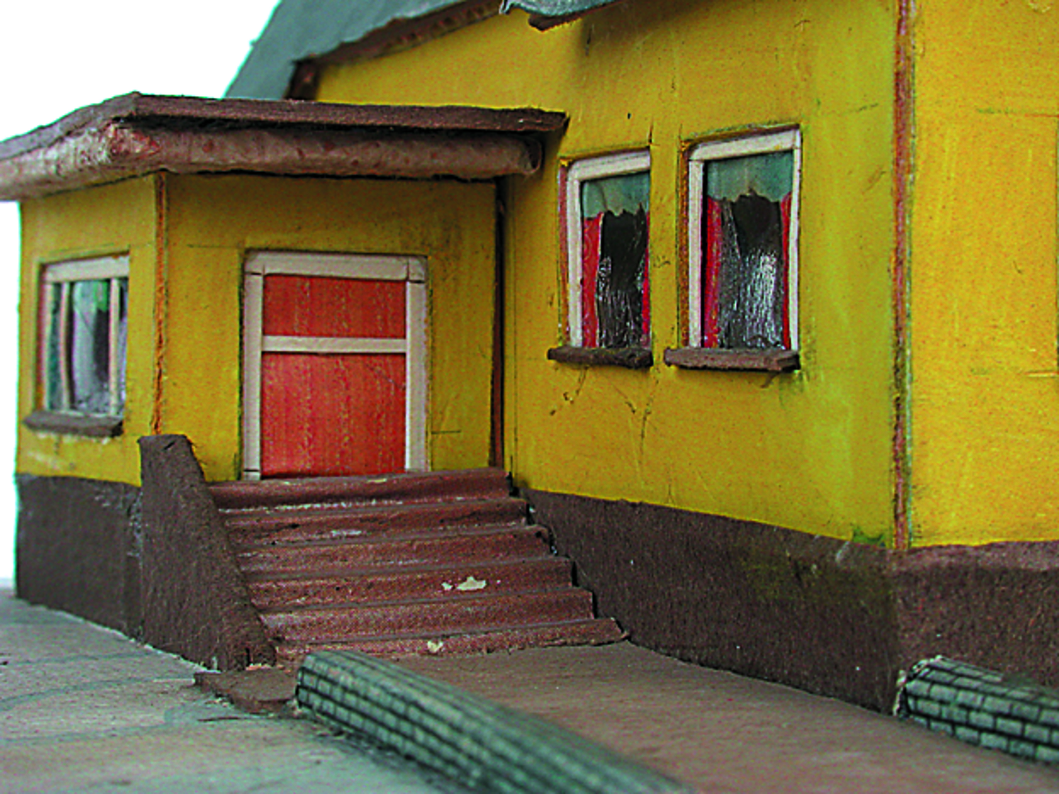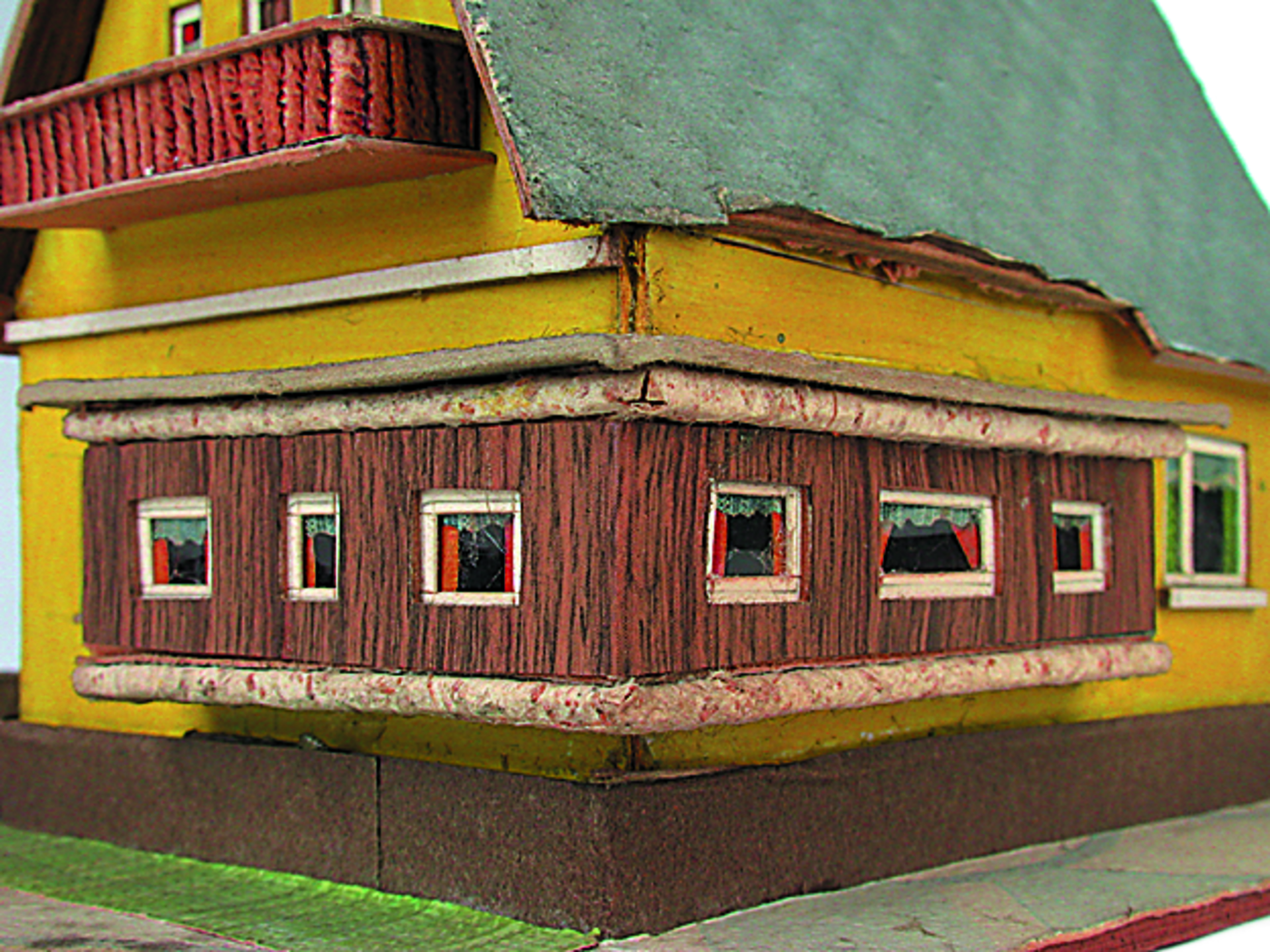 Anmerkung der Redaktion: Nicht von jedem Haus sind alle einzelnen verwendeten Materialien dokumentiert. Tatsächlich verbaute der Bastler auch Zigarettenschachteln, Spinnenpapier, Pappmaschee, Tapetenreste, Bunt- und Silberpapiere, Stoffe, Synthetikfasern, d-c-fix-Folien, Schriftproben, Zeitungsschnipsel und ausgewertete Illustrierte, Kartonagen, Holzabfälle aller Art, Uhu, Holzleim und Tapetenkleister.