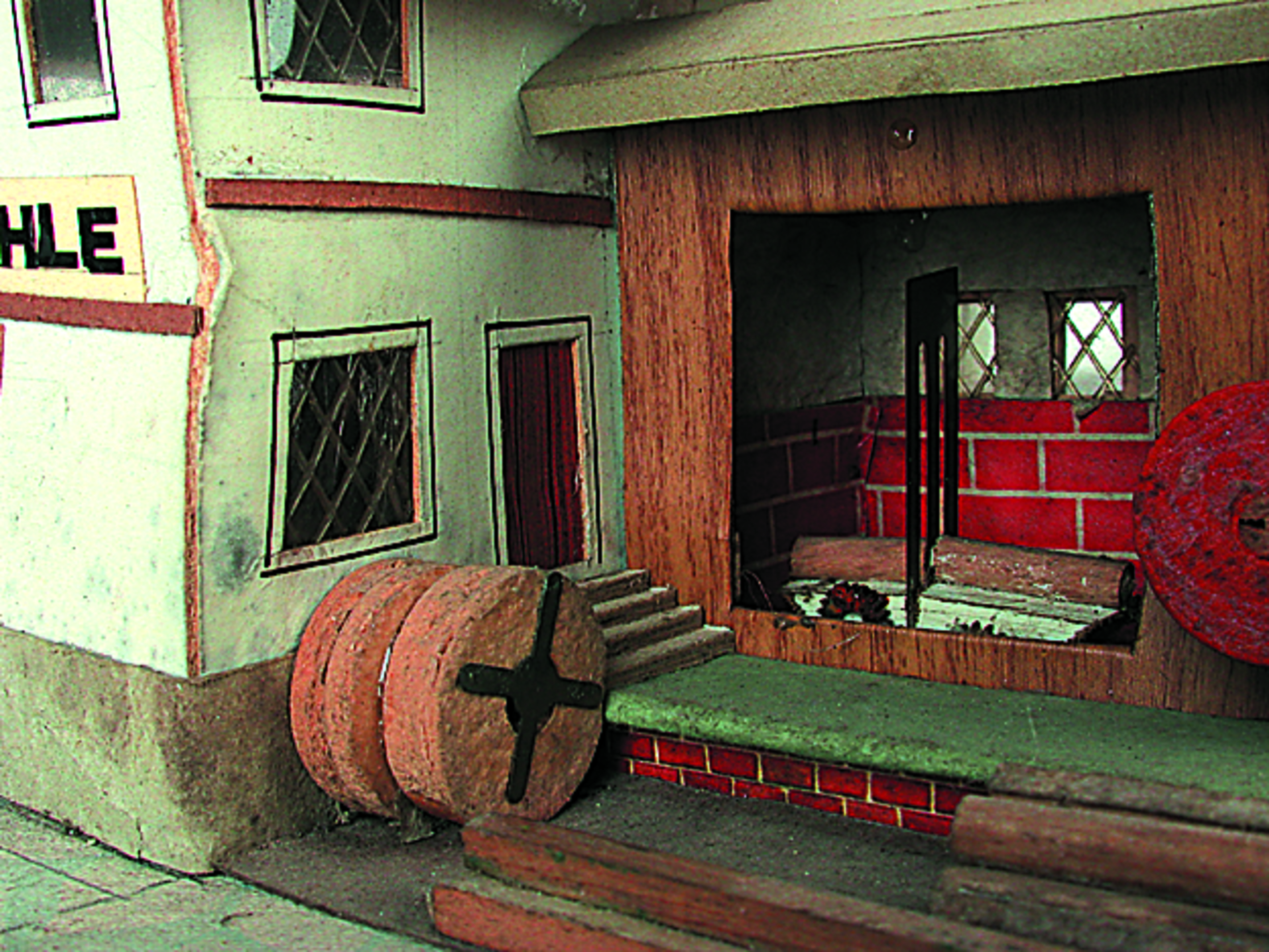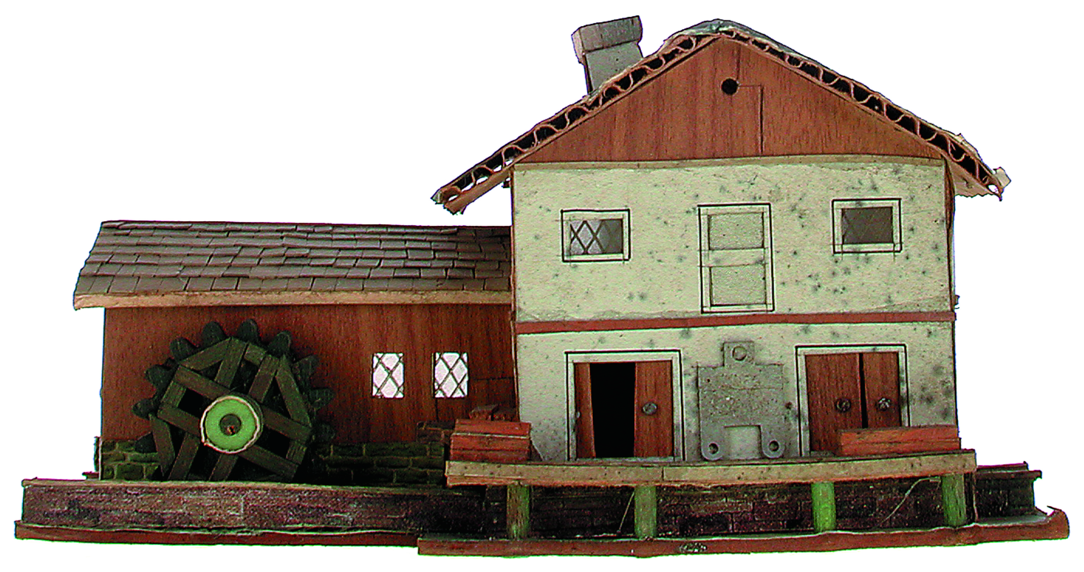 Anmerkung der Redaktion: Nicht von jedem Haus sind alle einzelnen verwendeten Materialien dokumentiert. Tatsächlich verbaute der Bastler auch Zigarettenschachteln, Spinnenpapier, Pappmaschee, Tapetenreste, Bunt- und Silberpapiere, Stoffe, Synthetikfasern, d-c-fix-Folien, Schriftproben, Zeitungsschnipsel und ausgewertete Illustrierte, Kartonagen, Holzabfälle aller Art, Uhu, Holzleim und Tapetenkleister.