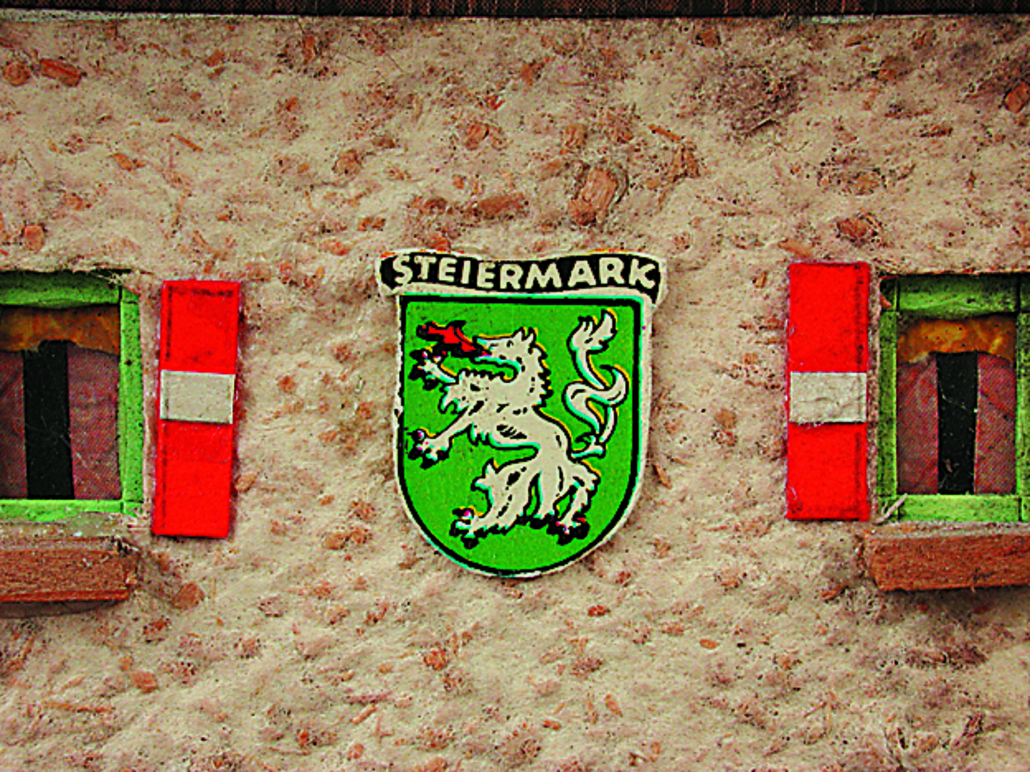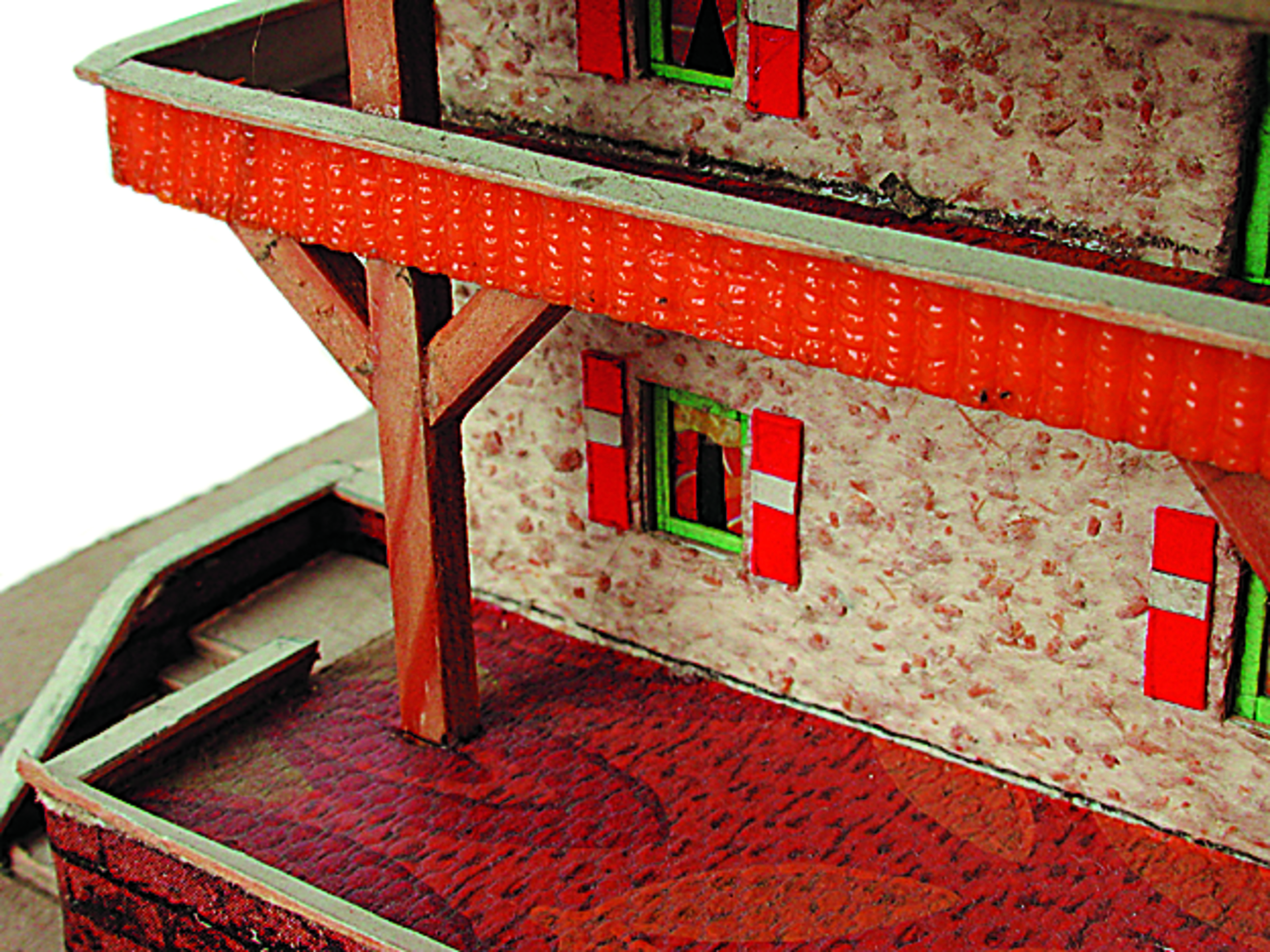 Anmerkung der Redaktion: Nicht von jedem Haus sind alle einzelnen verwendeten Materialien dokumentiert. Tatsächlich verbaute der Bastler auch Zigarettenschachteln, Spinnenpapier, Pappmaschee, Tapetenreste, Bunt- und Silberpapiere, Stoffe, Synthetikfasern, d-c-fix-Folien, Schriftproben, Zeitungsschnipsel und ausgewertete Illustrierte, Kartonagen, Holzabfälle aller Art, Uhu, Holzleim und Tapetenkleister.