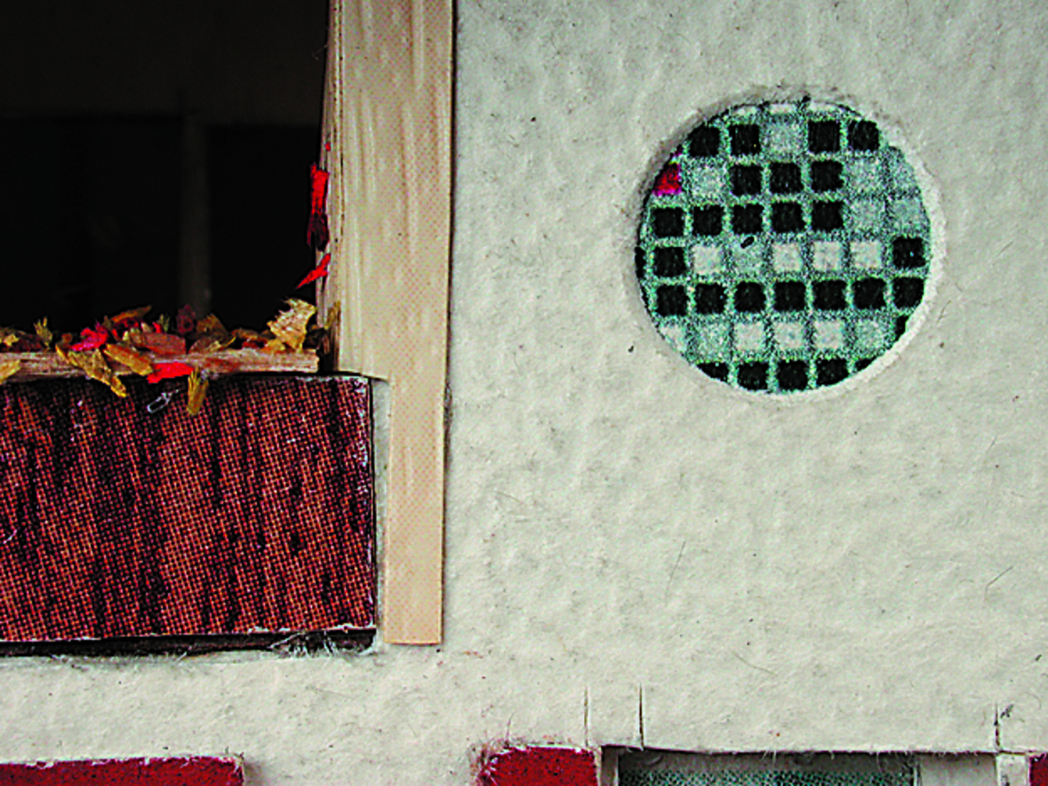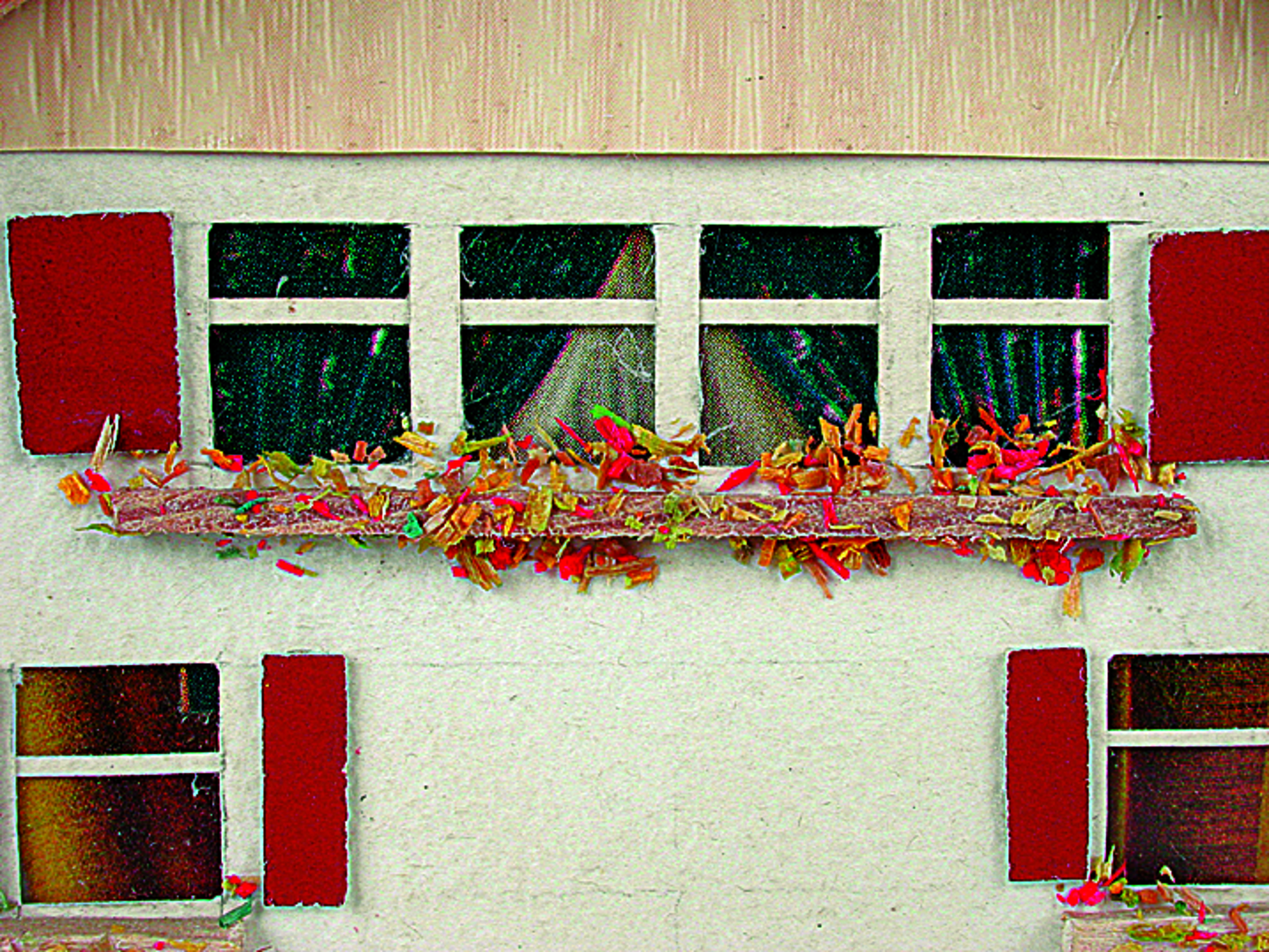 Anmerkung der Redaktion: Nicht von jedem Haus sind alle einzelnen verwendeten Materialien dokumentiert. Tatsächlich verbaute der Bastler auch Zigarettenschachteln, Spinnenpapier, Pappmaschee, Tapetenreste, Bunt- und Silberpapiere, Stoffe, Synthetikfasern, d-c-fix-Folien, Schriftproben, Zeitungsschnipsel und ausgewertete Illustrierte, Kartonagen, Holzabfälle aller Art, Uhu, Holzleim und Tapetenkleister.