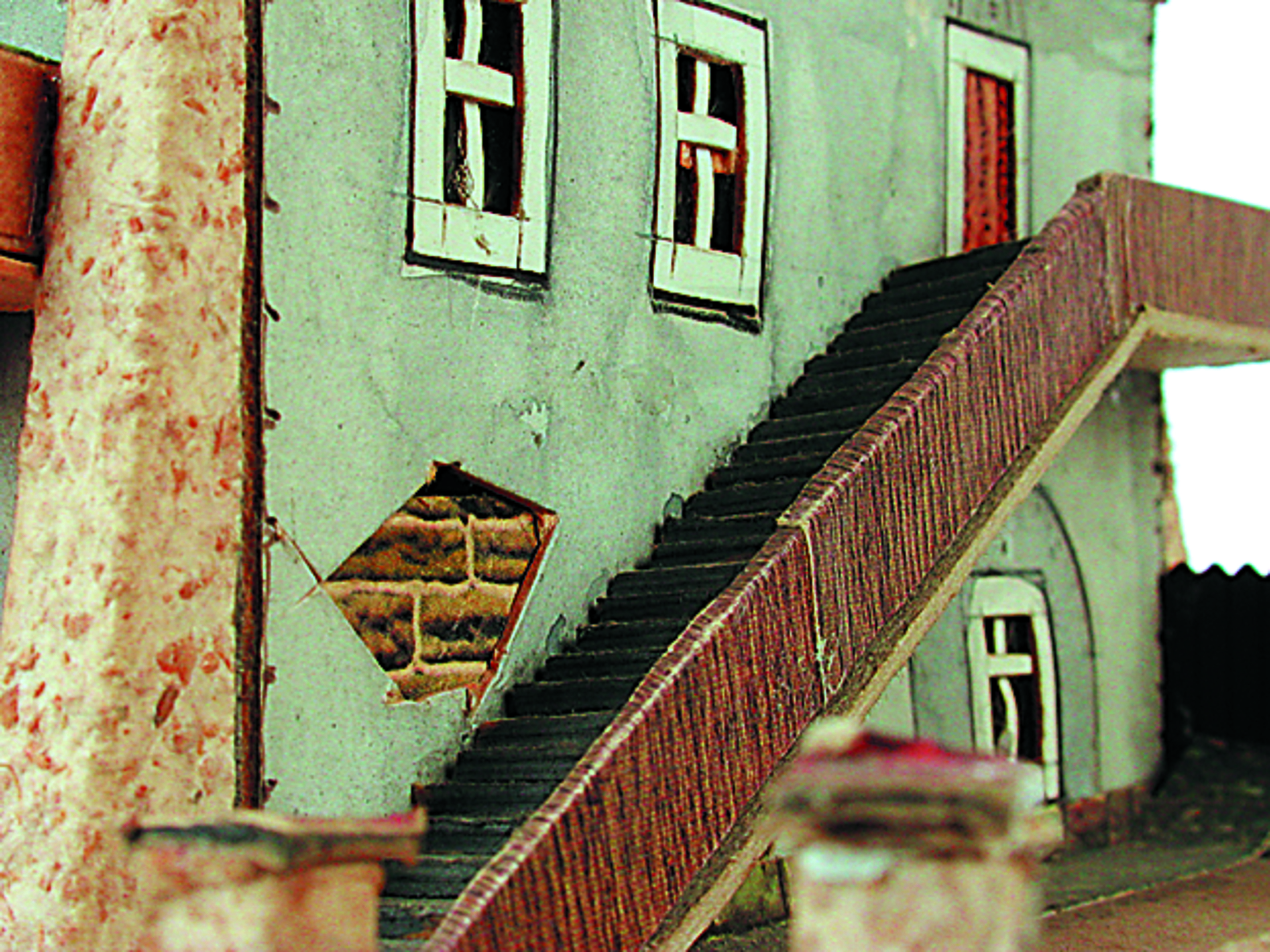 Anmerkung der Redaktion: Nicht von jedem Haus sind alle einzelnen verwendeten Materialien dokumentiert. Tatsächlich verbaute der Bastler auch Zigarettenschachteln, Spinnenpapier, Pappmaschee, Tapetenreste, Bunt- und Silberpapiere, Stoffe, Synthetikfasern, d-c-fix-Folien, Schriftproben, Zeitungsschnipsel und ausgewertete Illustrierte, Kartonagen, Holzabfälle aller Art, Uhu, Holzleim und Tapetenkleister.