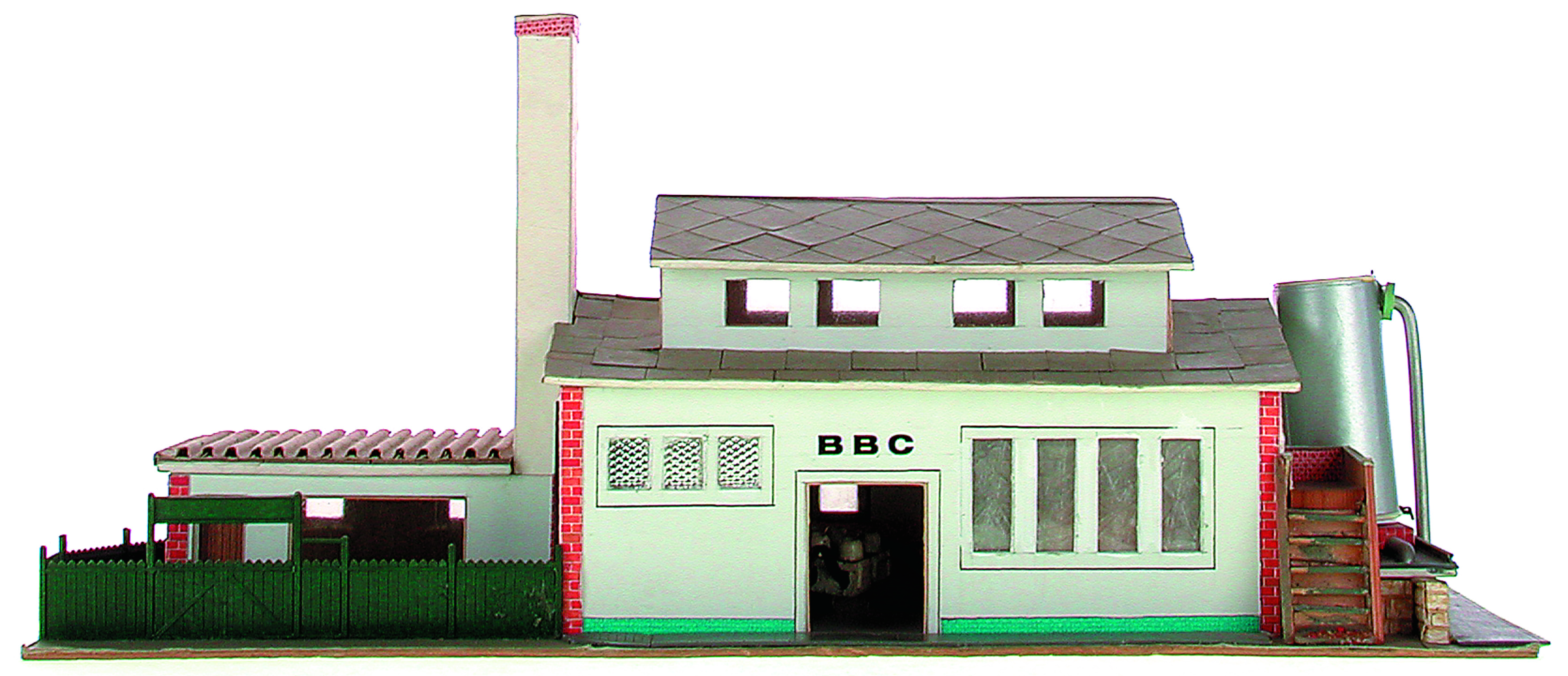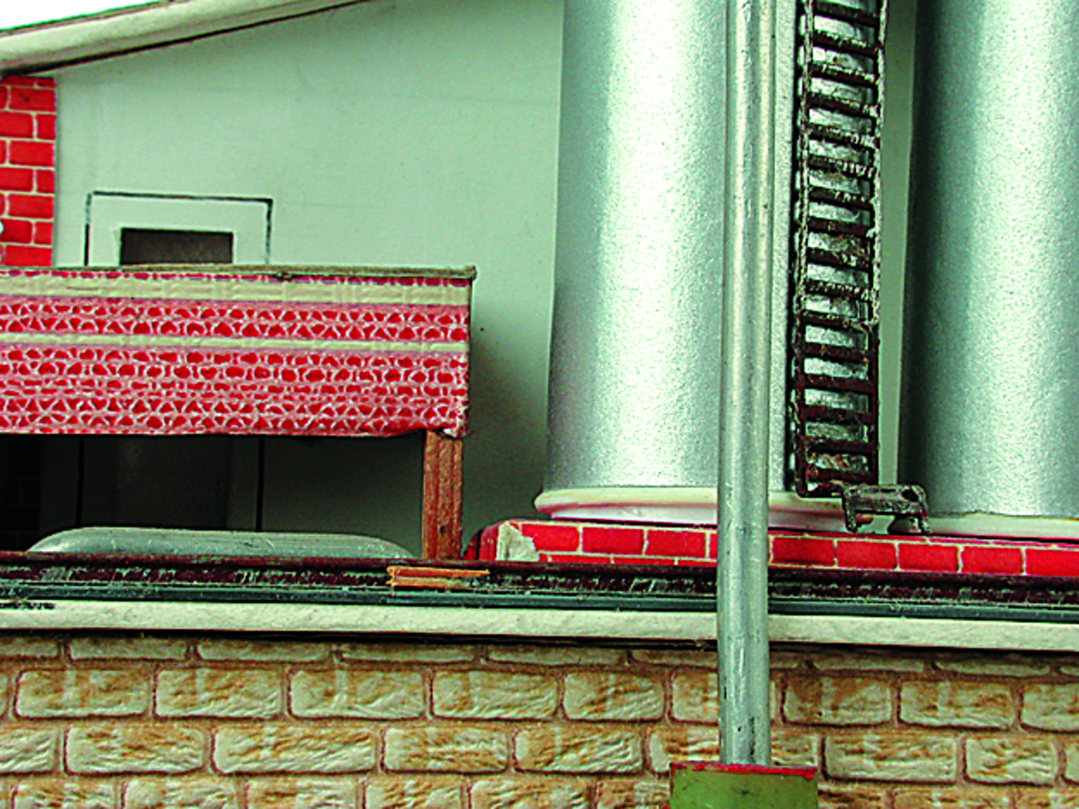 Anmerkung der Redaktion: Nicht von jedem Haus sind alle einzelnen verwendeten Materialien dokumentiert. Tatsächlich verbaute der Bastler auch Zigarettenschachteln, Spinnenpapier, Pappmaschee, Tapetenreste, Bunt- und Silberpapiere, Stoffe, Synthetikfasern, d-c-fix-Folien, Schriftproben, Zeitungsschnipsel und ausgewertete Illustrierte, Kartonagen, Holzabfälle aller Art, Uhu, Holzleim und Tapetenkleister.