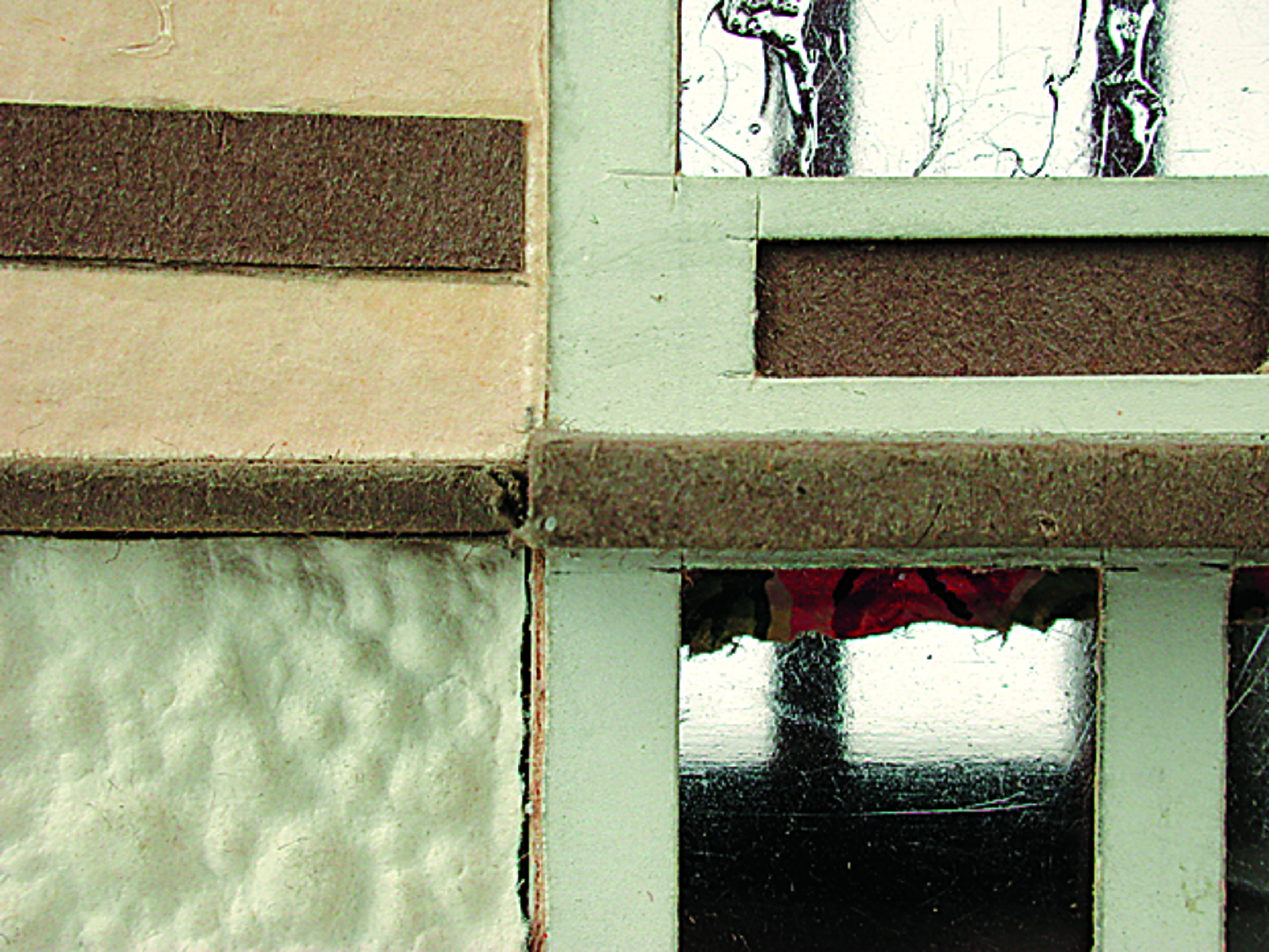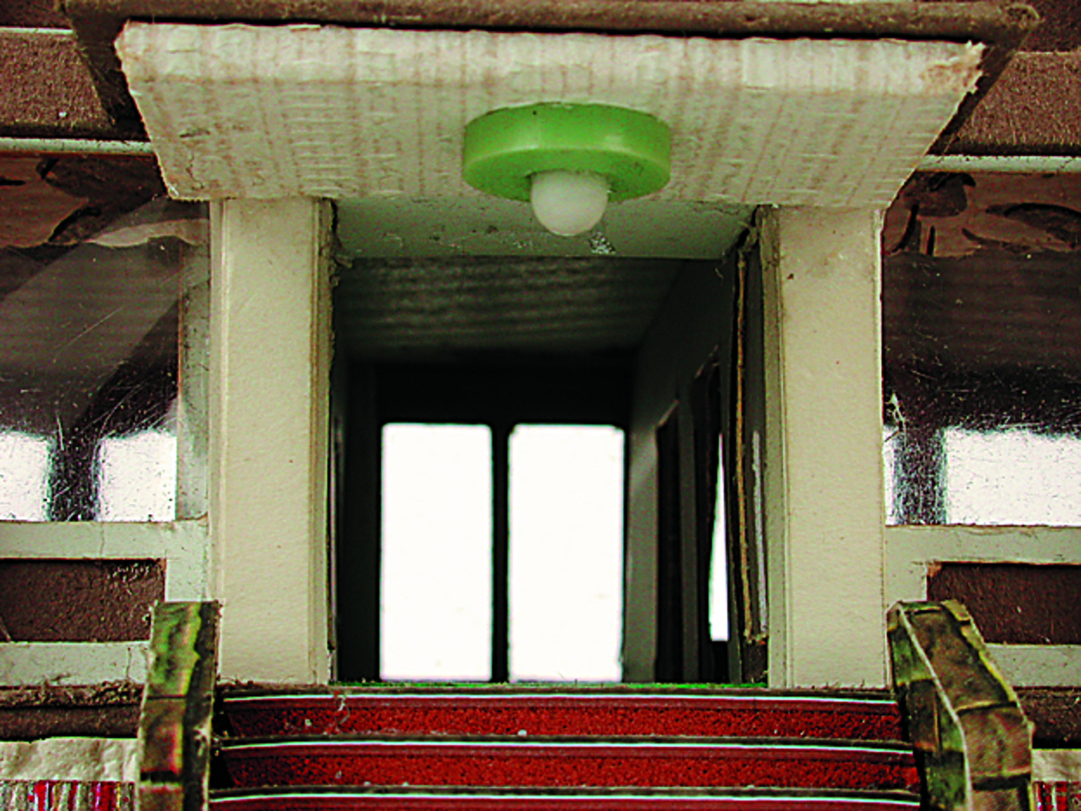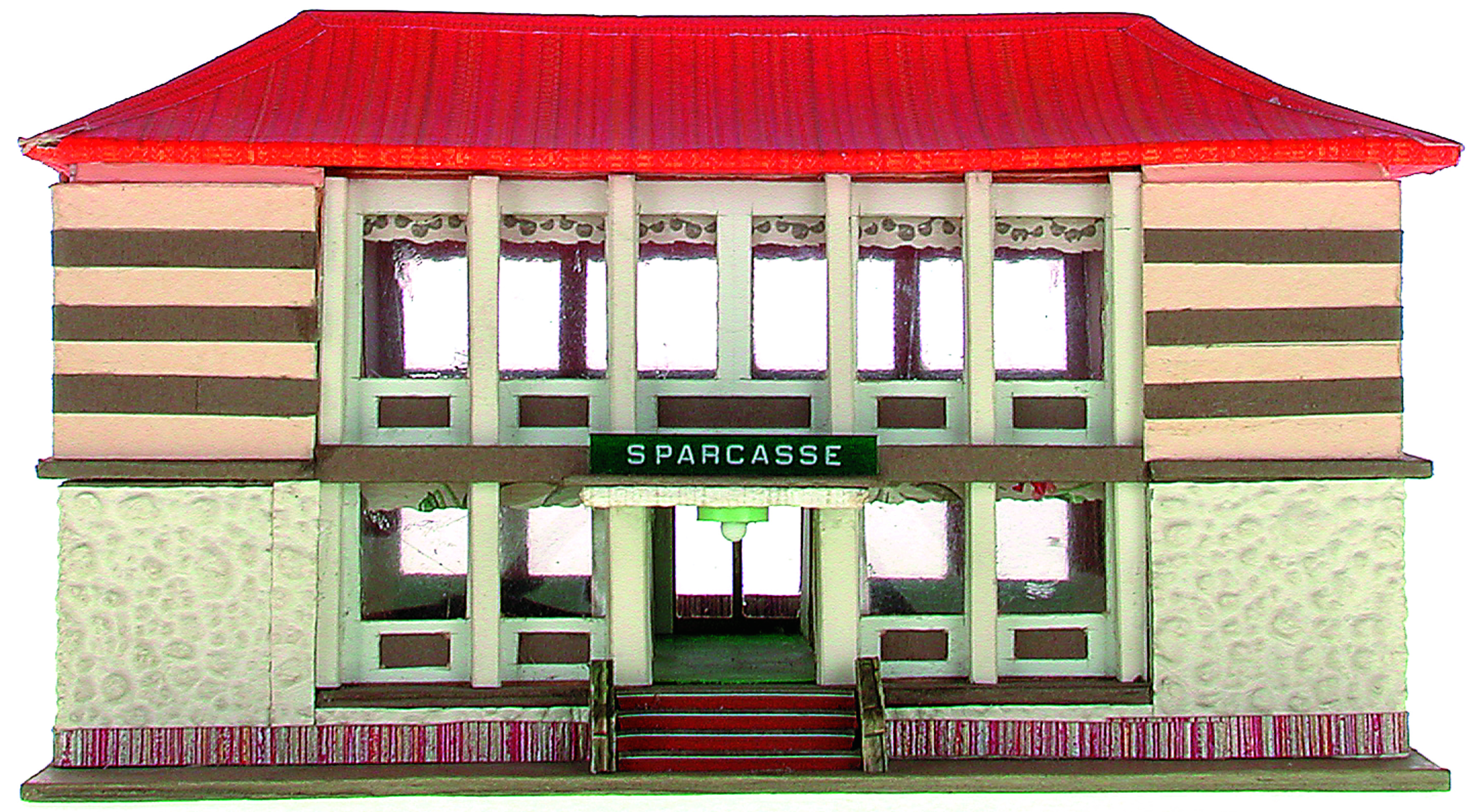 Anmerkung der Redaktion: Nicht von jedem Haus sind alle einzelnen verwendeten Materialien dokumentiert. Tatsächlich verbaute der Bastler auch Zigarettenschachteln, Spinnenpapier, Pappmaschee, Tapetenreste, Bunt- und Silberpapiere, Stoffe, Synthetikfasern, d-c-fix-Folien, Schriftproben, Zeitungsschnipsel und ausgewertete Illustrierte, Kartonagen, Holzabfälle aller Art, Uhu, Holzleim und Tapetenkleister.