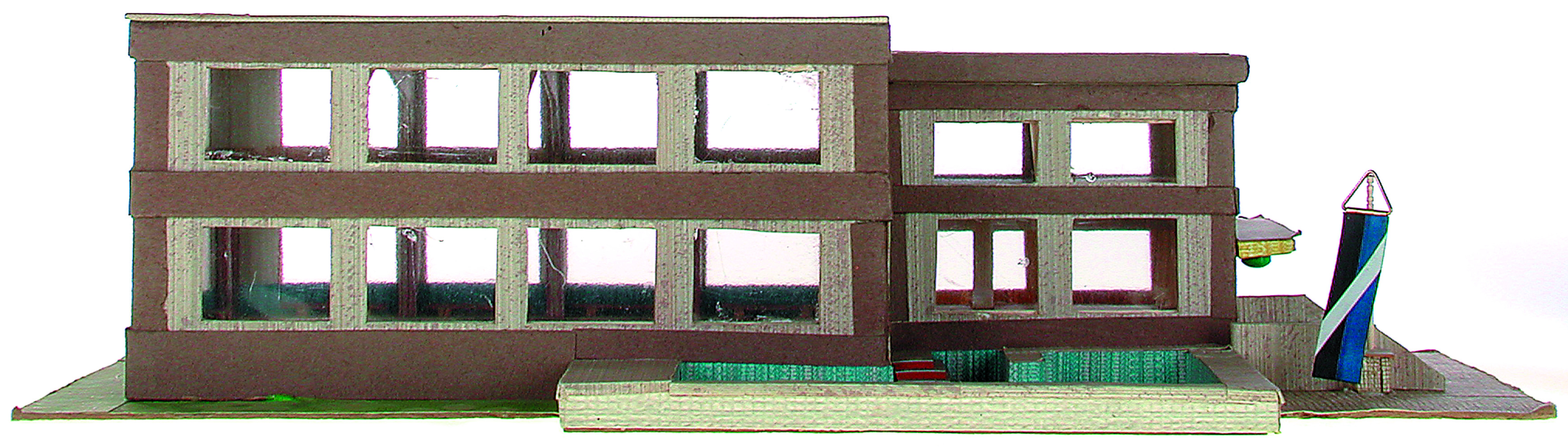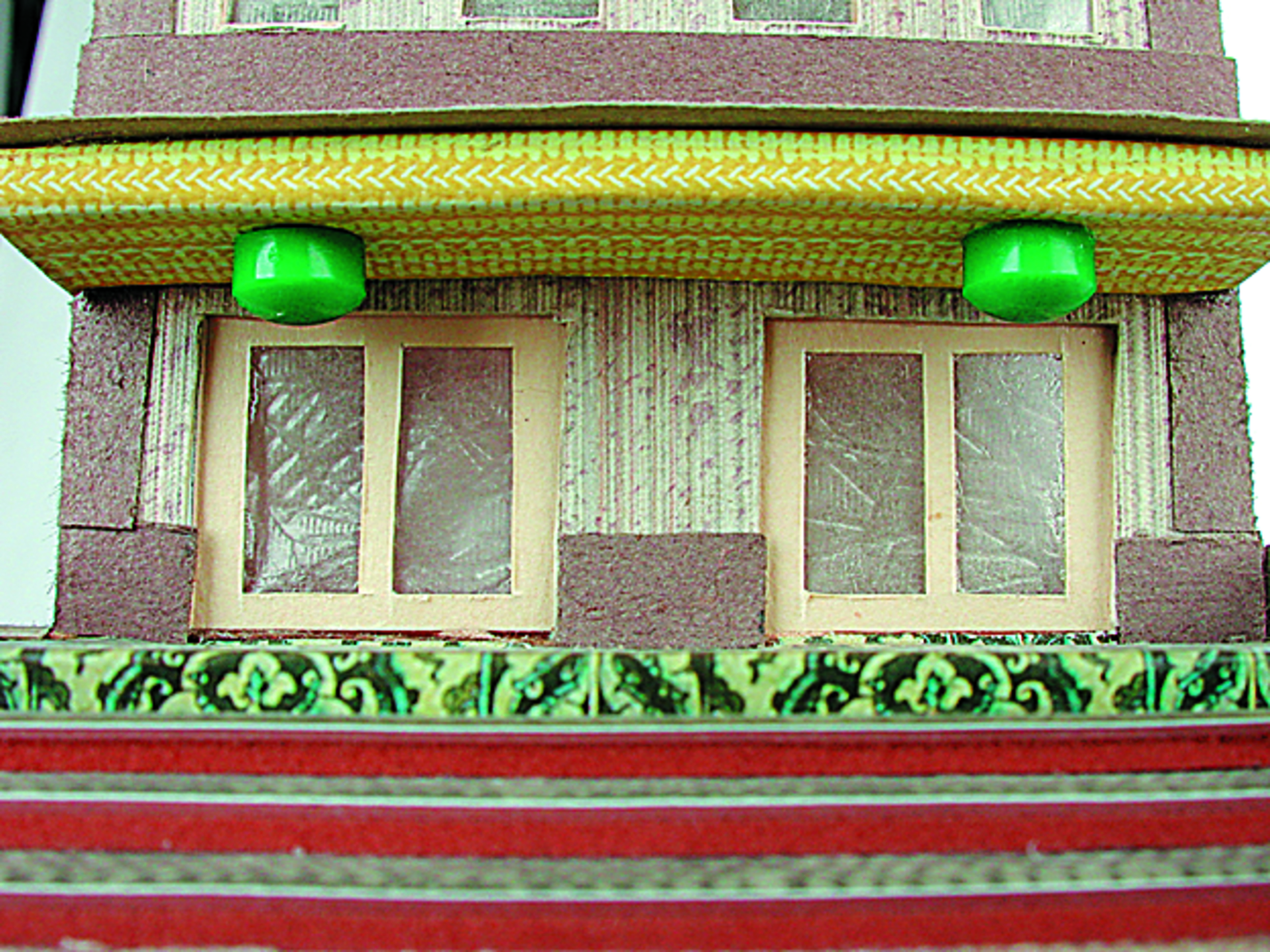 Anmerkung der Redaktion: Nicht von jedem Haus sind alle einzelnen verwendeten Materialien dokumentiert. Tatsächlich verbaute der Bastler auch Zigarettenschachteln, Spinnenpapier, Pappmaschee, Tapetenreste, Bunt- und Silberpapiere, Stoffe, Synthetikfasern, d-c-fix-Folien, Schriftproben, Zeitungsschnipsel und ausgewertete Illustrierte, Kartonagen, Holzabfälle aller Art, Uhu, Holzleim und Tapetenkleister.