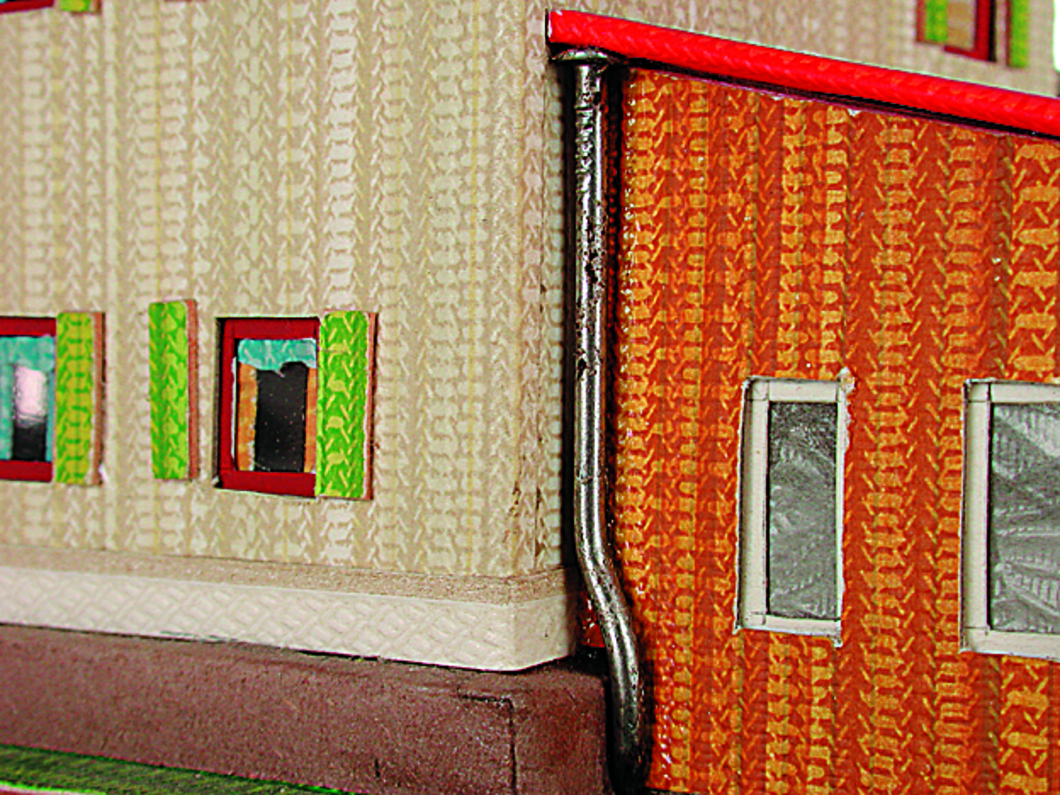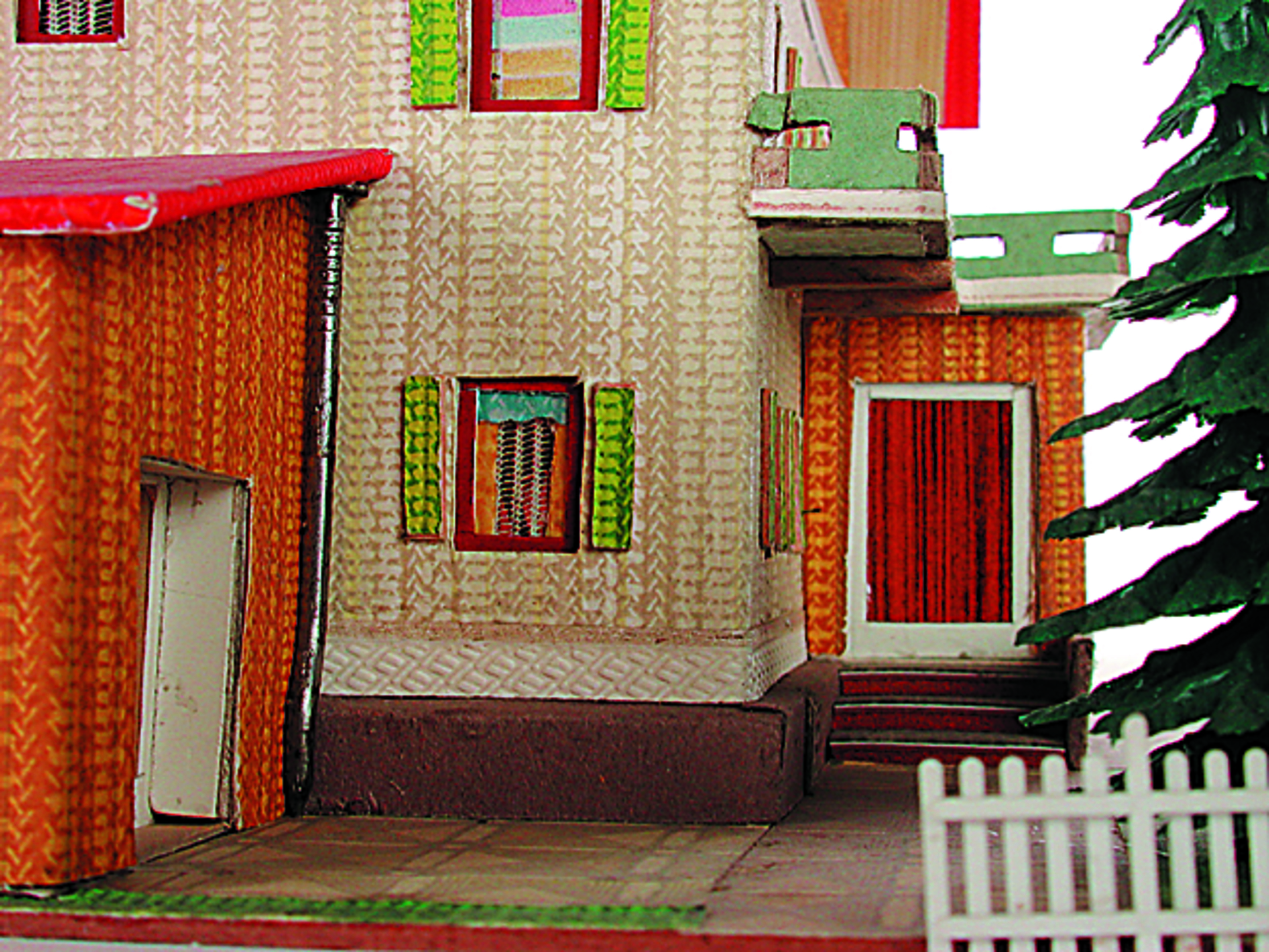Anmerkung der Redaktion: Nicht von jedem Haus sind alle einzelnen verwendeten Materialien dokumentiert. Tatsächlich verbaute der Bastler auch Zigarettenschachteln, Spinnenpapier, Pappmaschee, Tapetenreste, Bunt- und Silberpapiere, Stoffe, Synthetikfasern, d-c-fix-Folien, Schriftproben, Zeitungsschnipsel und ausgewertete Illustrierte, Kartonagen, Holzabfälle aller Art, Uhu, Holzleim und Tapetenkleister.
