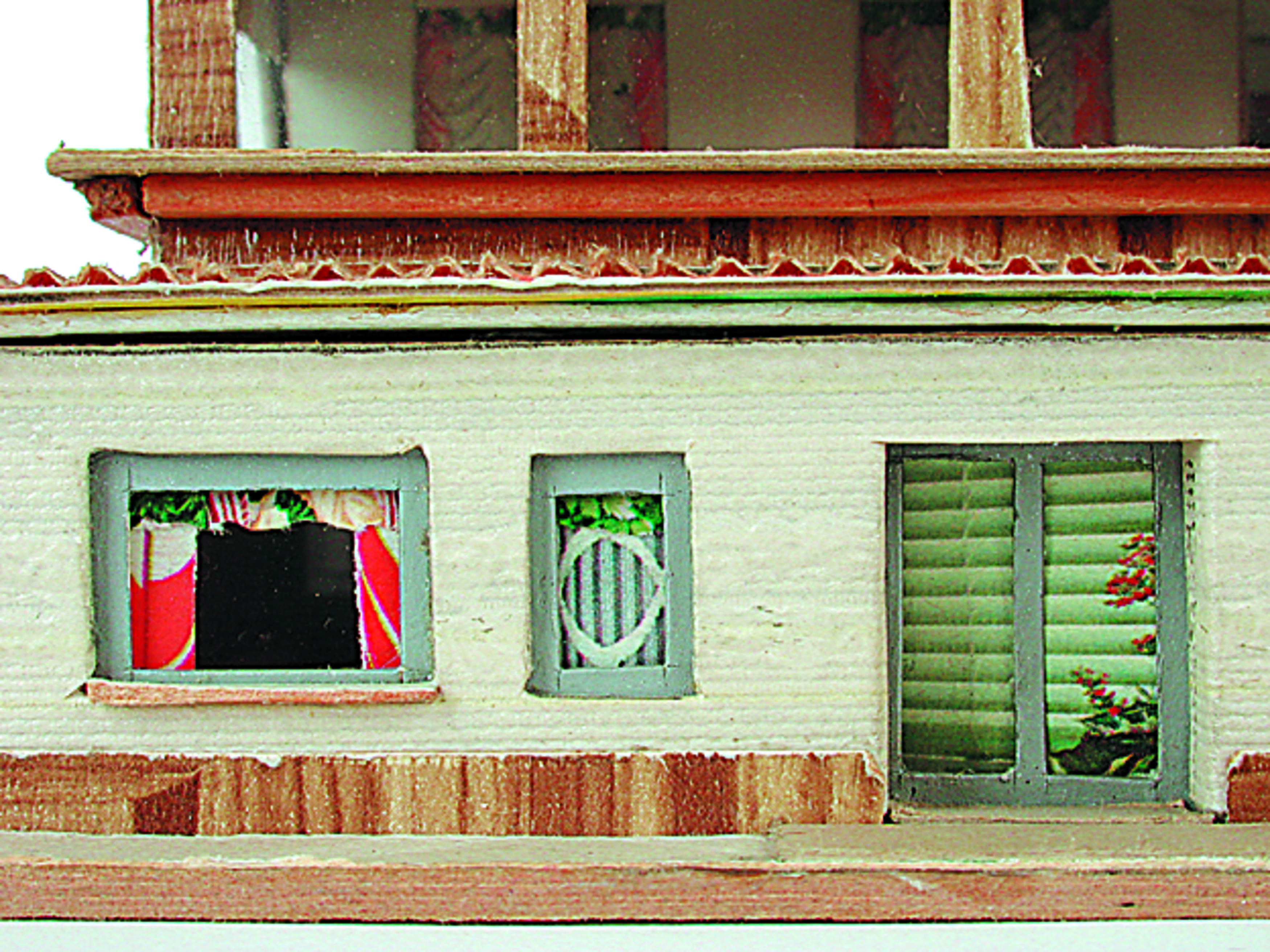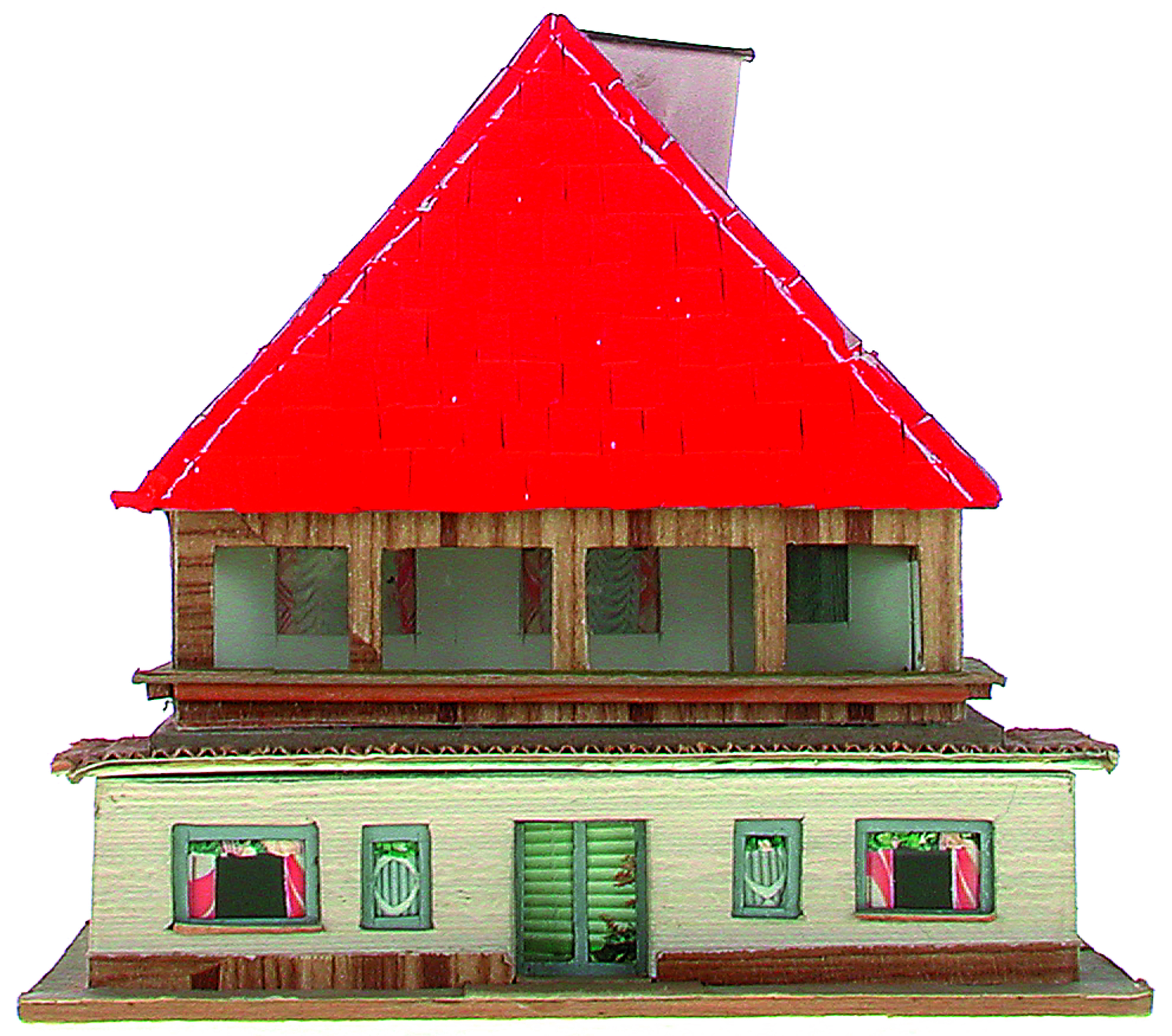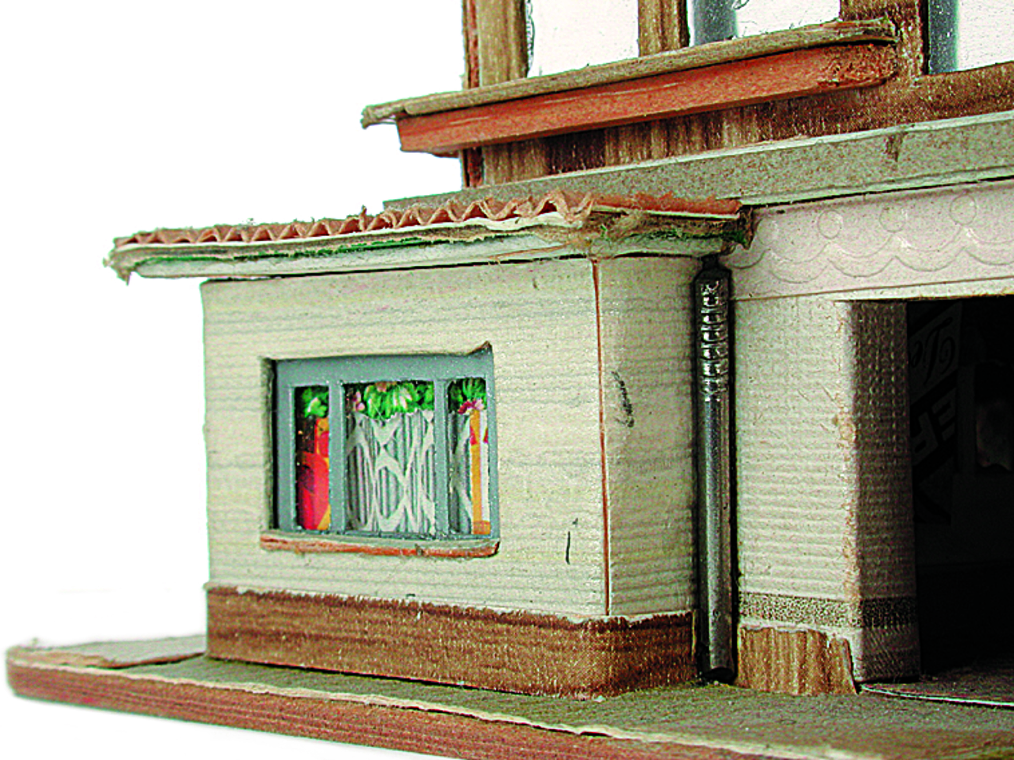 Anmerkung der Redaktion: Nicht von jedem Haus sind alle einzelnen verwendeten Materialien dokumentiert. Tatsächlich verbaute der Bastler auch Zigarettenschachteln, Spinnenpapier, Pappmaschee, Tapetenreste, Bunt- und Silberpapiere, Stoffe, Synthetikfasern, d-c-fix-Folien, Schriftproben, Zeitungsschnipsel und ausgewertete Illustrierte, Kartonagen, Holzabfälle aller Art, Uhu, Holzleim und Tapetenkleister.