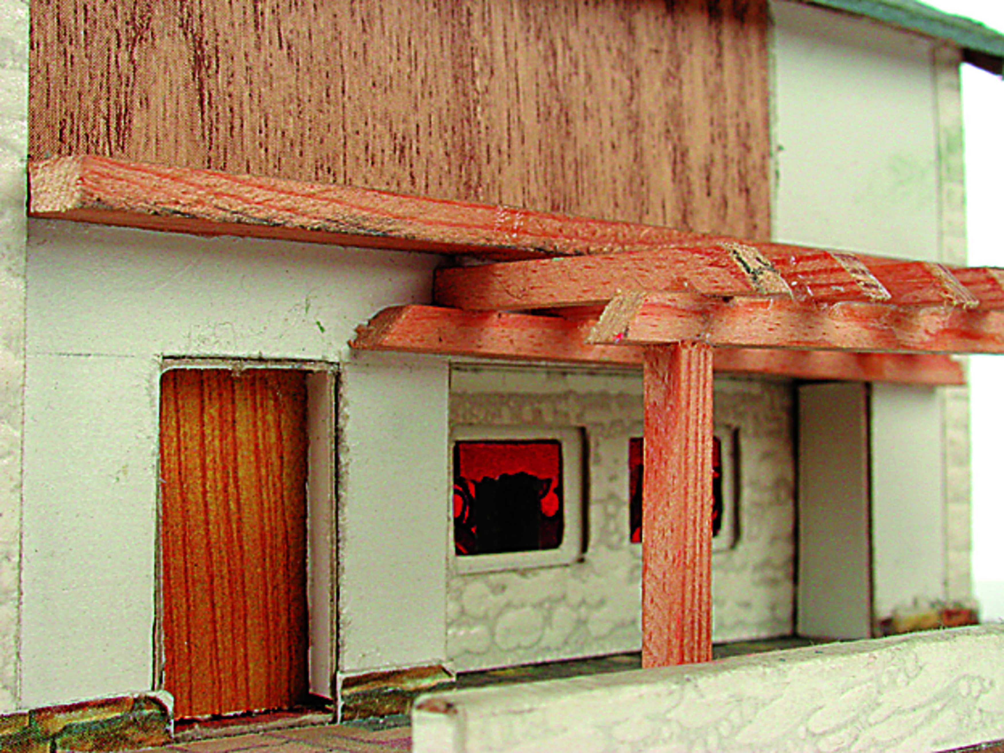 Anmerkung der Redaktion: Nicht von jedem Haus sind alle einzelnen verwendeten Materialien dokumentiert. Tatsächlich verbaute der Bastler auch Zigarettenschachteln, Spinnenpapier, Pappmaschee, Tapetenreste, Bunt- und Silberpapiere, Stoffe, Synthetikfasern, d-c-fix-Folien, Schriftproben, Zeitungsschnipsel und ausgewertete Illustrierte, Kartonagen, Holzabfälle aller Art, Uhu, Holzleim und Tapetenkleister.