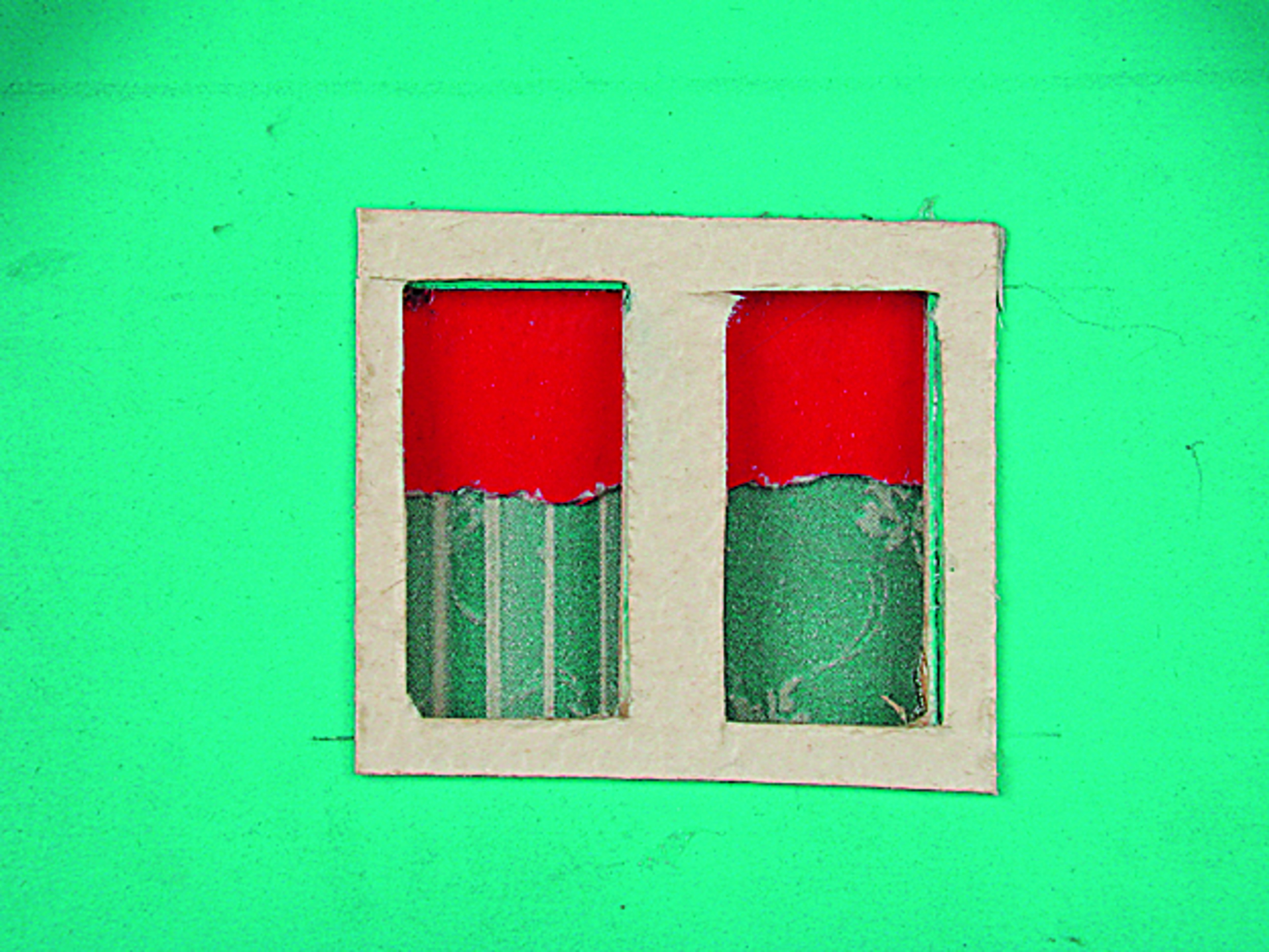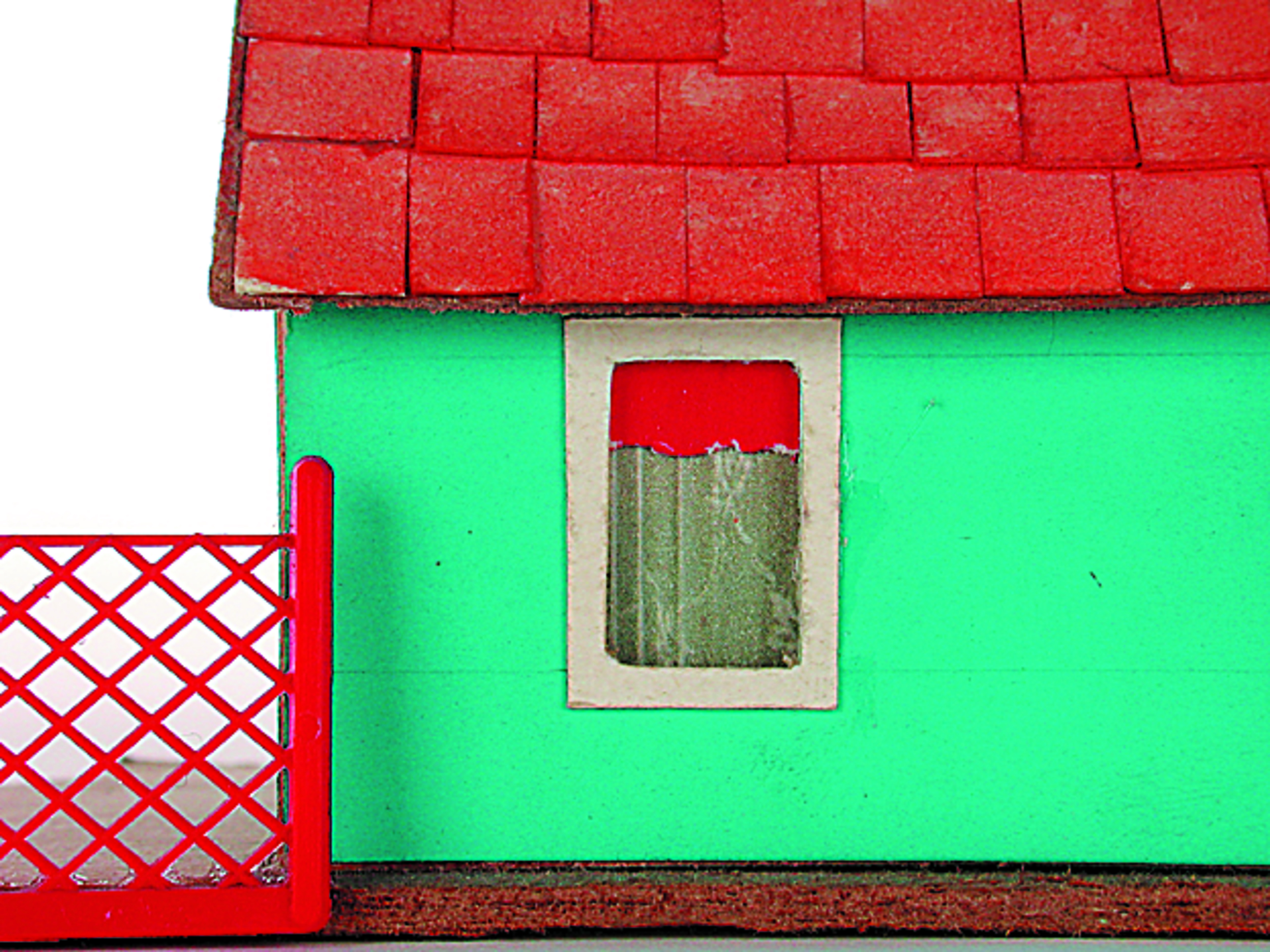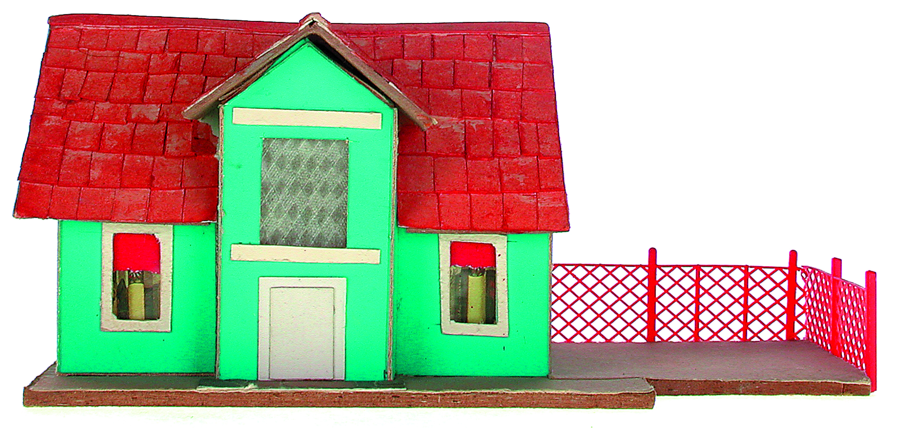 Anmerkung der Redaktion: Nicht von jedem Haus sind alle einzelnen verwendeten Materialien dokumentiert. Tatsächlich verbaute der Bastler auch Zigarettenschachteln, Spinnenpapier, Pappmaschee, Tapetenreste, Bunt- und Silberpapiere, Stoffe, Synthetikfasern, d-c-fix-Folien, Schriftproben, Zeitungsschnipsel und ausgewertete Illustrierte, Kartonagen, Holzabfälle aller Art, Uhu, Holzleim und Tapetenkleister.