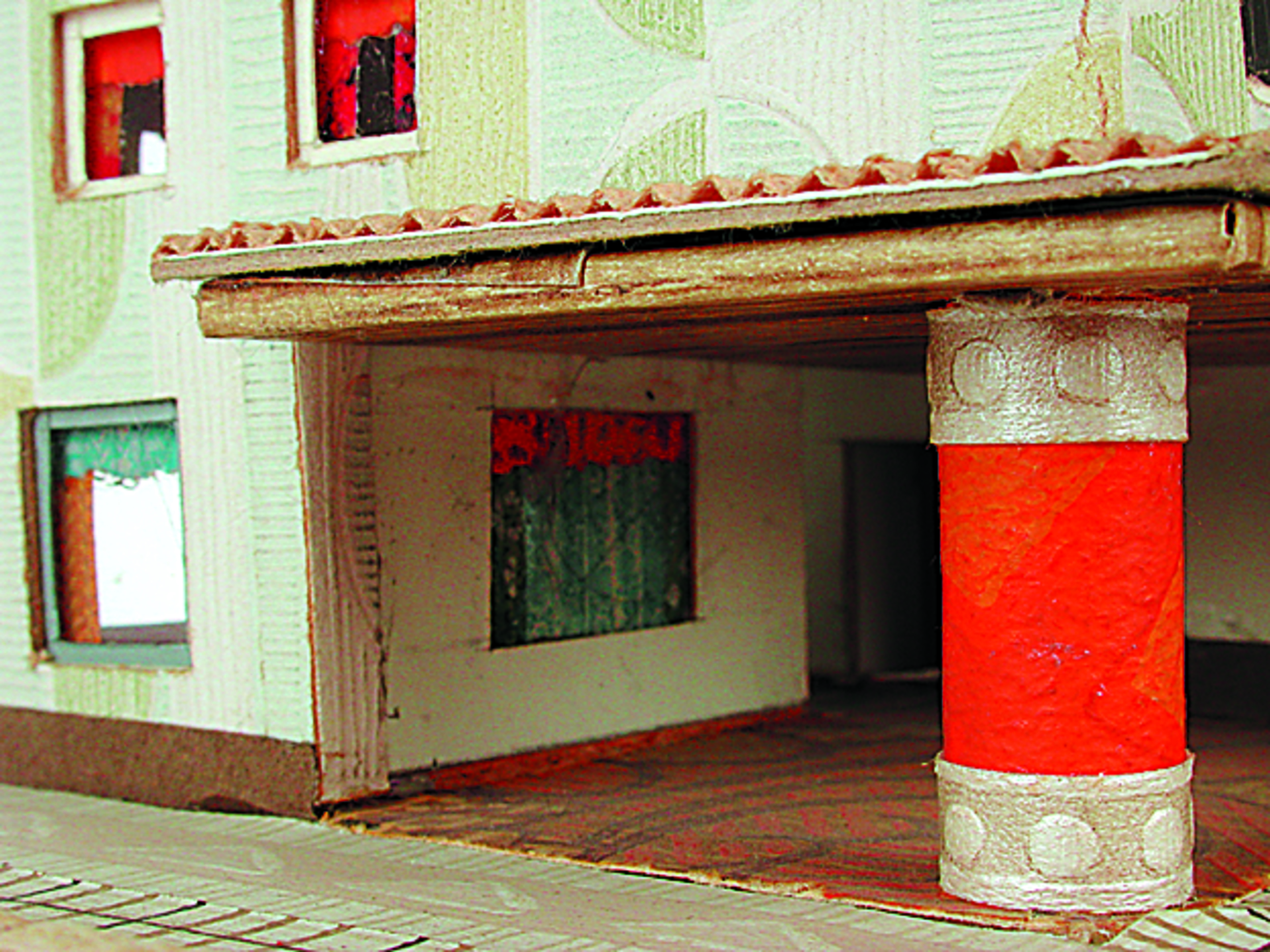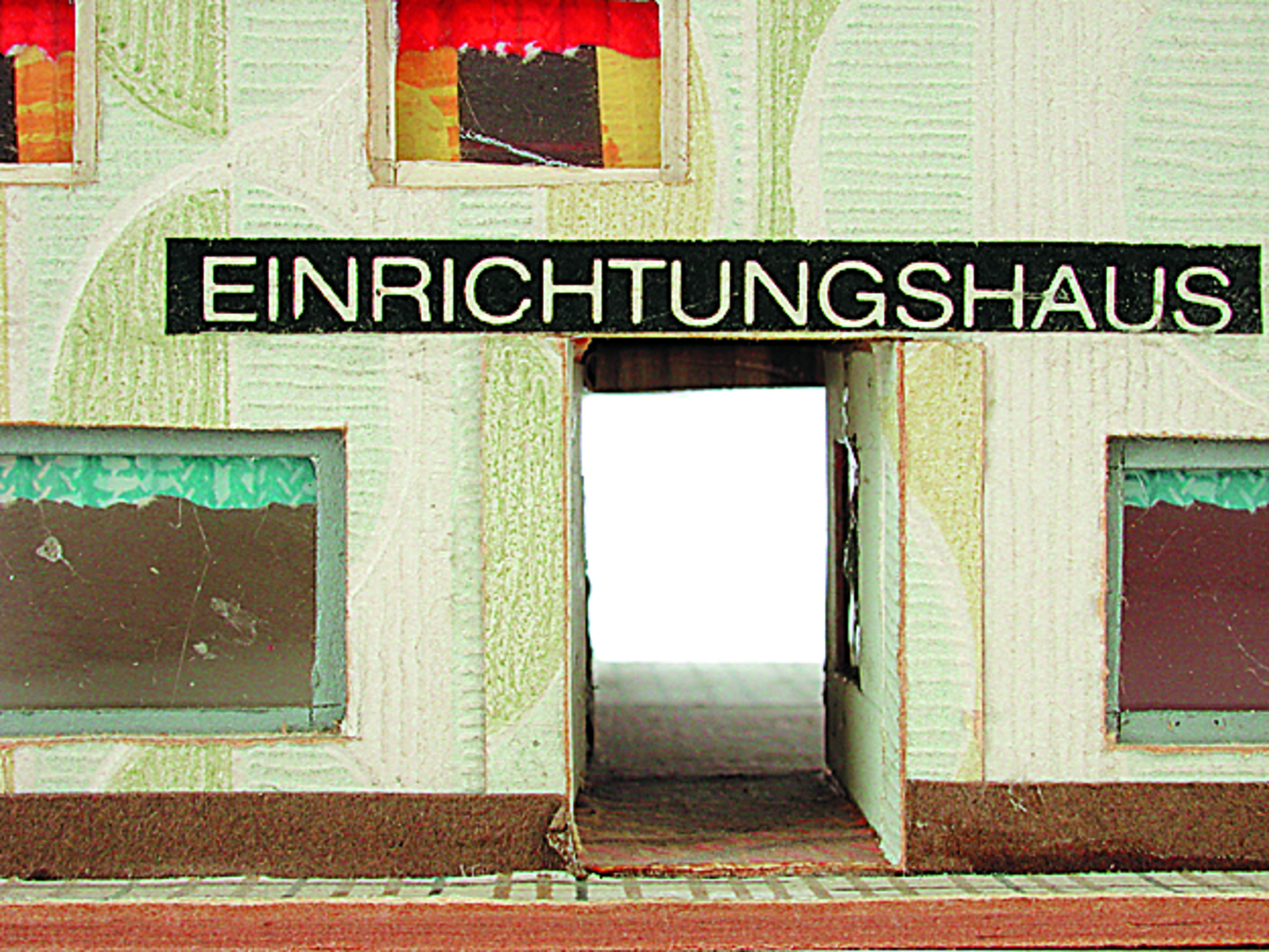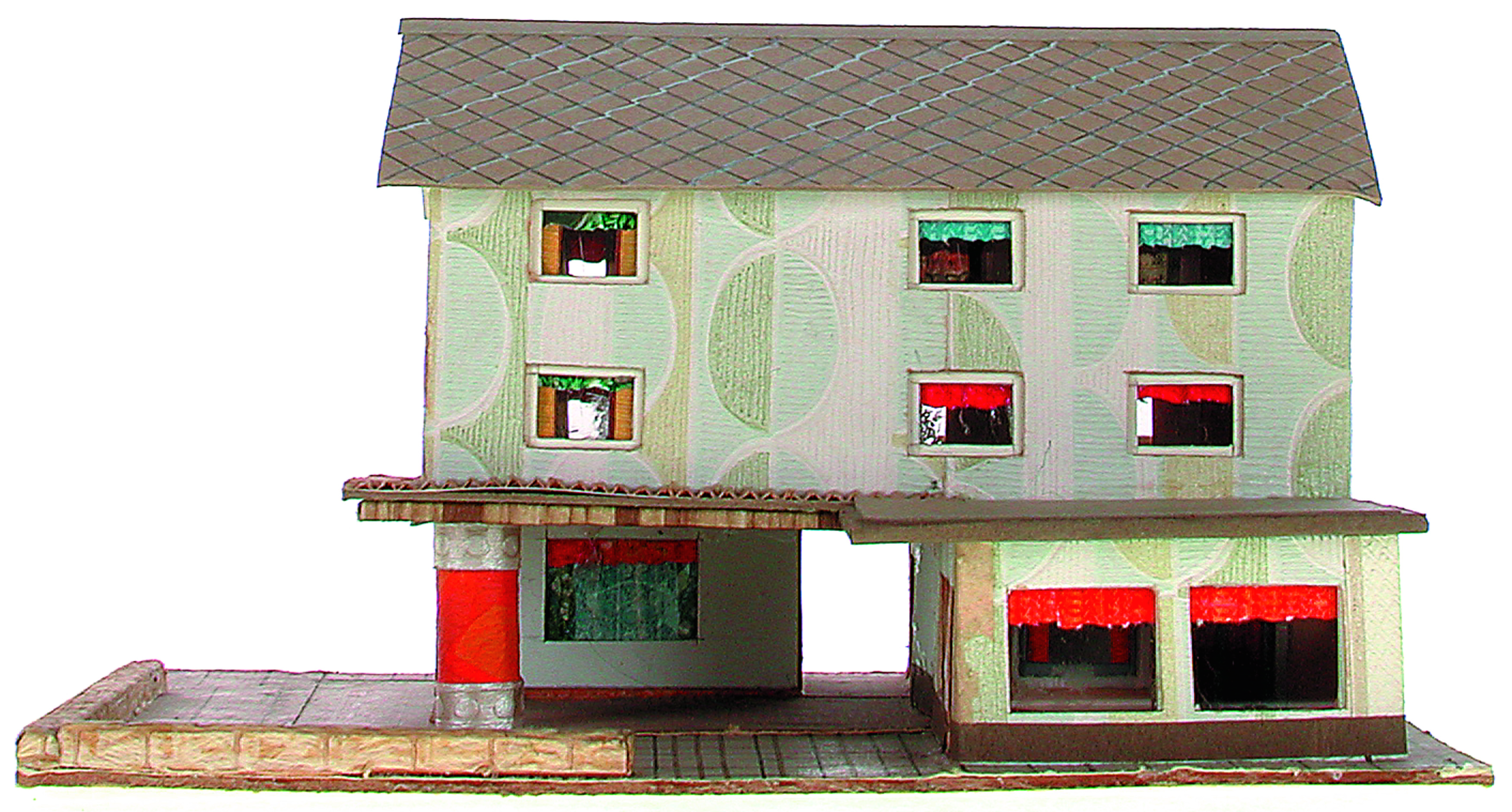Anmerkung der Redaktion: Nicht von jedem Haus sind alle einzelnen verwendeten Materialien dokumentiert. Tatsächlich verbaute der Bastler auch Zigarettenschachteln, Spinnenpapier, Pappmaschee, Tapetenreste, Bunt- und Silberpapiere, Stoffe, Synthetikfasern, d-c-fix-Folien, Schriftproben, Zeitungsschnipsel und ausgewertete Illustrierte, Kartonagen, Holzabfälle aller Art, Uhu, Holzleim und Tapetenkleister.
