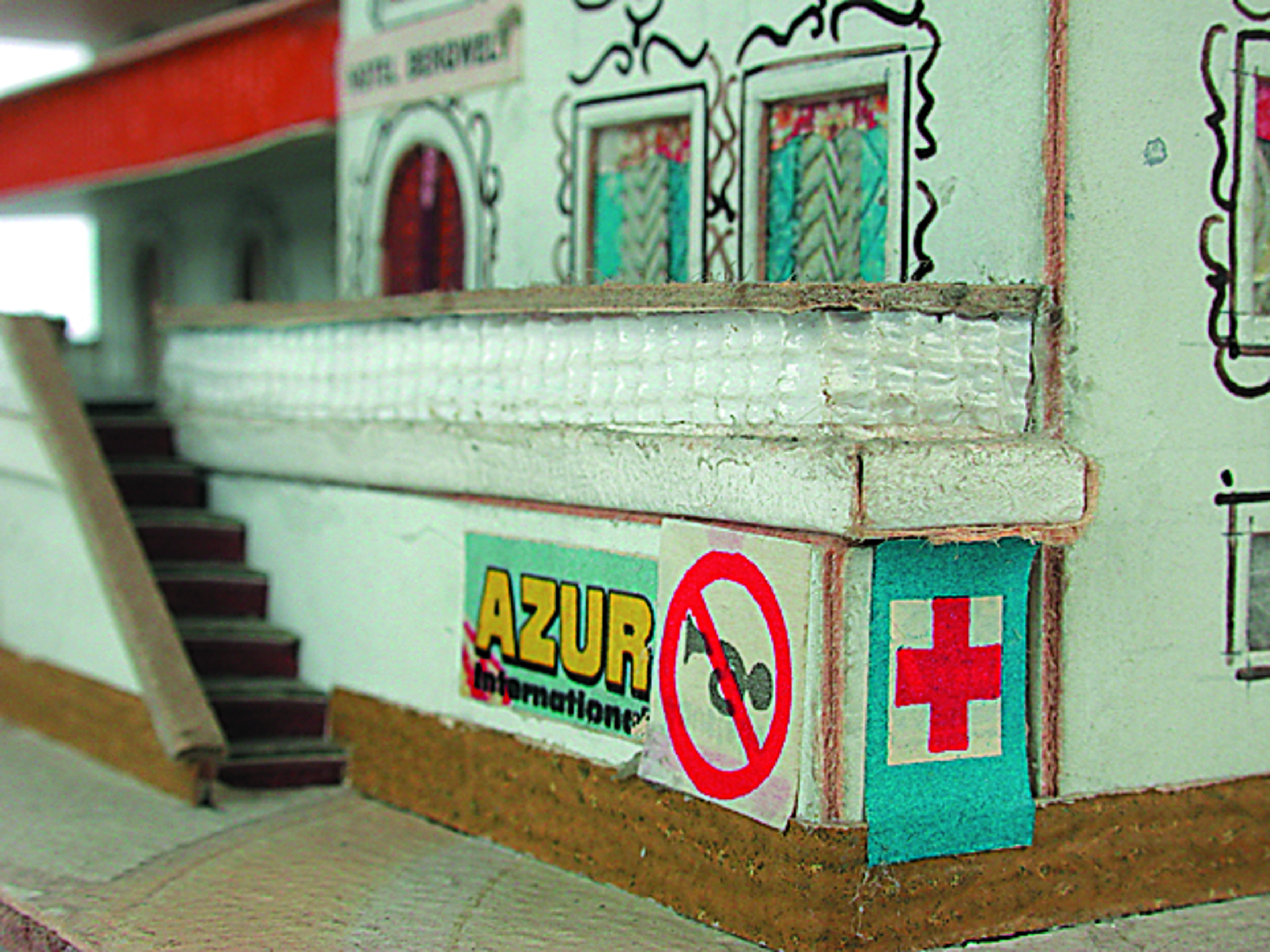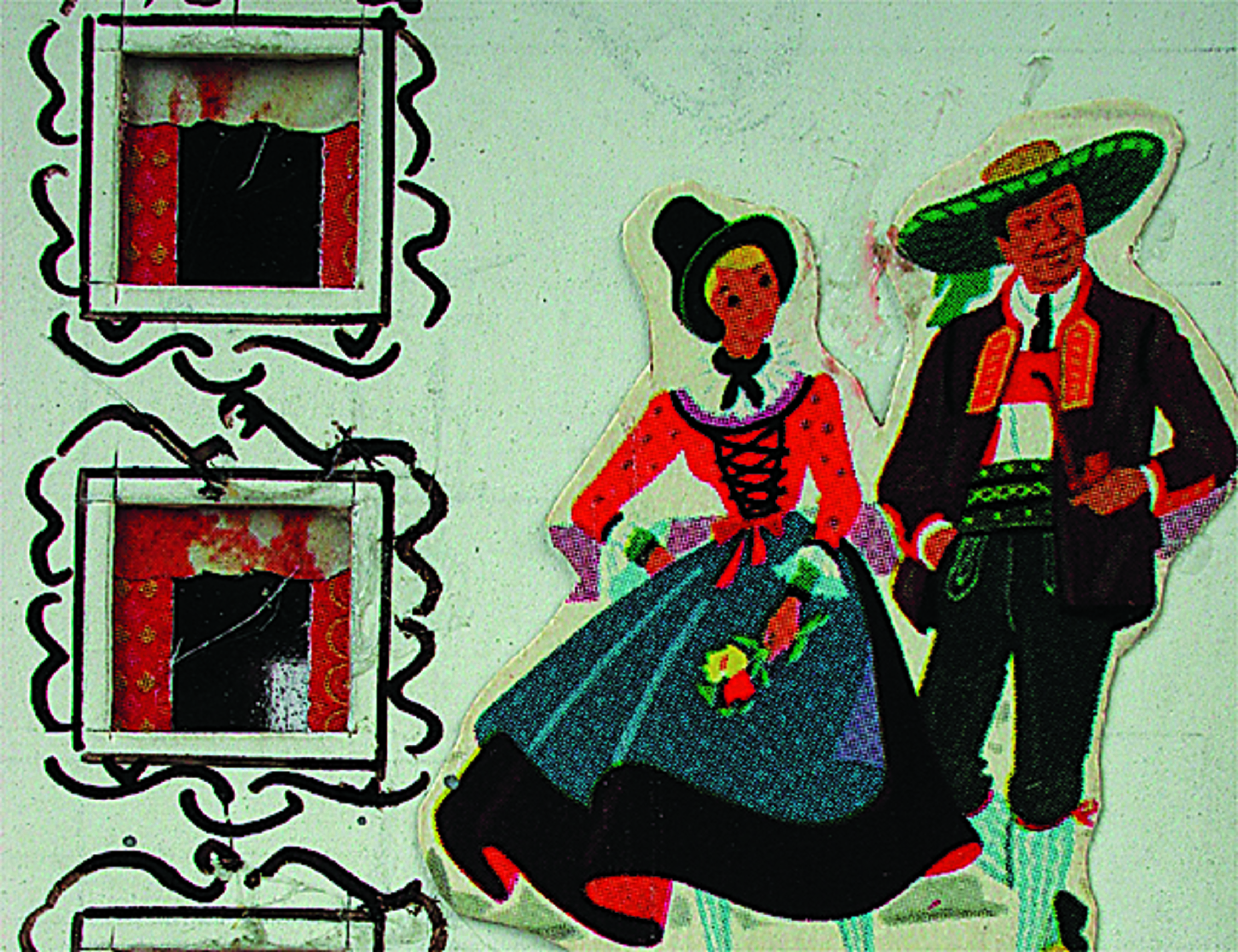 Anmerkung der Redaktion: Nicht von jedem Haus sind alle einzelnen verwendeten Materialien dokumentiert. Tatsächlich verbaute der Bastler auch Zigarettenschachteln, Spinnenpapier, Pappmaschee, Tapetenreste, Bunt- und Silberpapiere, Stoffe, Synthetikfasern, d-c-fix-Folien, Schriftproben, Zeitungsschnipsel und ausgewertete Illustrierte, Kartonagen, Holzabfälle aller Art, Uhu, Holzleim und Tapetenkleister.