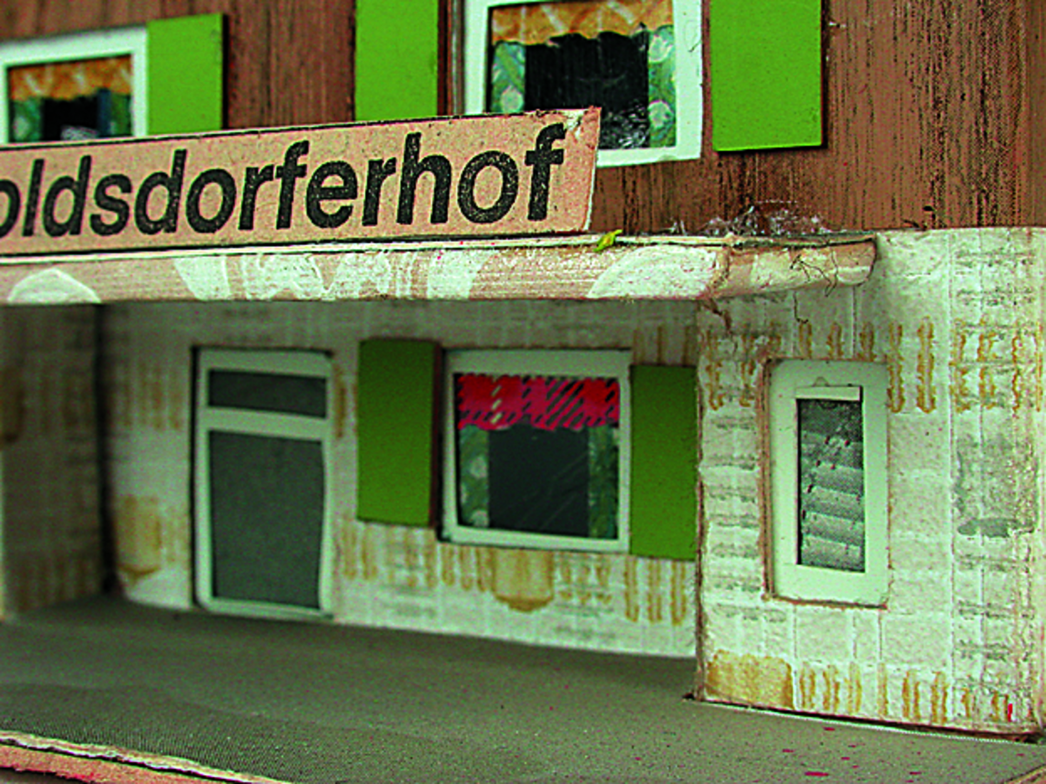 Anmerkung der Redaktion: Nicht von jedem Haus sind alle einzelnen verwendeten Materialien dokumentiert. Tatsächlich verbaute der Bastler auch Zigarettenschachteln, Spinnenpapier, Pappmaschee, Tapetenreste, Bunt- und Silberpapiere, Stoffe, Synthetikfasern, d-c-fix-Folien, Schriftproben, Zeitungsschnipsel und ausgewertete Illustrierte, Kartonagen, Holzabfälle aller Art, Uhu, Holzleim und Tapetenkleister.