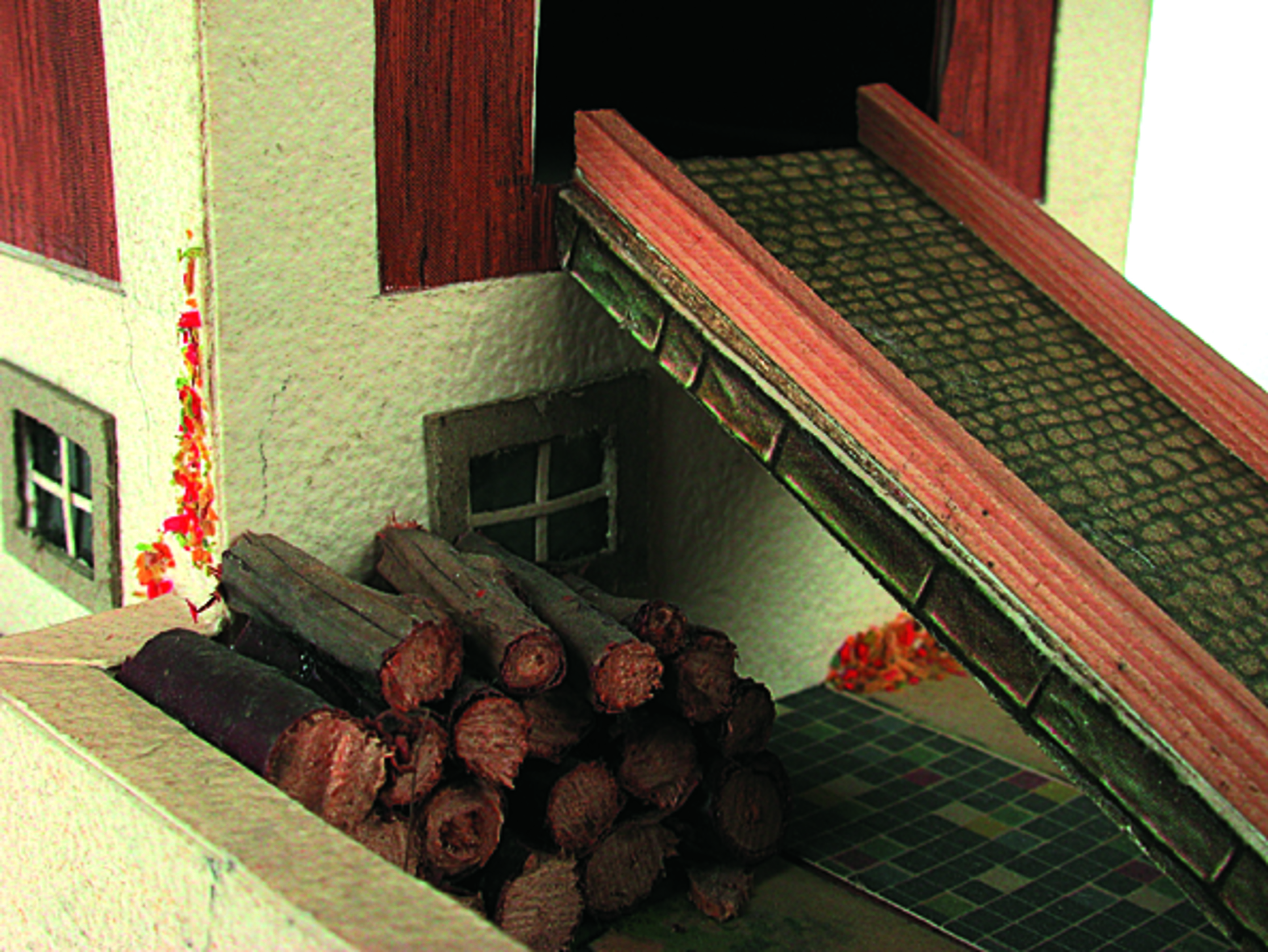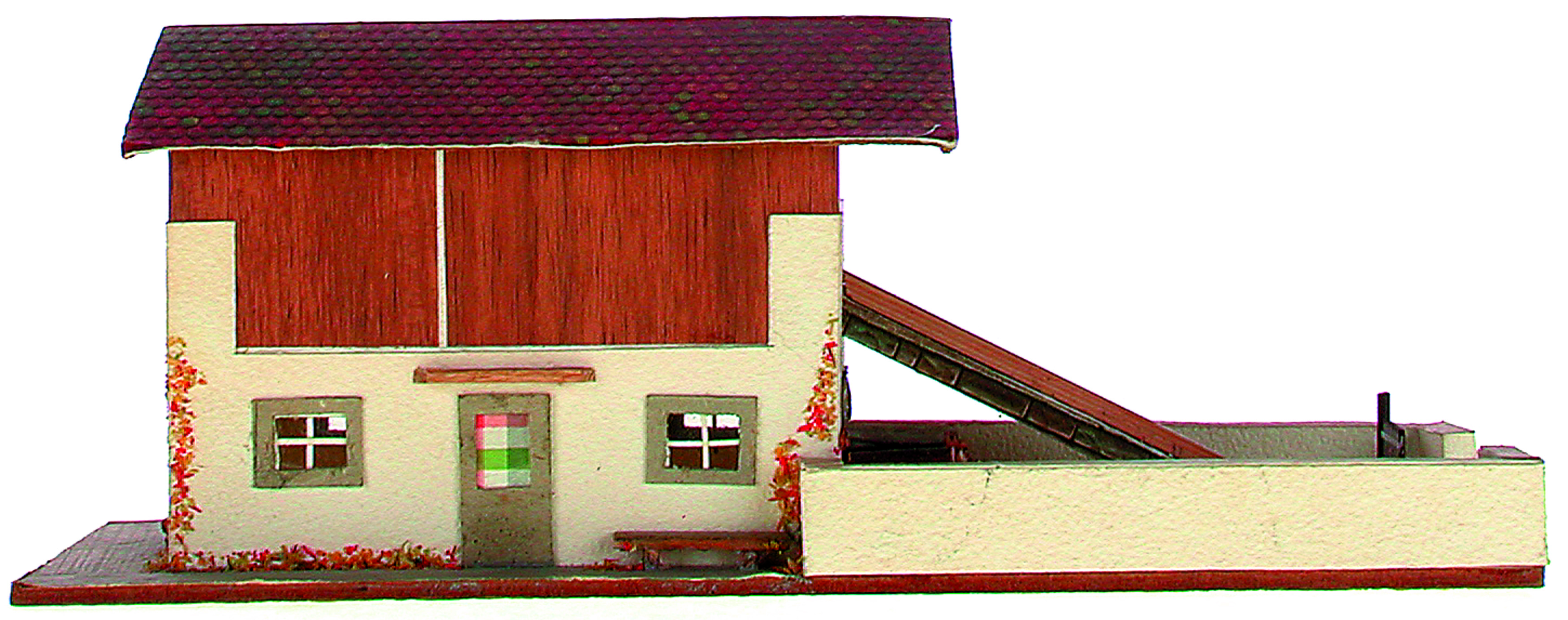 Anmerkung der Redaktion: Nicht von jedem Haus sind alle einzelnen verwendeten Materialien dokumentiert. Tatsächlich verbaute der Bastler auch Zigarettenschachteln, Spinnenpapier, Pappmaschee, Tapetenreste, Bunt- und Silberpapiere, Stoffe, Synthetikfasern, d-c-fix-Folien, Schriftproben, Zeitungsschnipsel und ausgewertete Illustrierte, Kartonagen, Holzabfälle aller Art, Uhu, Holzleim und Tapetenkleister.
