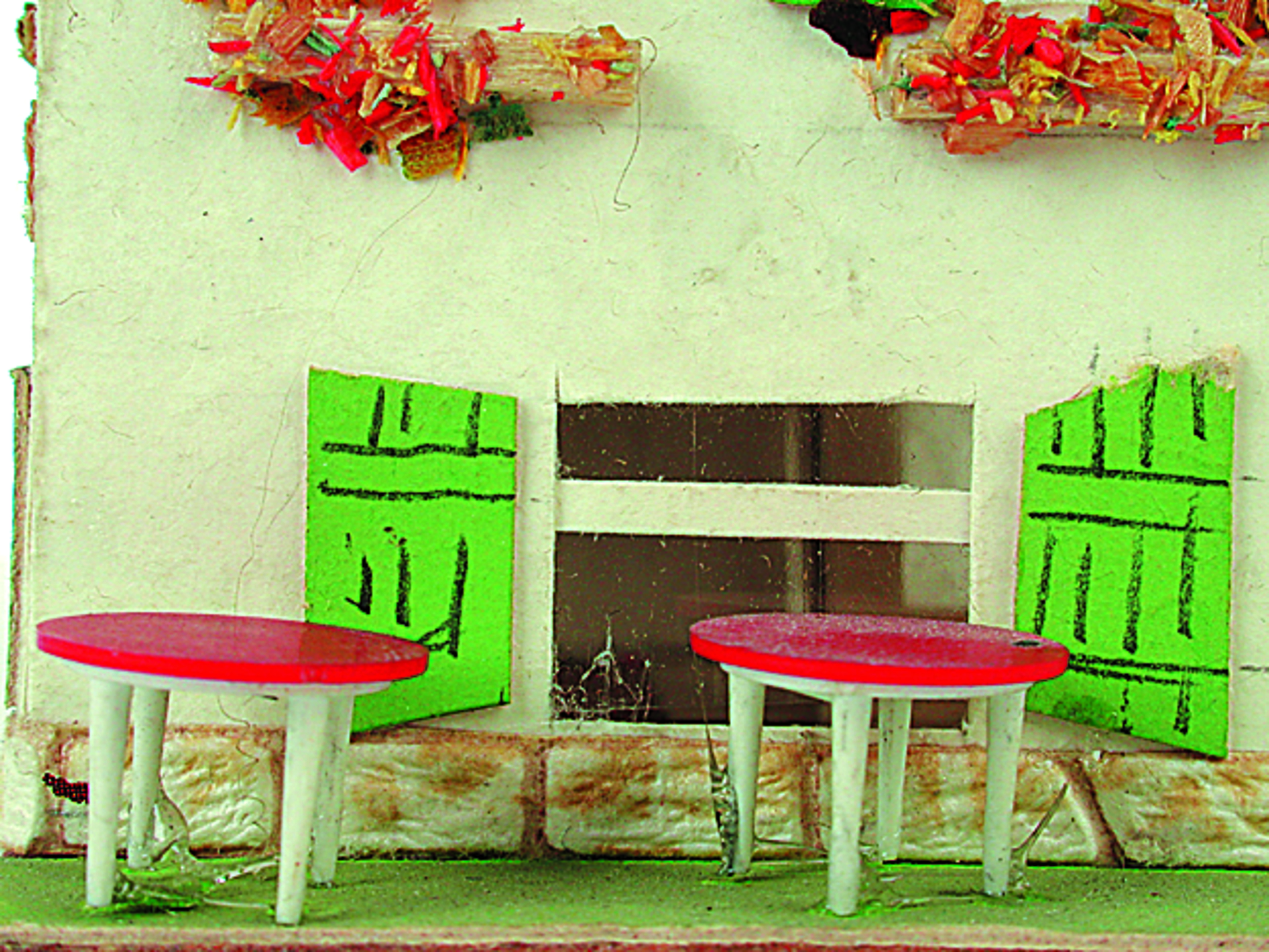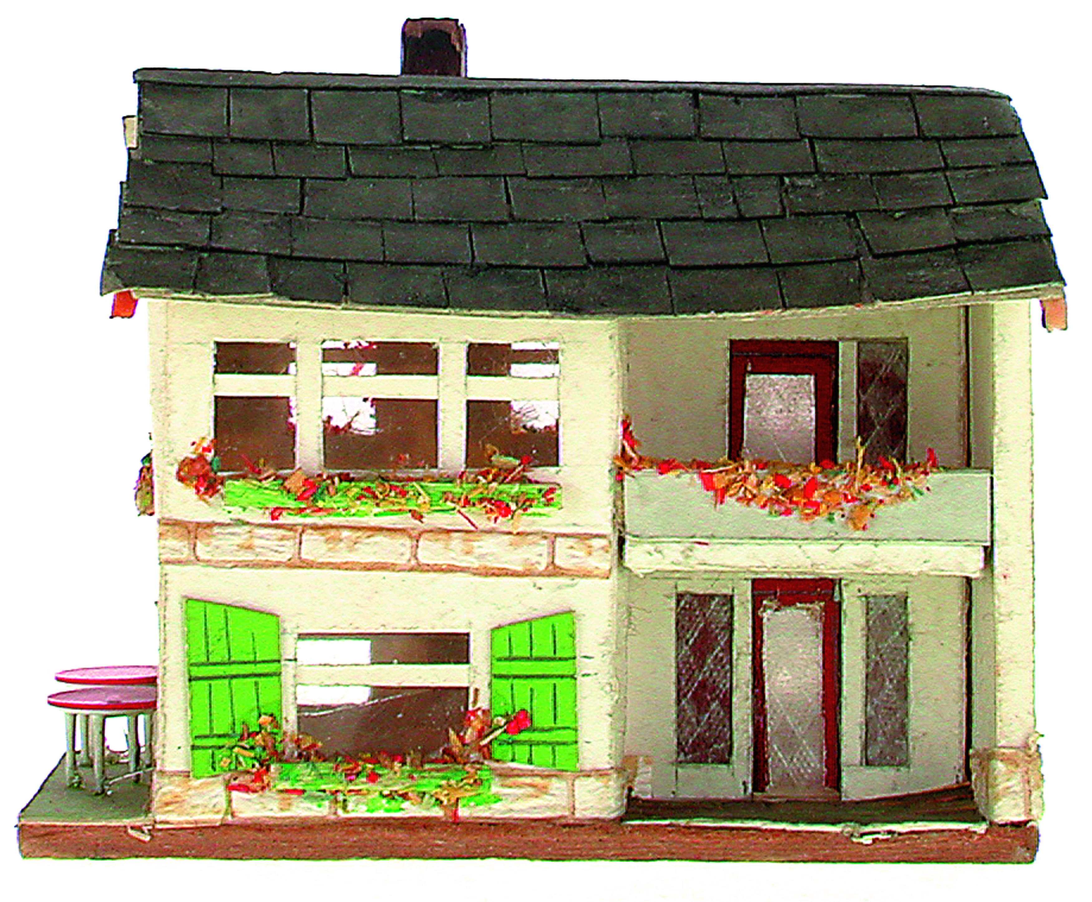 Anmerkung der Redaktion: Nicht von jedem Haus sind alle einzelnen verwendeten Materialien dokumentiert. Tatsächlich verbaute der Bastler auch Zigarettenschachteln, Spinnenpapier, Pappmaschee, Tapetenreste, Bunt- und Silberpapiere, Stoffe, Synthetikfasern, d-c-fix-Folien, Schriftproben, Zeitungsschnipsel und ausgewertete Illustrierte, Kartonagen, Holzabfälle aller Art, Uhu, Holzleim und Tapetenkleister.