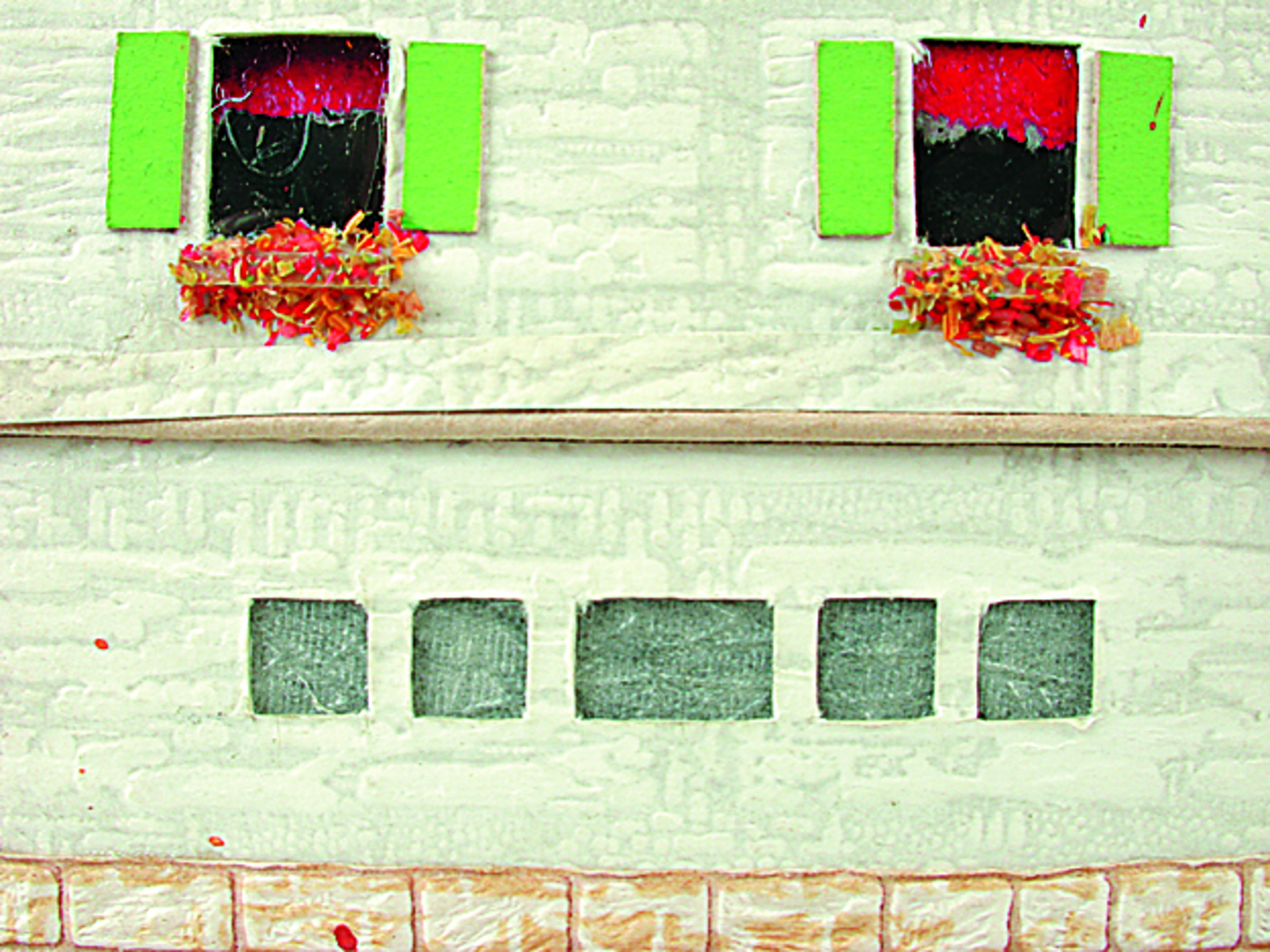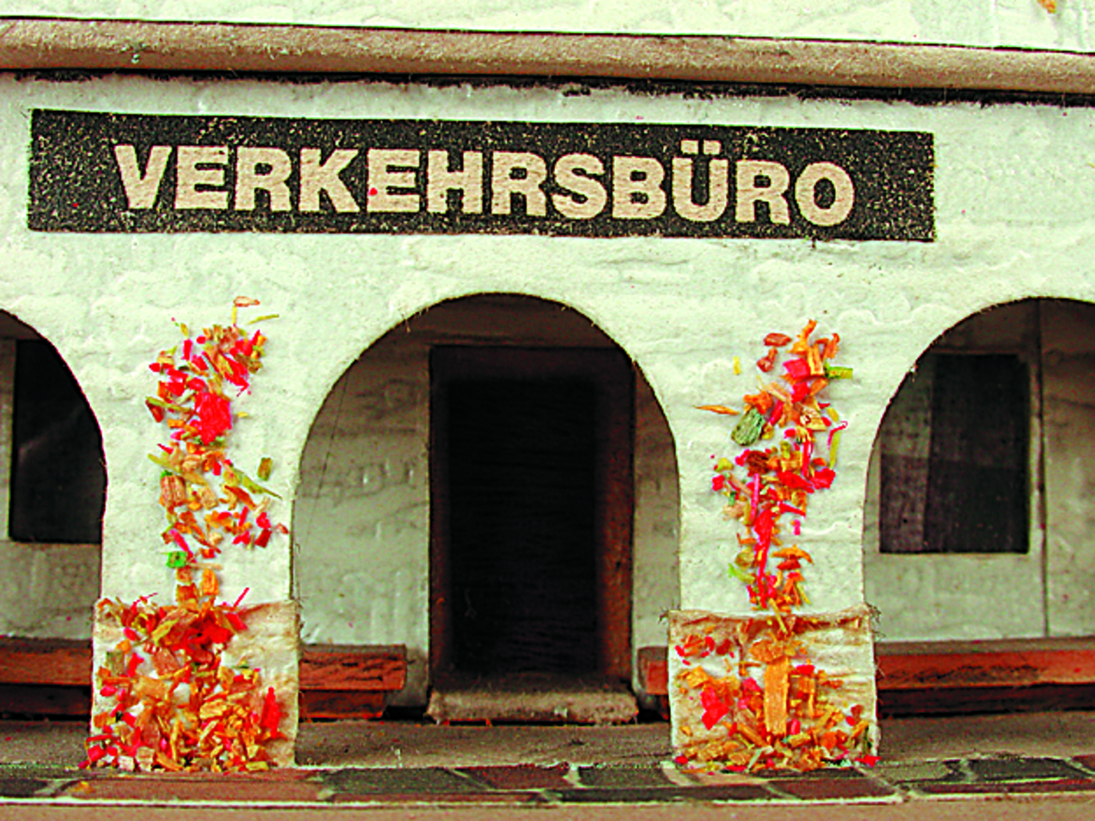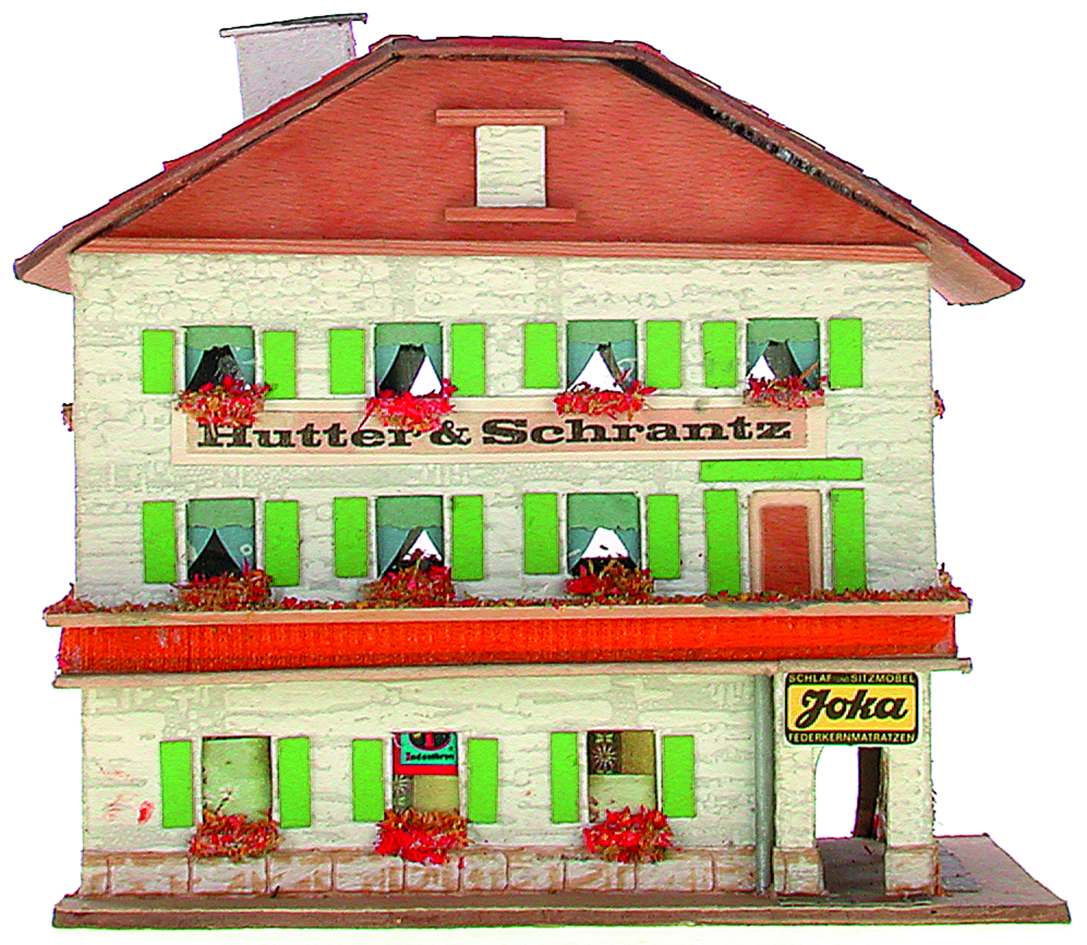 Anmerkung der Redaktion: Nicht von jedem Haus sind alle einzelnen verwendeten Materialien dokumentiert. Tatsächlich verbaute der Bastler auch Zigarettenschachteln, Spinnenpapier, Pappmaschee, Tapetenreste, Bunt- und Silberpapiere, Stoffe, Synthetikfasern, d-c-fix-Folien, Schriftproben, Zeitungsschnipsel und ausgewertete Illustrierte, Kartonagen, Holzabfälle aller Art, Uhu, Holzleim und Tapetenkleister.