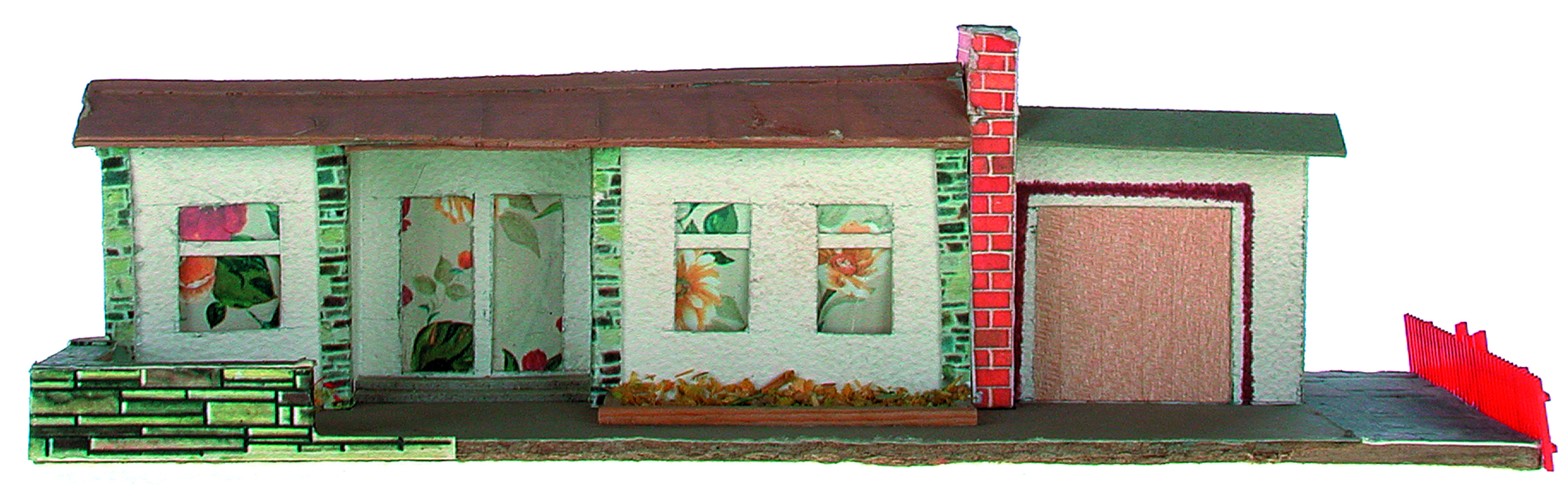 Anmerkung der Redaktion: Nicht von jedem Haus sind alle einzelnen verwendeten Materialien dokumentiert. Tatsächlich verbaute der Bastler auch Zigarettenschachteln, Spinnenpapier, Pappmaschee, Tapetenreste, Bunt- und Silberpapiere, Stoffe, Synthetikfasern, d-c-fix-Folien, Schriftproben, Zeitungsschnipsel und ausgewertete Illustrierte, Kartonagen, Holzabfälle aller Art, Uhu, Holzleim und Tapetenkleister.