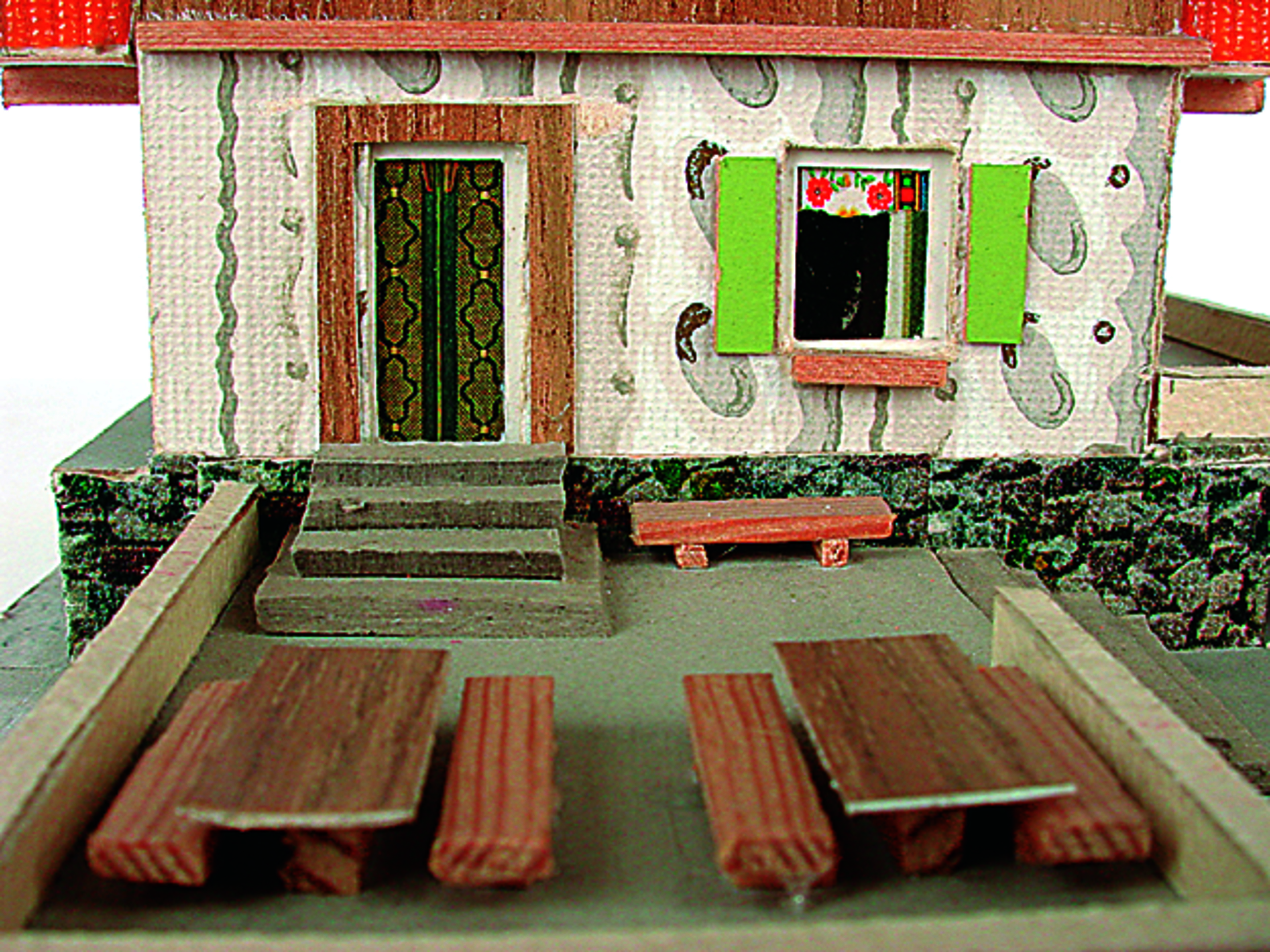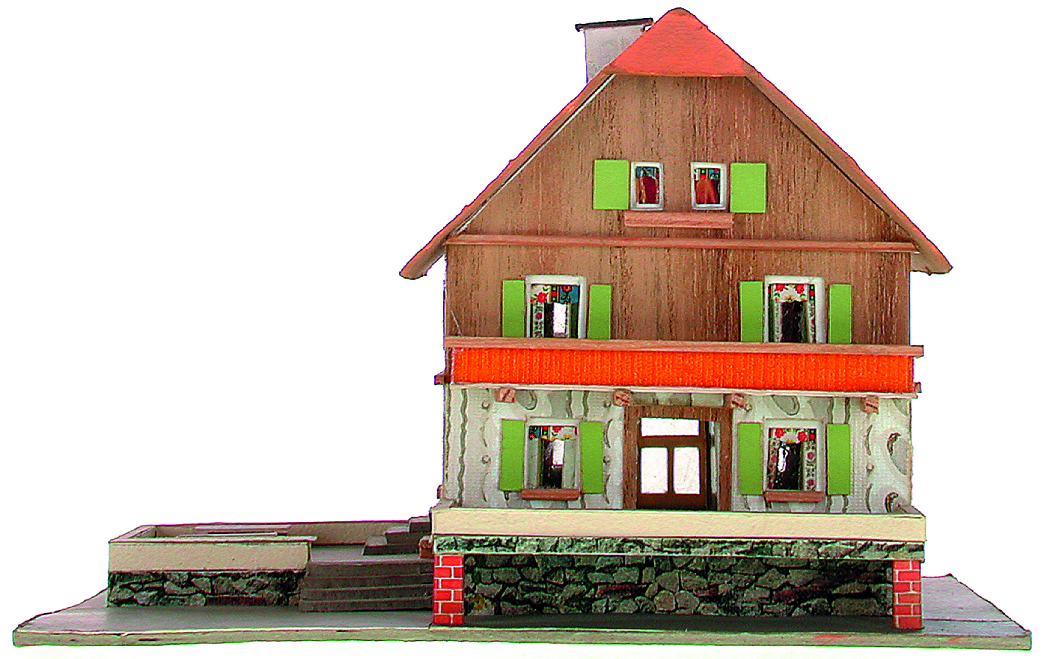 Anmerkung der Redaktion: Nicht von jedem Haus sind alle einzelnen verwendeten Materialien dokumentiert. Tatsächlich verbaute der Bastler auch Zigarettenschachteln, Spinnenpapier, Pappmaschee, Tapetenreste, Bunt- und Silberpapiere, Stoffe, Synthetikfasern, d-c-fix-Folien, Schriftproben, Zeitungsschnipsel und ausgewertete Illustrierte, Kartonagen, Holzabfälle aller Art, Uhu, Holzleim und Tapetenkleister.