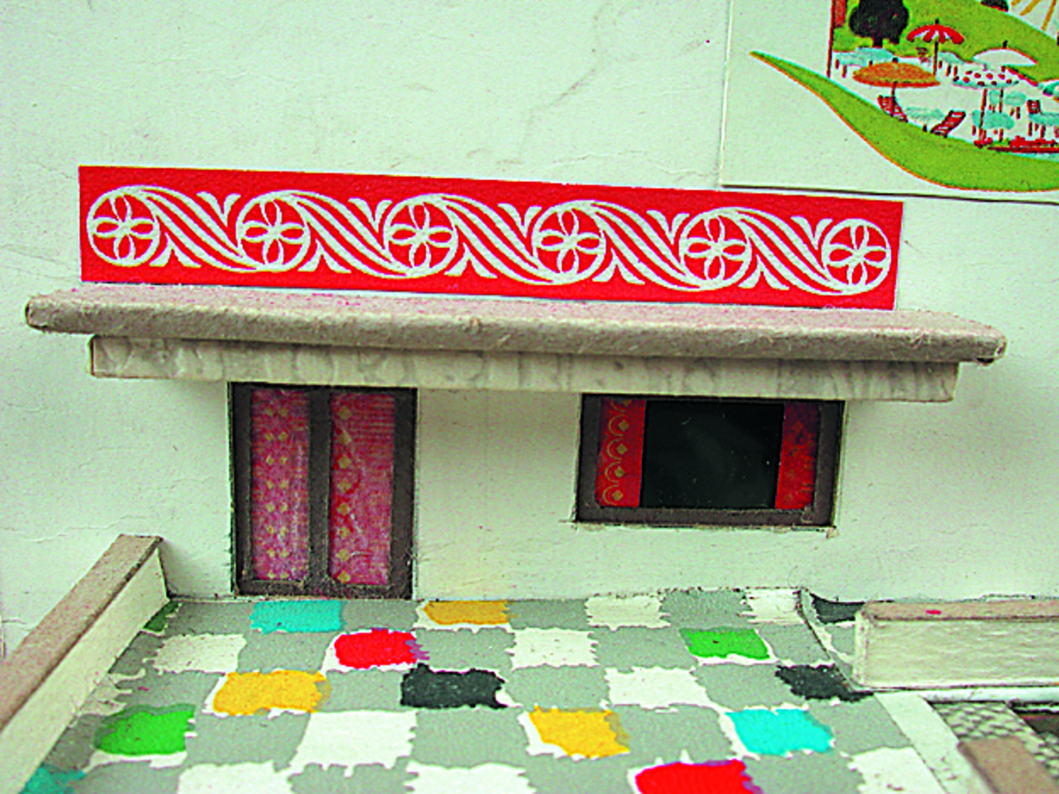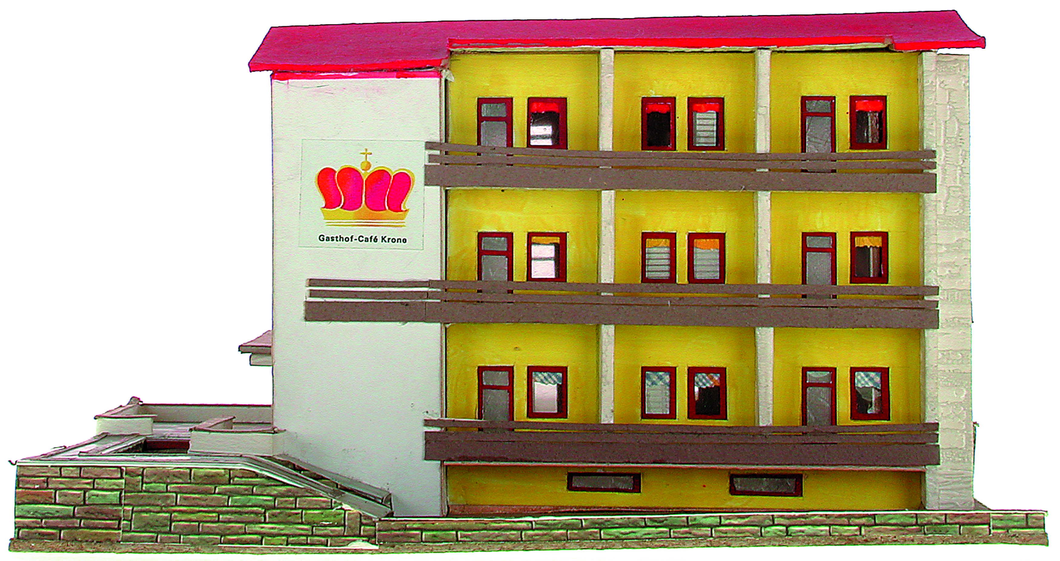 Anmerkung der Redaktion: Nicht von jedem Haus sind alle einzelnen verwendeten Materialien dokumentiert. Tatsächlich verbaute der Bastler auch Zigarettenschachteln, Spinnenpapier, Pappmaschee, Tapetenreste, Bunt- und Silberpapiere, Stoffe, Synthetikfasern, d-c-fix-Folien, Schriftproben, Zeitungsschnipsel und ausgewertete Illustrierte, Kartonagen, Holzabfälle aller Art, Uhu, Holzleim und Tapetenkleister.