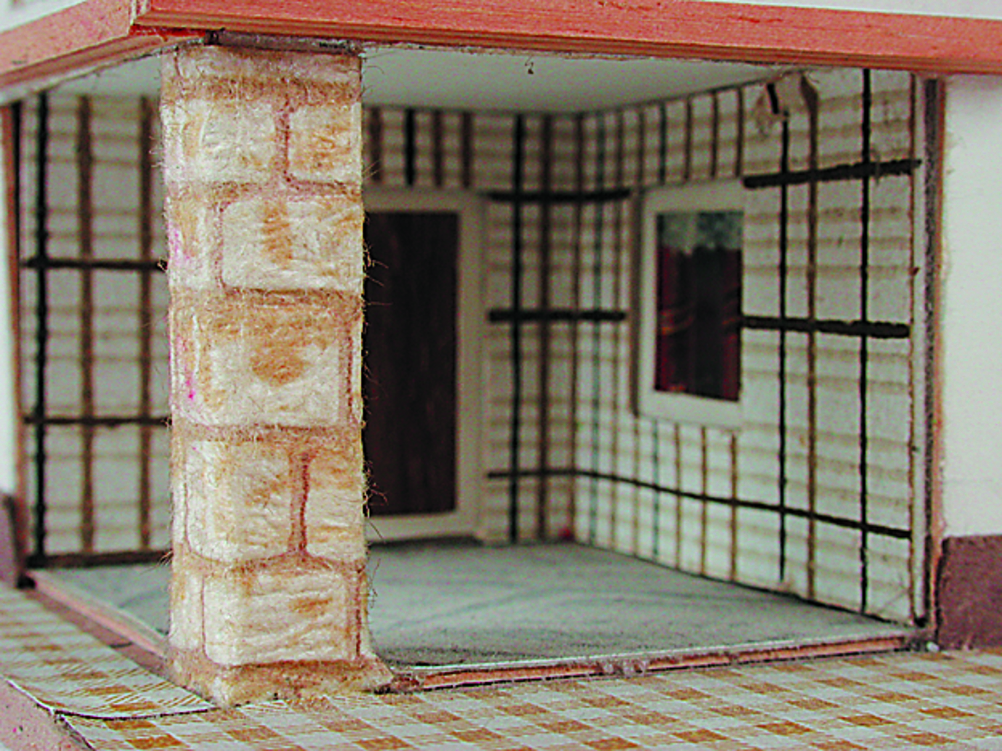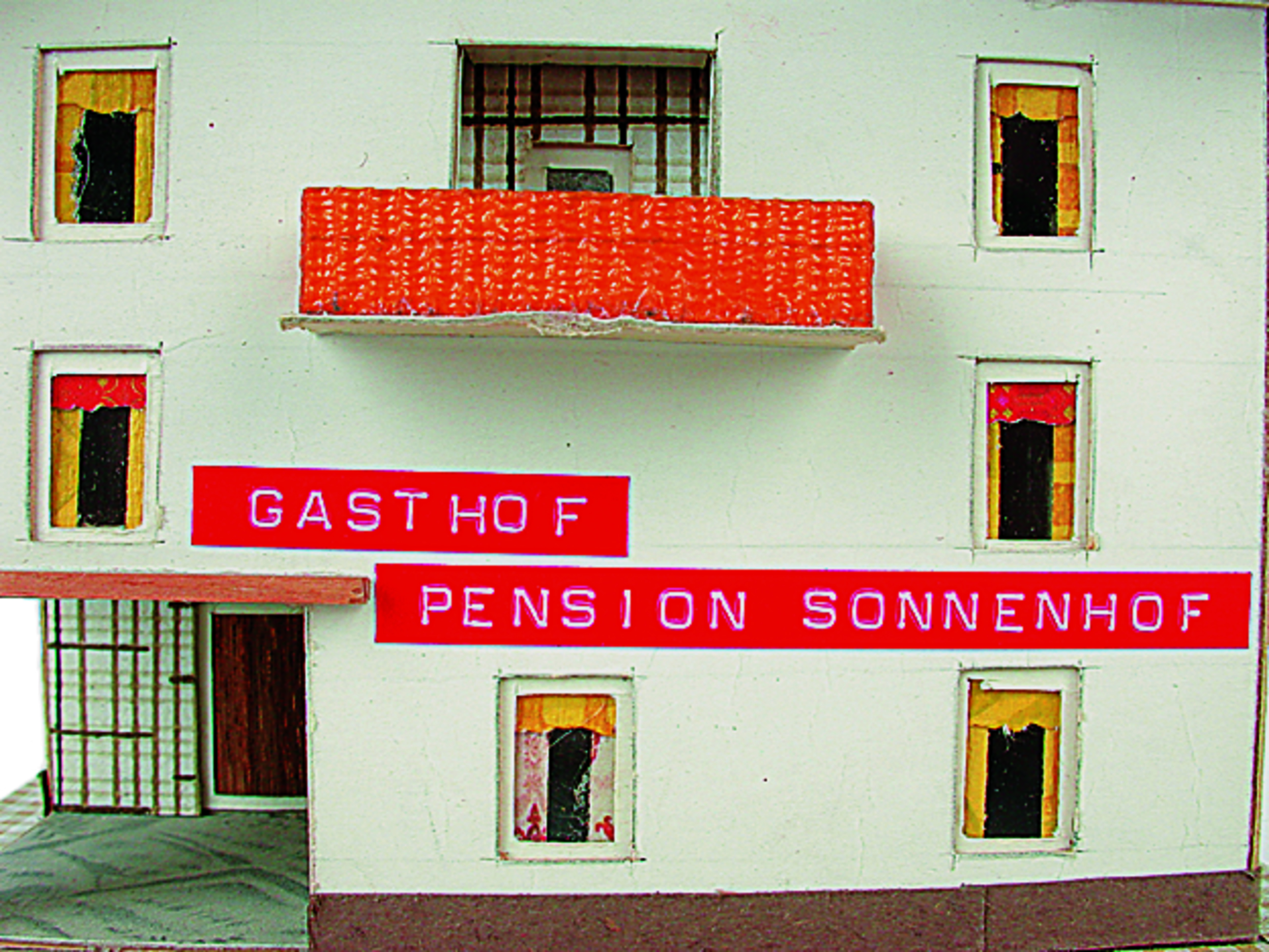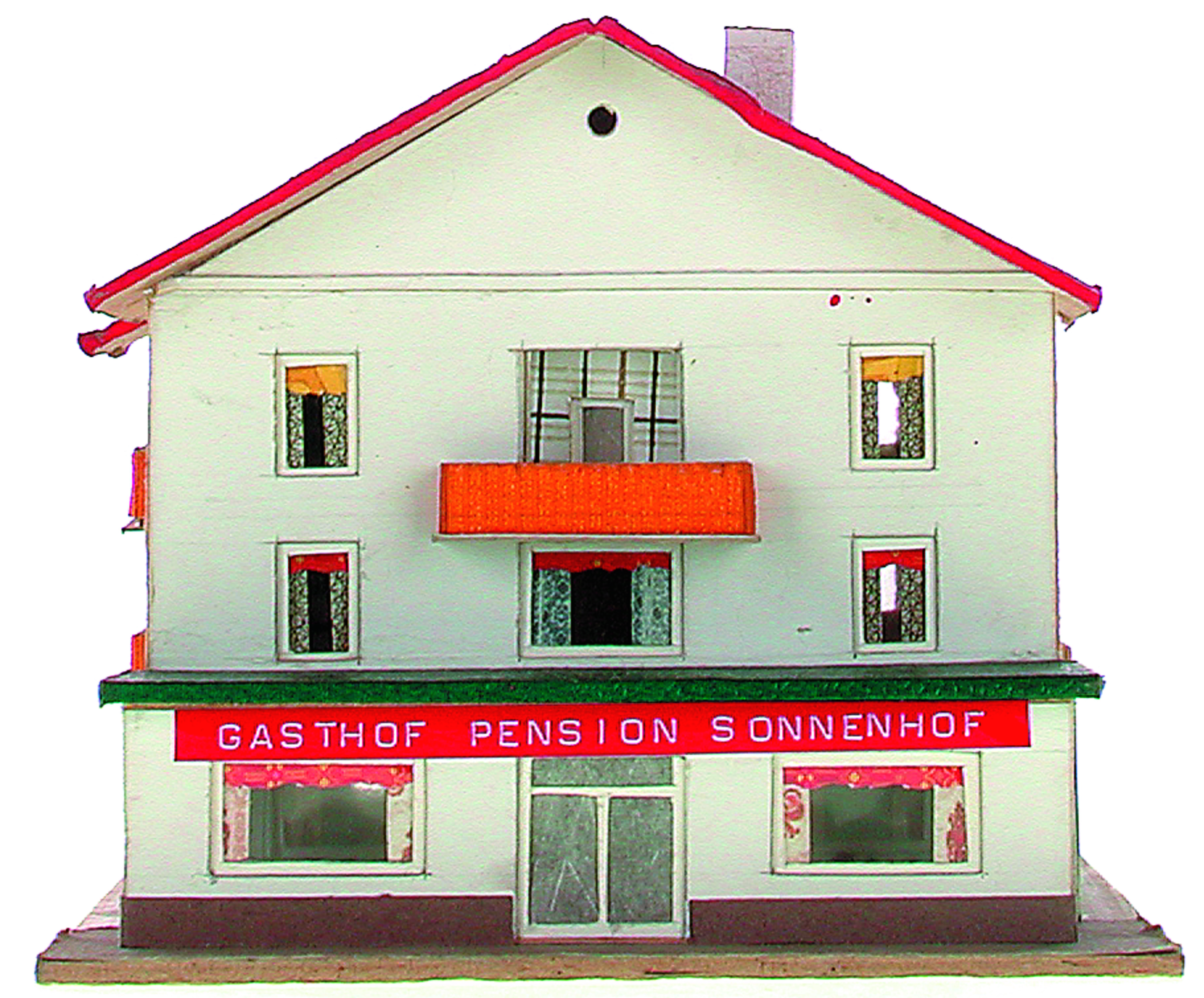Anmerkung der Redaktion: Nicht von jedem Haus sind alle einzelnen verwendeten Materialien dokumentiert. Tatsächlich verbaute der Bastler auch Zigarettenschachteln, Spinnenpapier, Pappmaschee, Tapetenreste, Bunt- und Silberpapiere, Stoffe, Synthetikfasern, d-c-fix-Folien, Schriftproben, Zeitungsschnipsel und ausgewertete Illustrierte, Kartonagen, Holzabfälle aller Art, Uhu, Holzleim und Tapetenkleister.