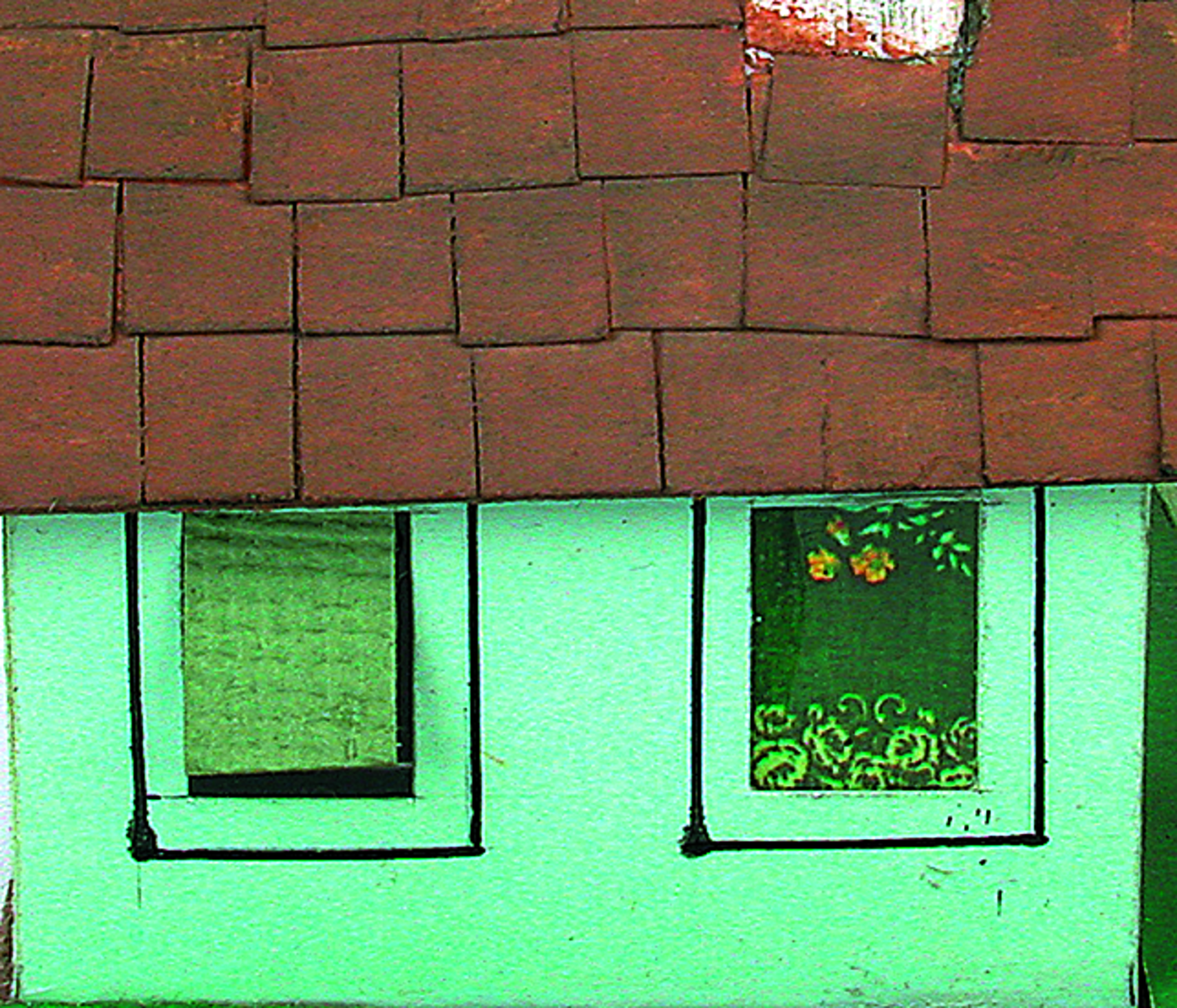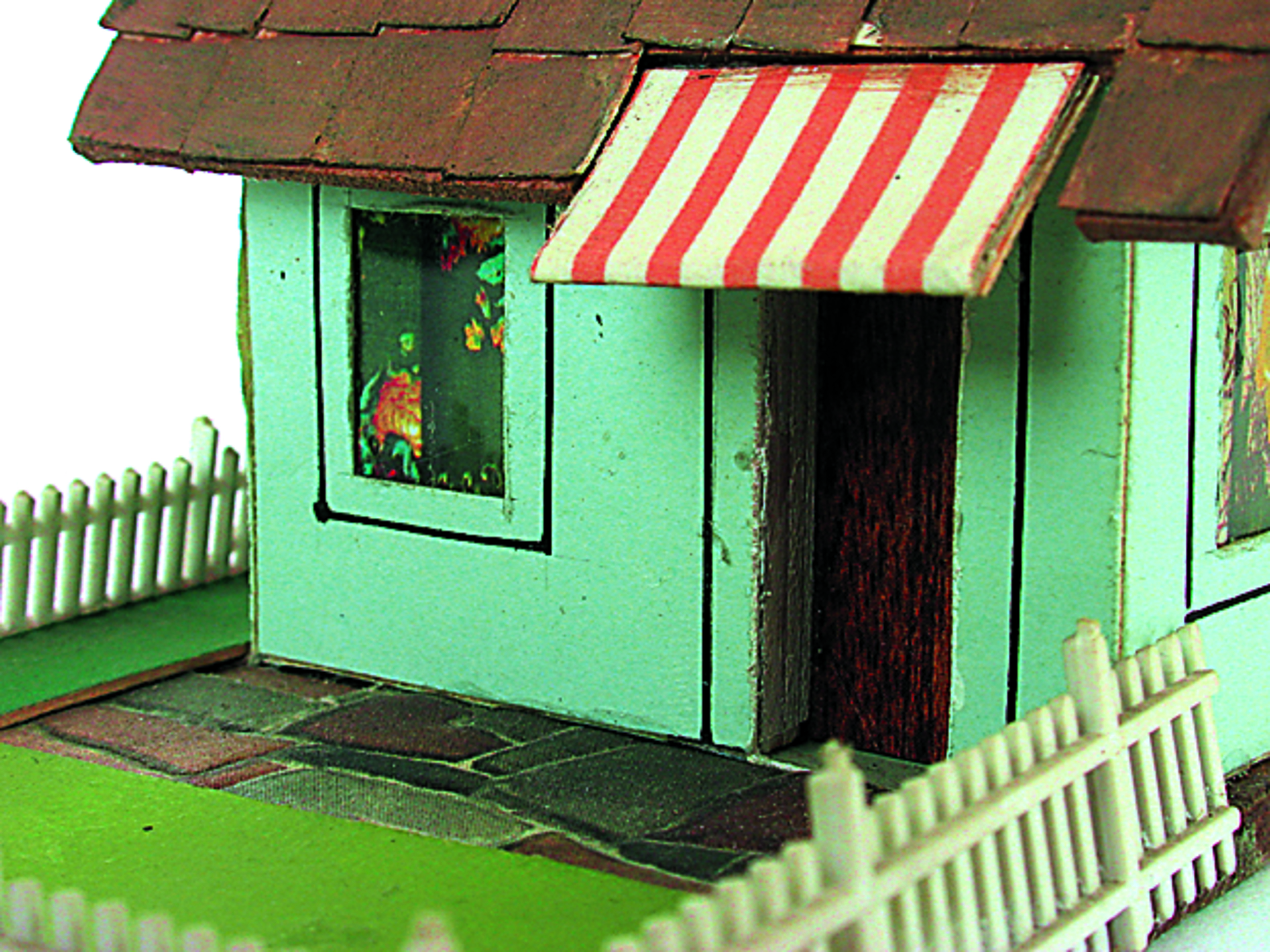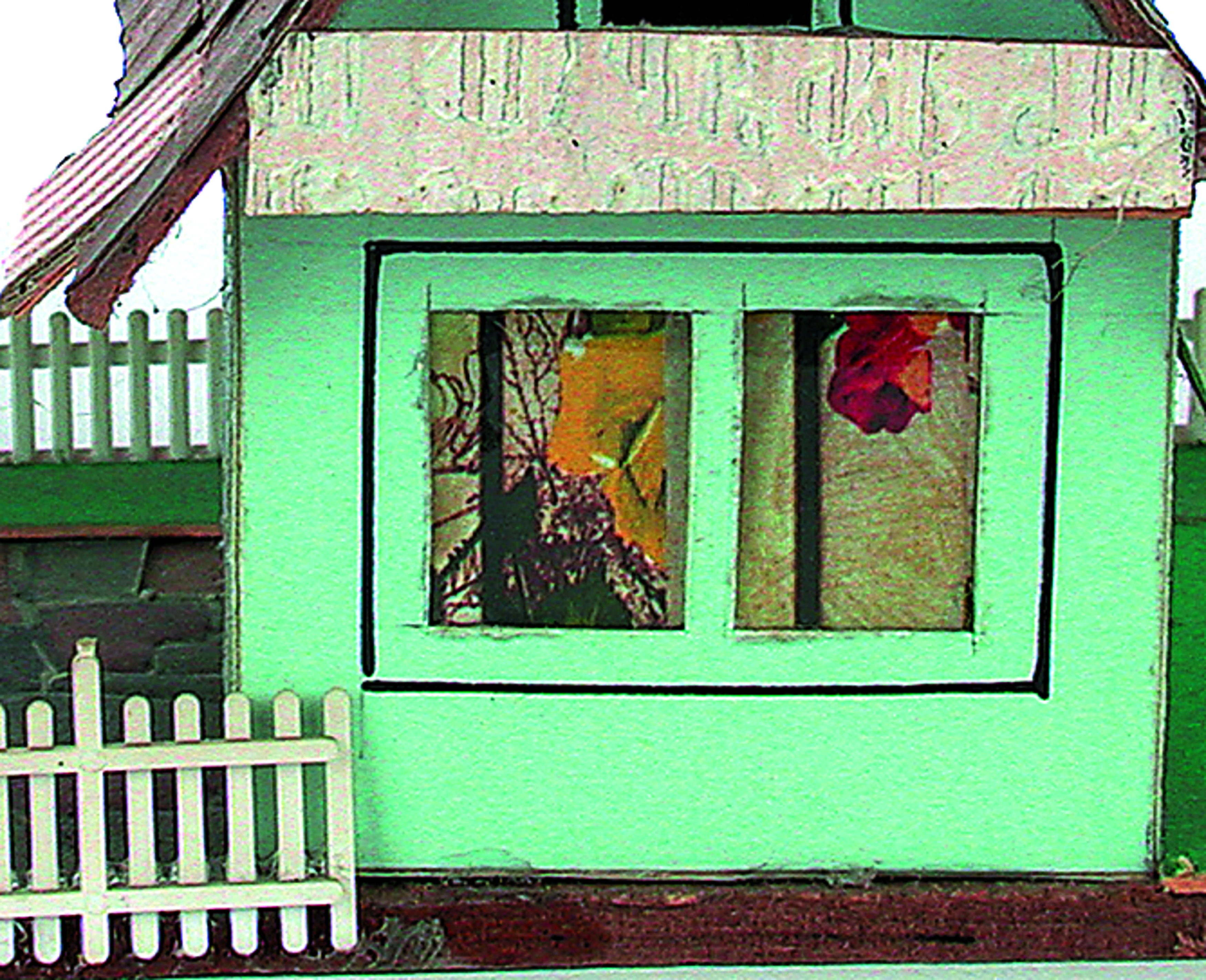 Anmerkung der Redaktion: Nicht von jedem Haus sind alle einzelnen verwendeten Materialien dokumentiert. Tatsächlich verbaute der Bastler auch Zigarettenschachteln, Spinnenpapier, Pappmaschee, Tapetenreste, Bunt- und Silberpapiere, Stoffe, Synthetikfasern, d-c-fix-Folien, Schriftproben, Zeitungsschnipsel und ausgewertete Illustrierte, Kartonagen, Holzabfälle aller Art, Uhu, Holzleim und Tapetenkleister.