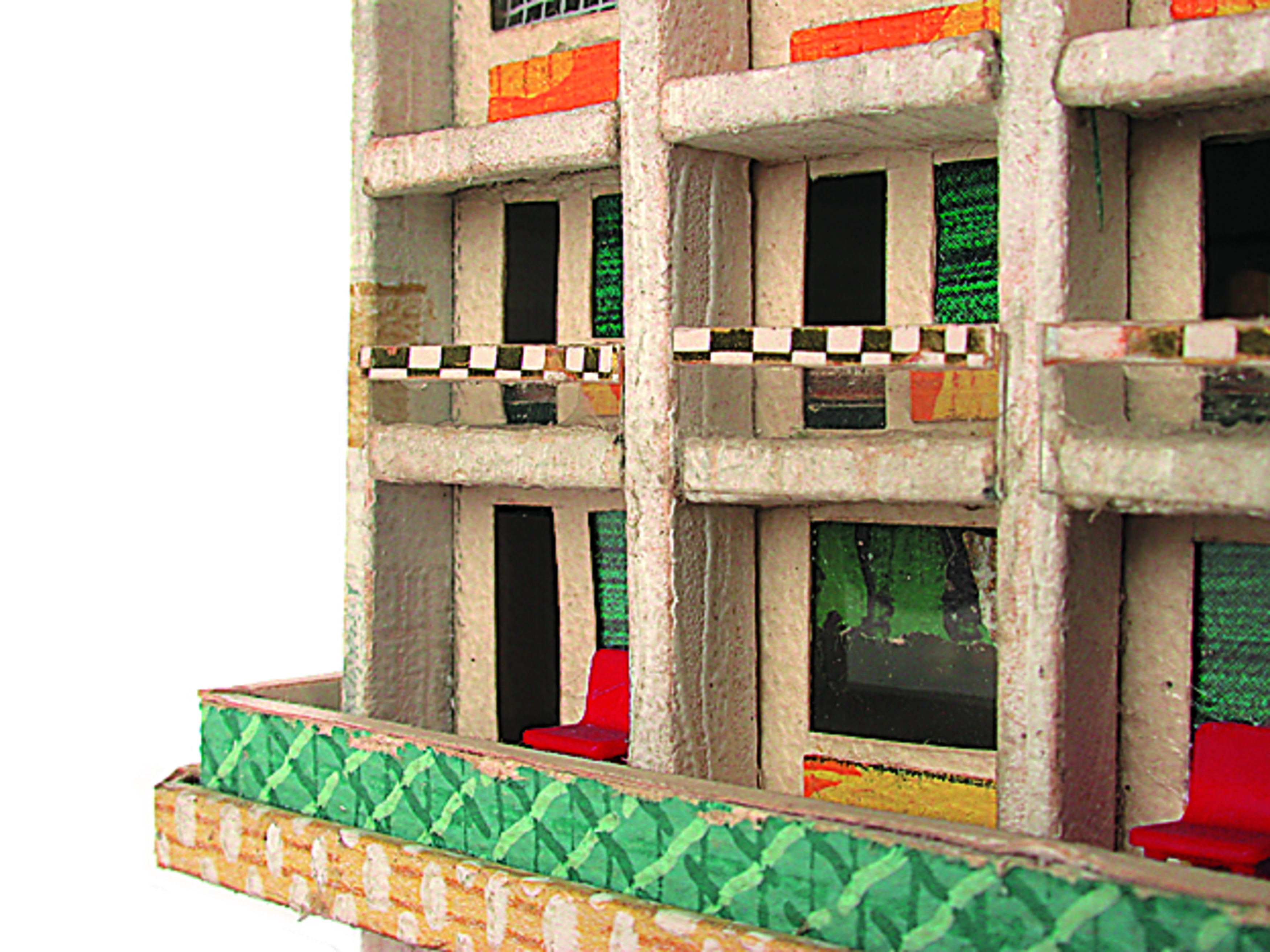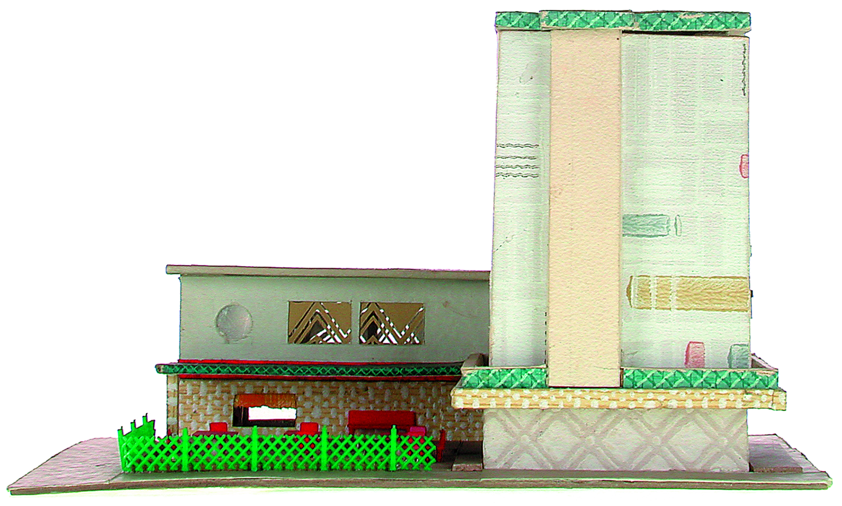 Anmerkung der Redaktion: Nicht von jedem Haus sind alle einzelnen verwendeten Materialien dokumentiert. Tatsächlich verbaute der Bastler auch Zigarettenschachteln, Spinnenpapier, Pappmaschee, Tapetenreste, Bunt- und Silberpapiere, Stoffe, Synthetikfasern, d-c-fix-Folien, Schriftproben, Zeitungsschnipsel und ausgewertete Illustrierte, Kartonagen, Holzabfälle aller Art, Uhu, Holzleim und Tapetenkleister.