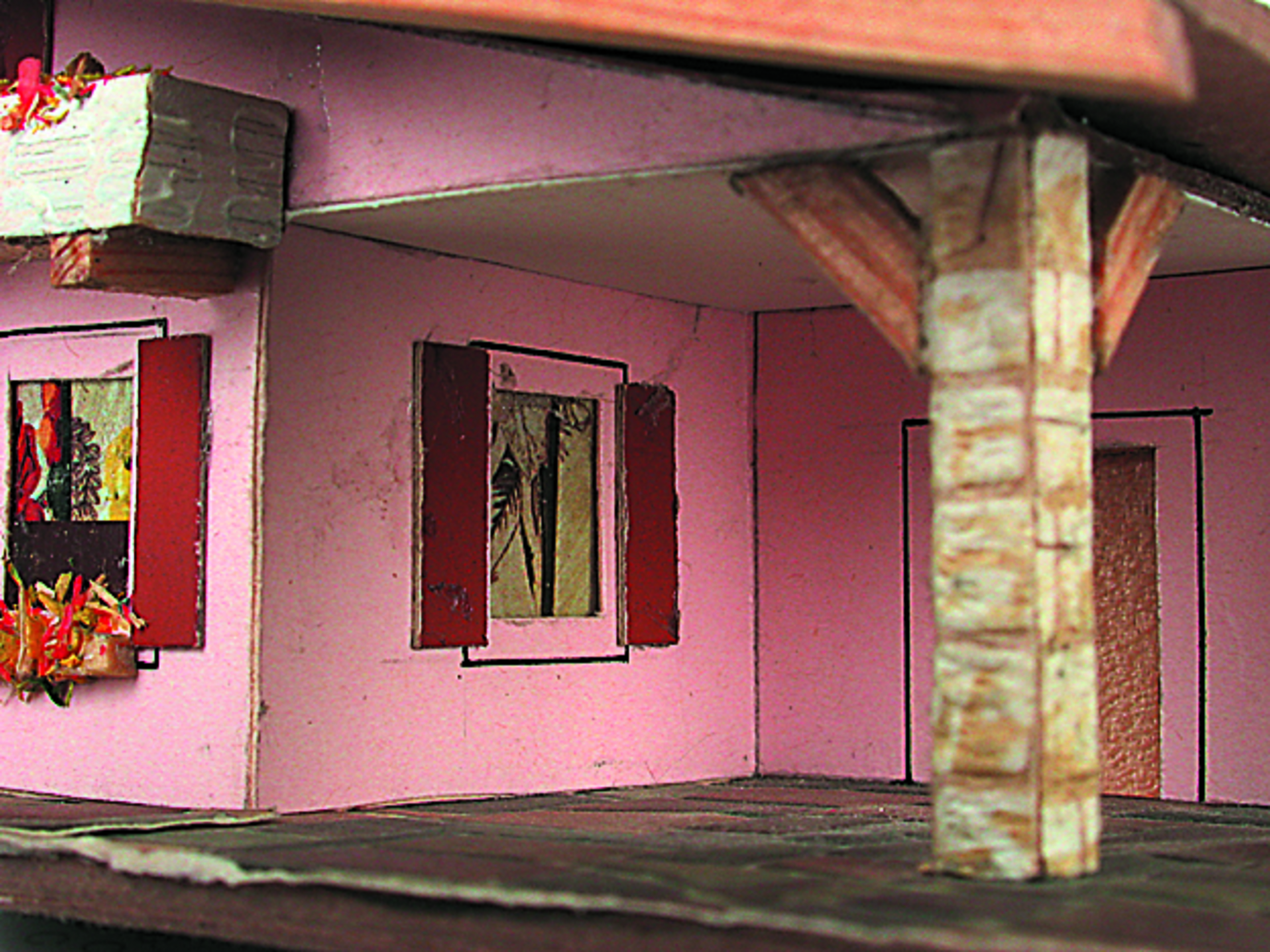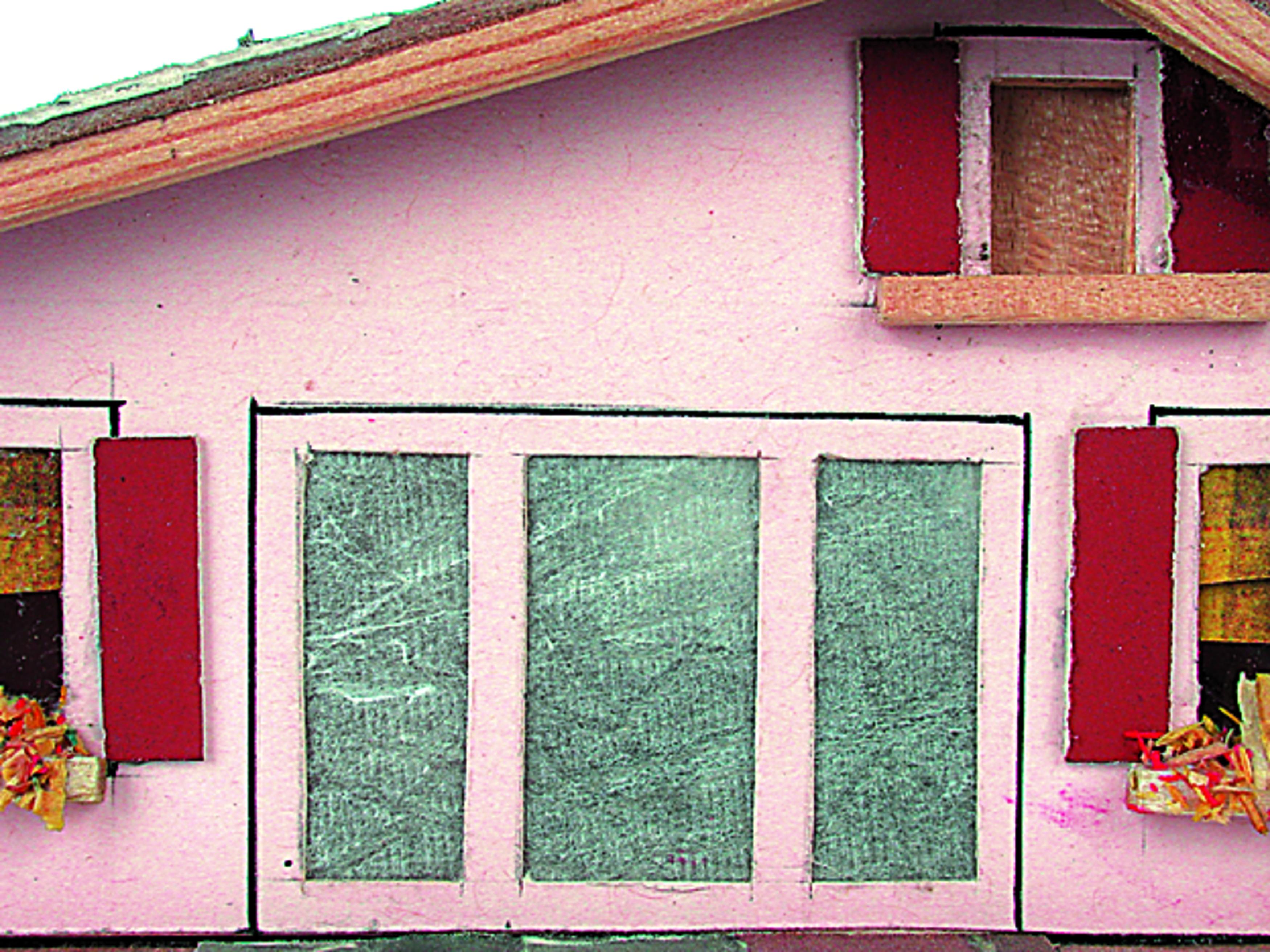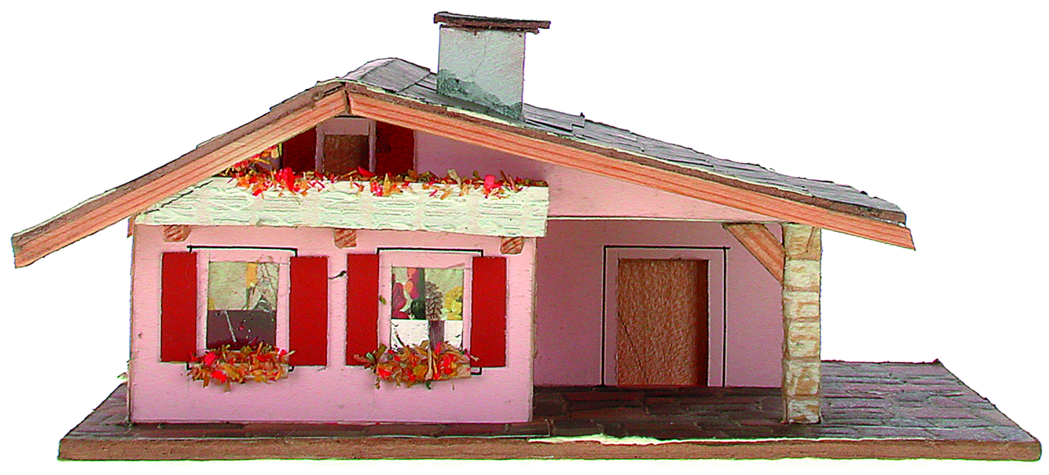 Anmerkung der Redaktion: Nicht von jedem Haus sind alle einzelnen verwendeten Materialien dokumentiert. Tatsächlich verbaute der Bastler auch Zigarettenschachteln, Spinnenpapier, Pappmaschee, Tapetenreste, Bunt- und Silberpapiere, Stoffe, Synthetikfasern, d-c-fix-Folien, Schriftproben, Zeitungsschnipsel und ausgewertete Illustrierte, Kartonagen, Holzabfälle aller Art, Uhu, Holzleim und Tapetenkleister.