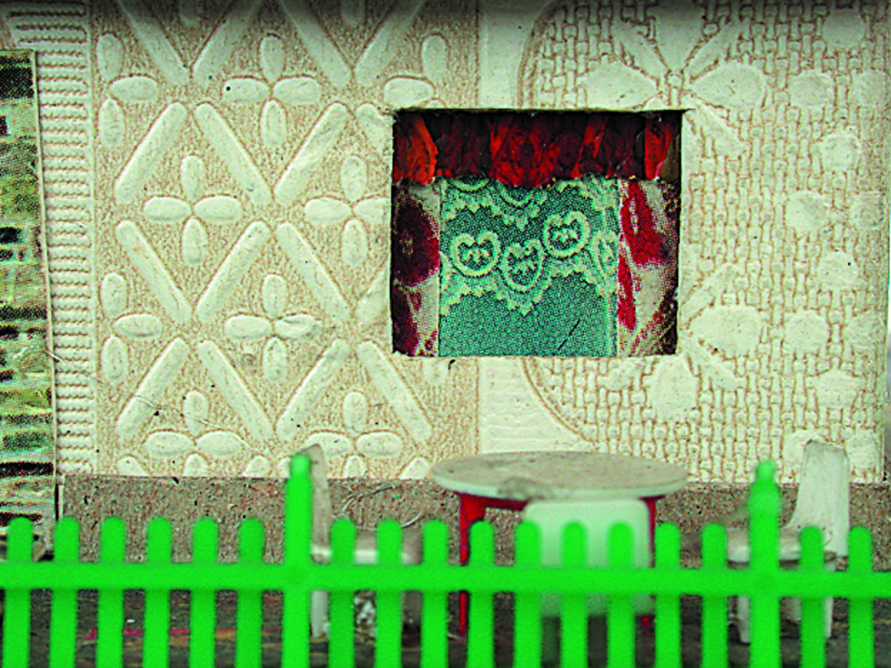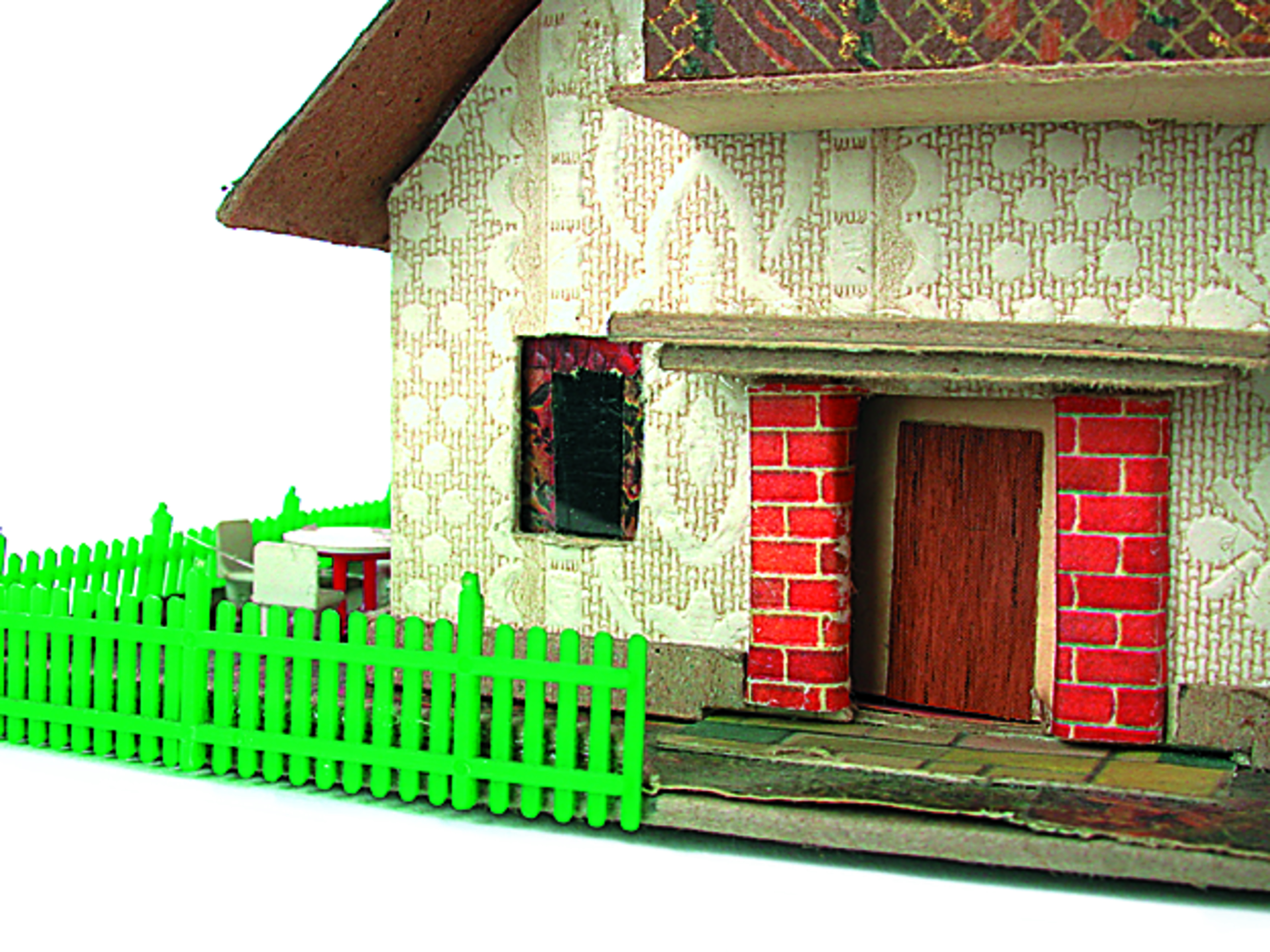 Anmerkung der Redaktion: Nicht von jedem Haus sind alle einzelnen verwendeten Materialien dokumentiert. Tatsächlich verbaute der Bastler auch Zigarettenschachteln, Spinnenpapier, Pappmaschee, Tapetenreste, Bunt- und Silberpapiere, Stoffe, Synthetikfasern, d-c-fix-Folien, Schriftproben, Zeitungsschnipsel und ausgewertete Illustrierte, Kartonagen, Holzabfälle aller Art, Uhu, Holzleim und Tapetenkleister.