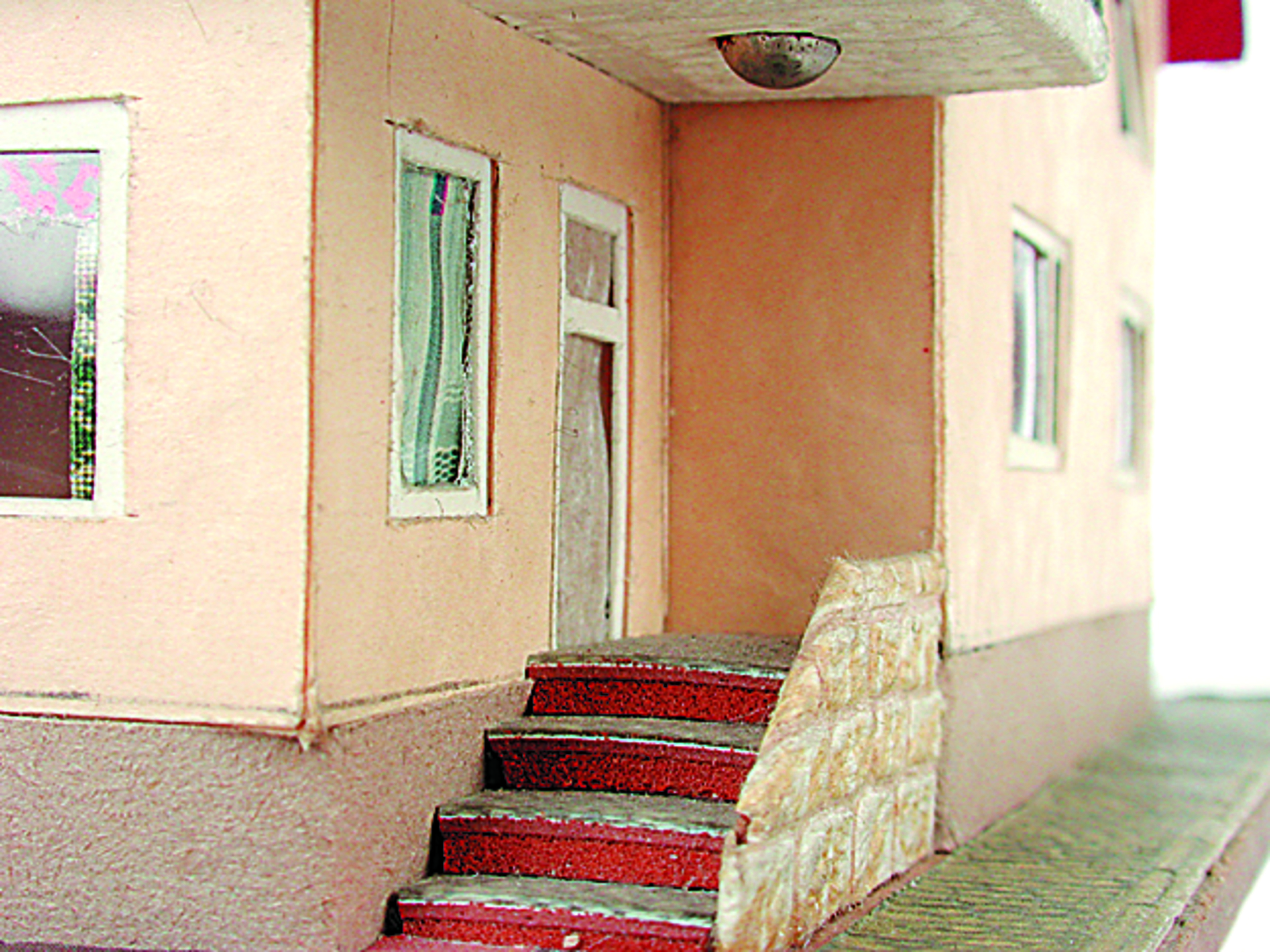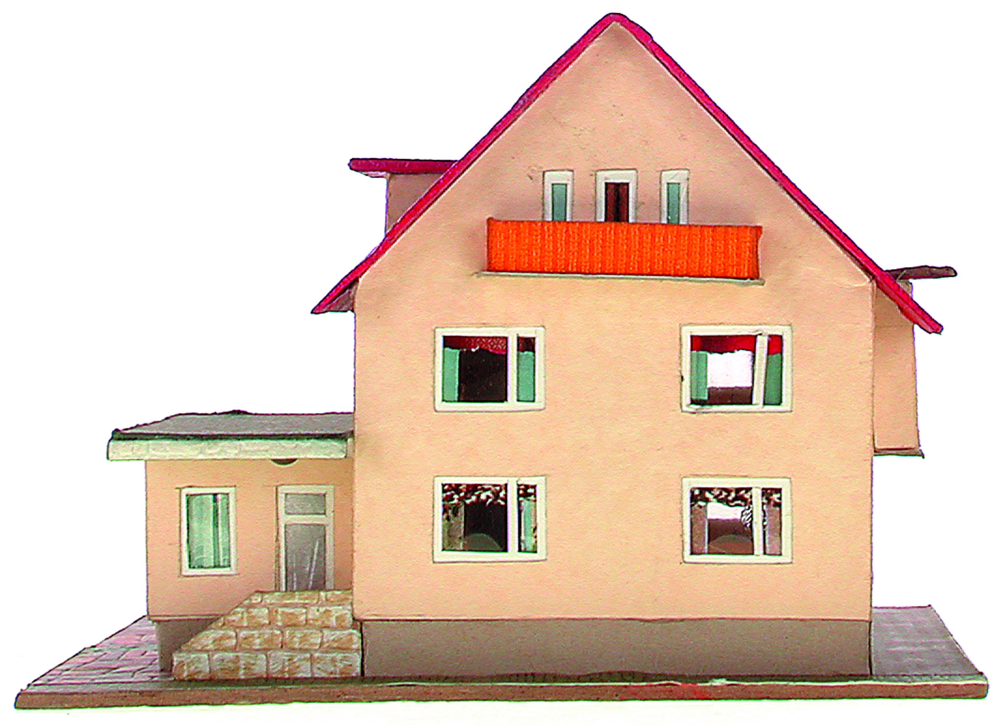 Anmerkung der Redaktion: Nicht von jedem Haus sind alle einzelnen verwendeten Materialien dokumentiert. Tatsächlich verbaute der Bastler auch Zigarettenschachteln, Spinnenpapier, Pappmaschee, Tapetenreste, Bunt- und Silberpapiere, Stoffe, Synthetikfasern, d-c-fix-Folien, Schriftproben, Zeitungsschnipsel und ausgewertete Illustrierte, Kartonagen, Holzabfälle aller Art, Uhu, Holzleim und Tapetenkleister.