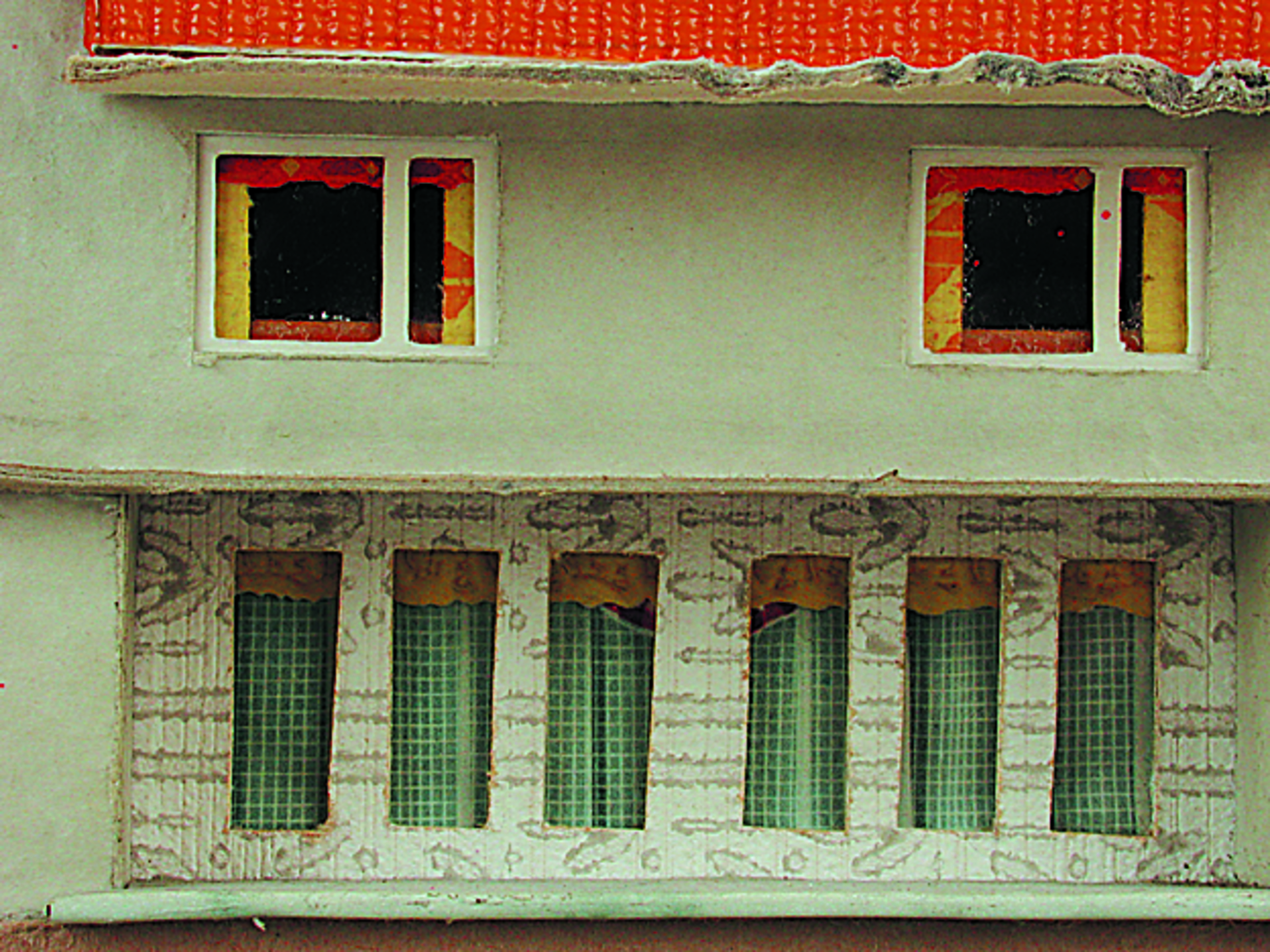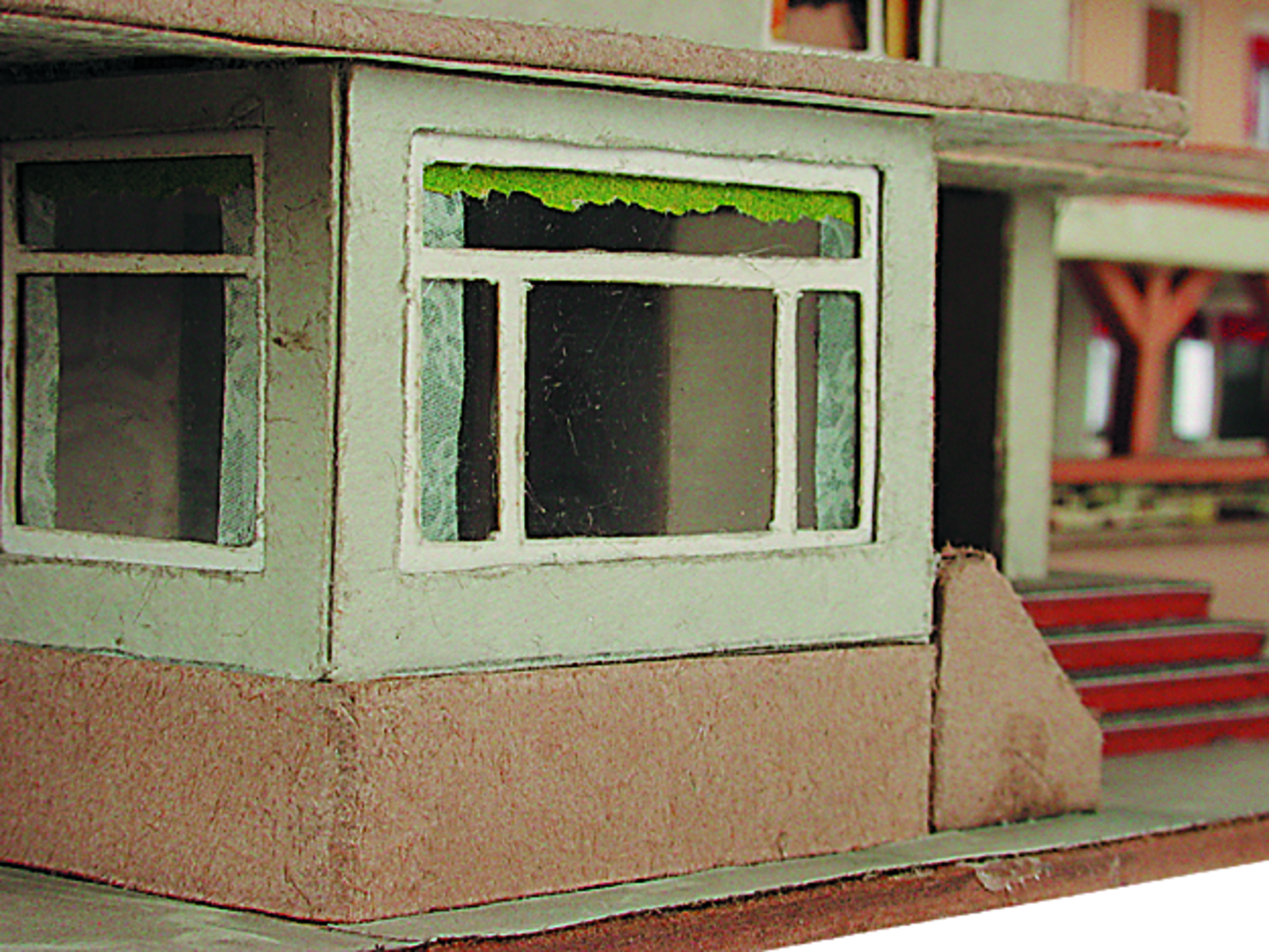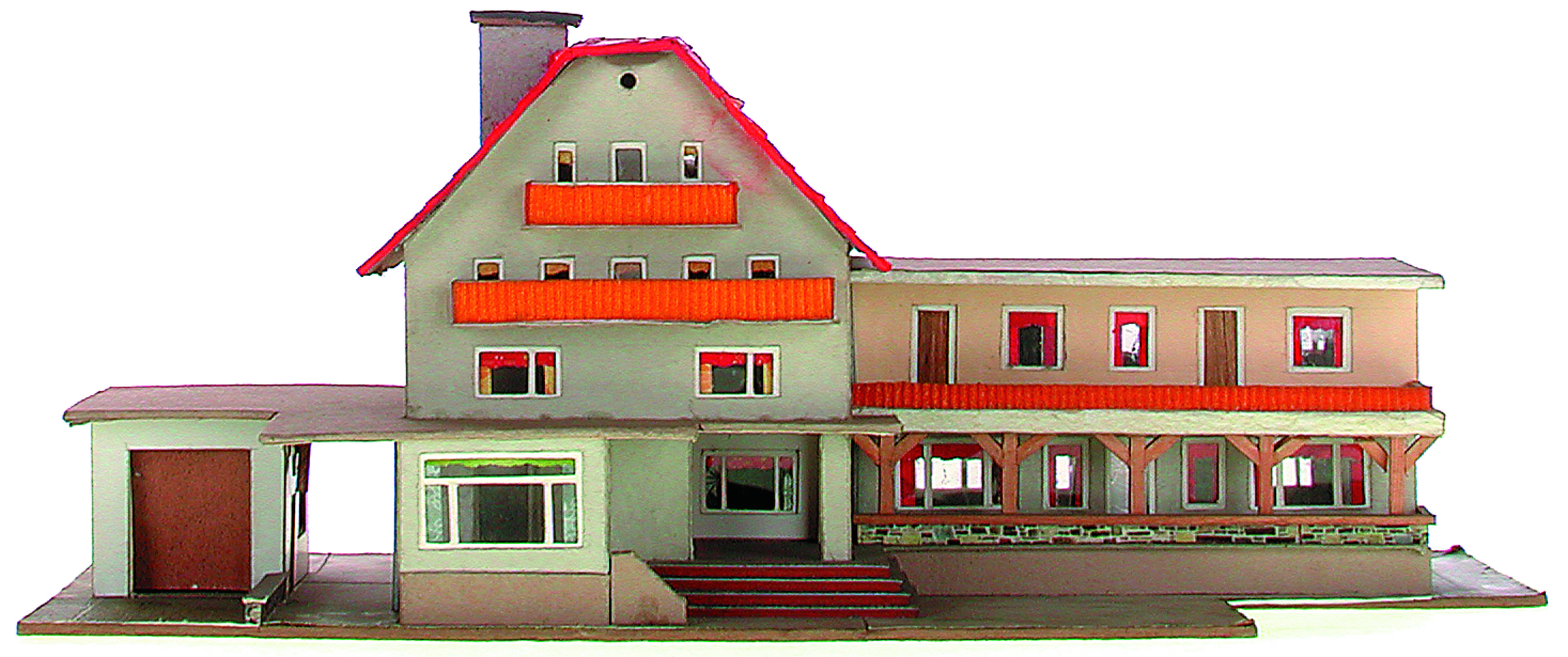 Anmerkung der Redaktion: Nicht von jedem Haus sind alle einzelnen verwendeten Materialien dokumentiert. Tatsächlich verbaute der Bastler auch Zigarettenschachteln, Spinnenpapier, Pappmaschee, Tapetenreste, Bunt- und Silberpapiere, Stoffe, Synthetikfasern, d-c-fix-Folien, Schriftproben, Zeitungsschnipsel und ausgewertete Illustrierte, Kartonagen, Holzabfälle aller Art, Uhu, Holzleim und Tapetenkleister.