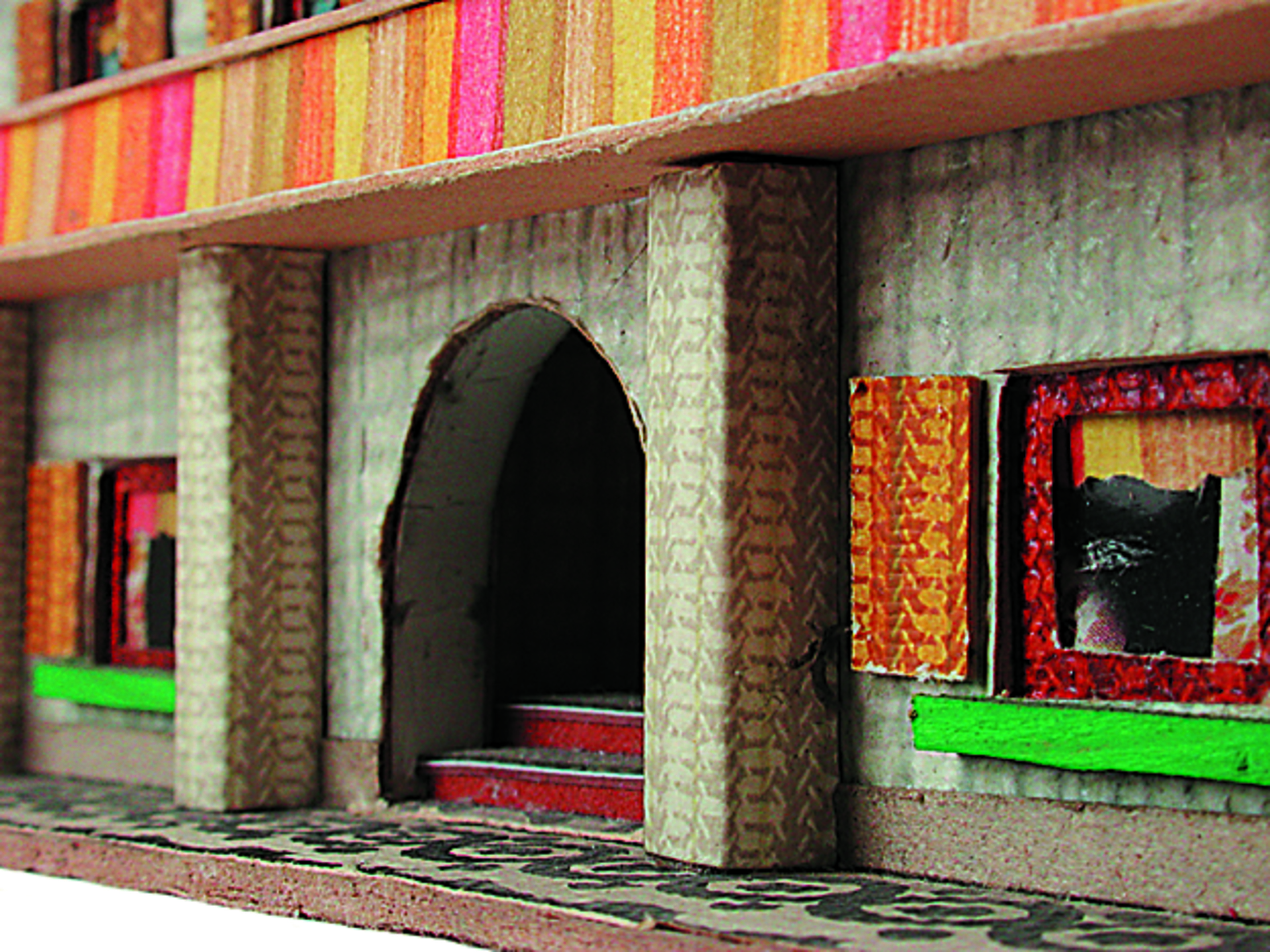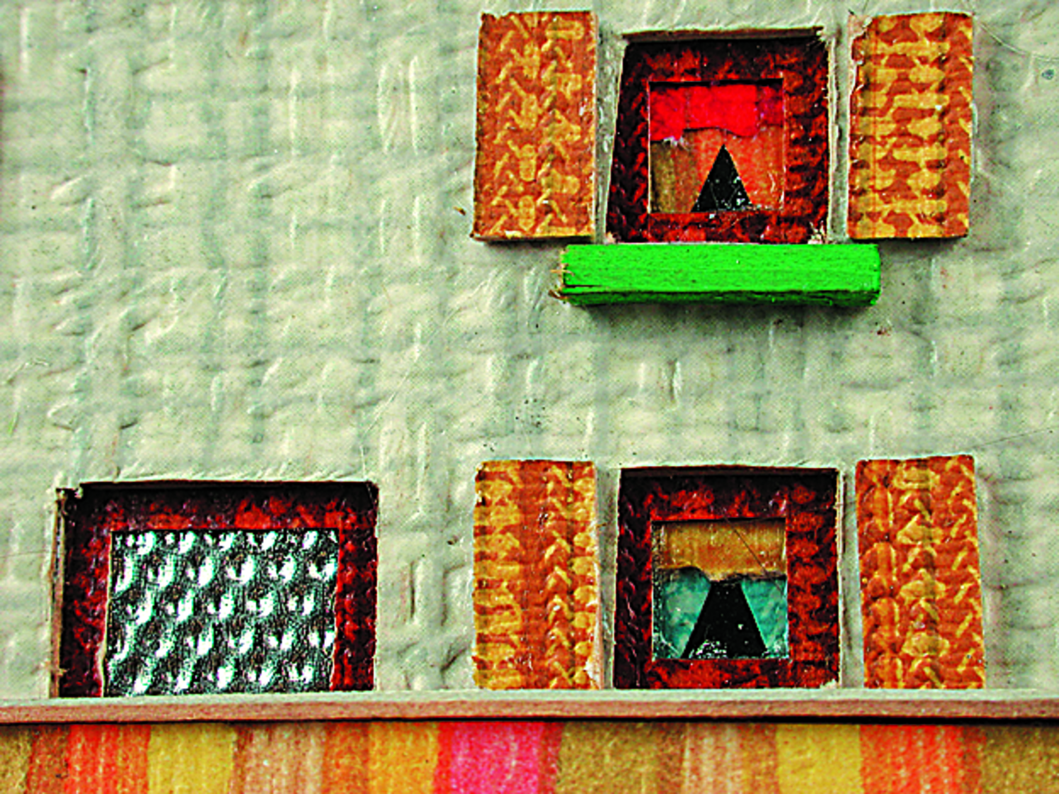 Anmerkung der Redaktion: Nicht von jedem Haus sind alle einzelnen verwendeten Materialien dokumentiert. Tatsächlich verbaute der Bastler auch Zigarettenschachteln, Spinnenpapier, Pappmaschee, Tapetenreste, Bunt- und Silberpapiere, Stoffe, Synthetikfasern, d-c-fix-Folien, Schriftproben, Zeitungsschnipsel und ausgewertete Illustrierte, Kartonagen, Holzabfälle aller Art, Uhu, Holzleim und Tapetenkleister.