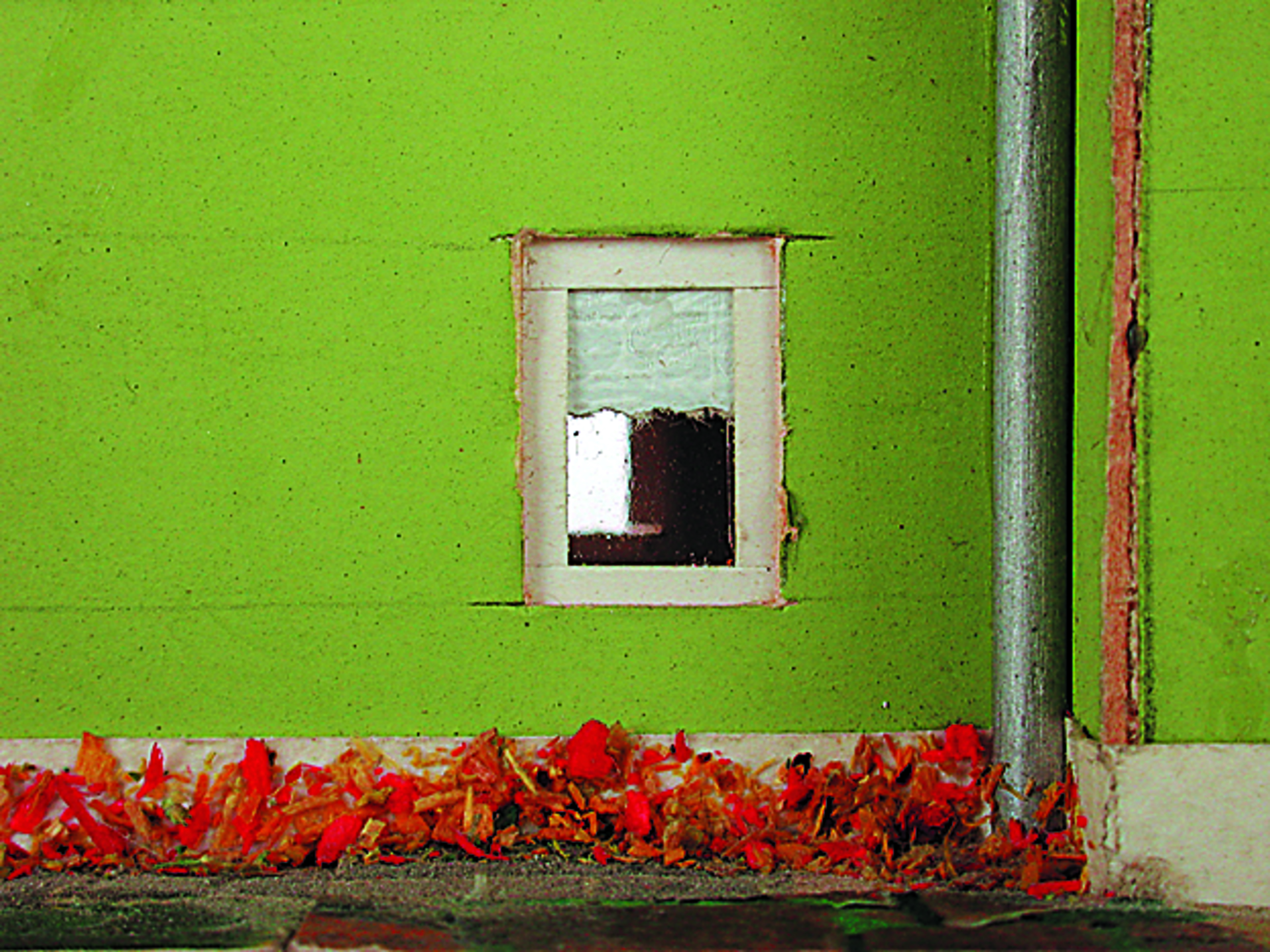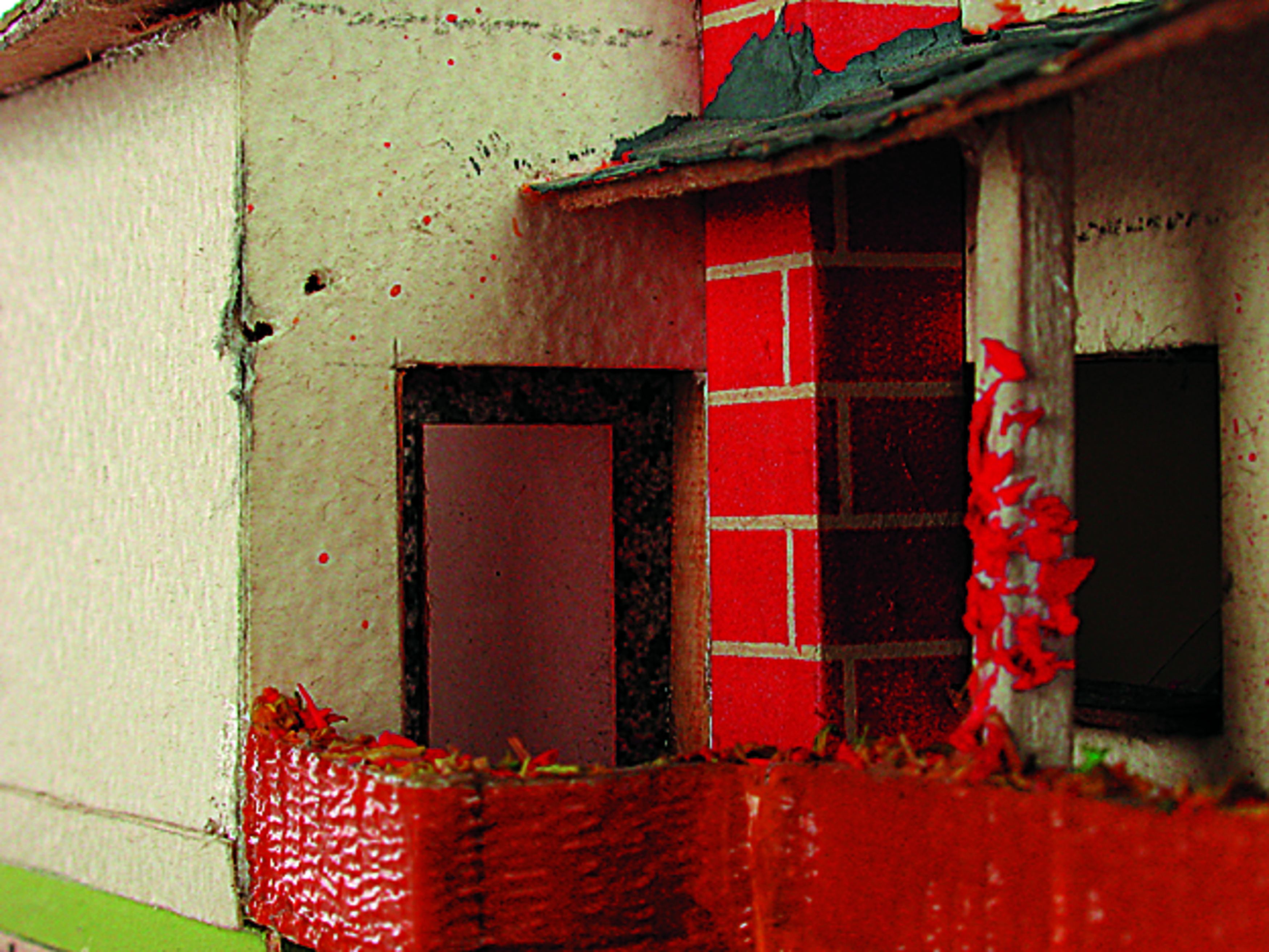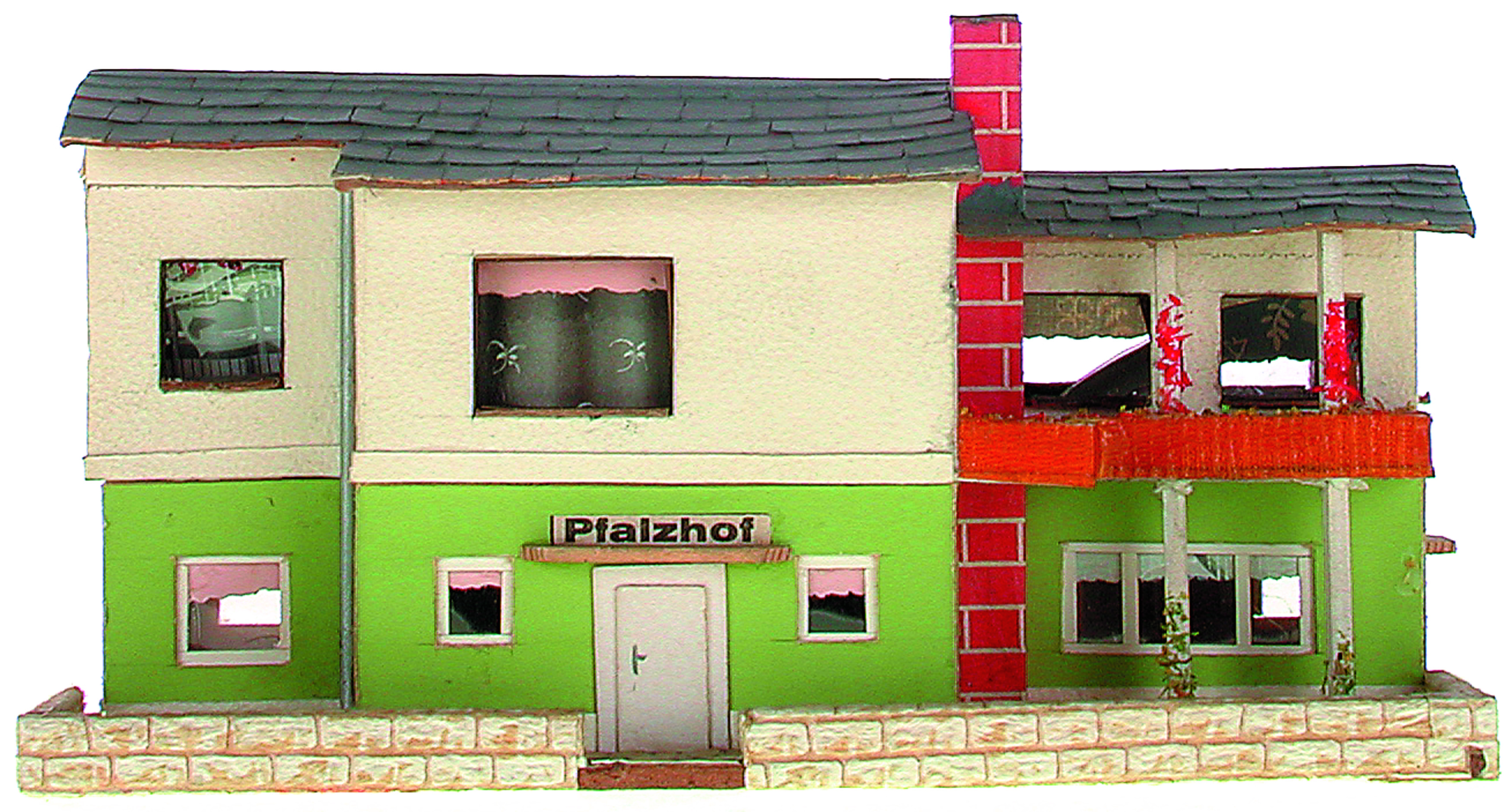 Anmerkung der Redaktion: Nicht von jedem Haus sind alle einzelnen verwendeten Materialien dokumentiert. Tatsächlich verbaute der Bastler auch Zigarettenschachteln, Spinnenpapier, Pappmaschee, Tapetenreste, Bunt- und Silberpapiere, Stoffe, Synthetikfasern, d-c-fix-Folien, Schriftproben, Zeitungsschnipsel und ausgewertete Illustrierte, Kartonagen, Holzabfälle aller Art, Uhu, Holzleim und Tapetenkleister.