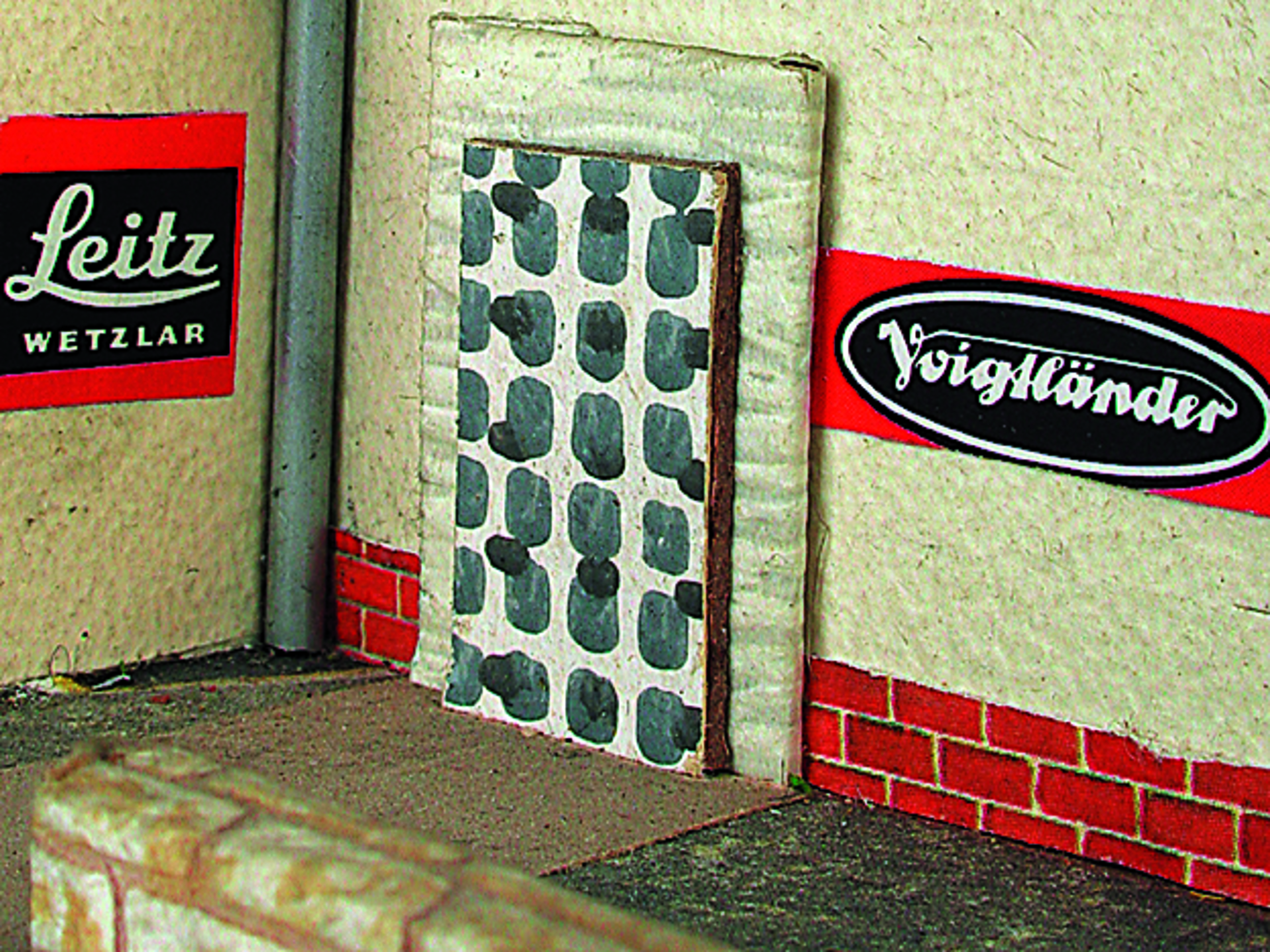 Anmerkung der Redaktion: Nicht von jedem Haus sind alle einzelnen verwendeten Materialien dokumentiert. Tatsächlich verbaute der Bastler auch Zigarettenschachteln, Spinnenpapier, Pappmaschee, Tapetenreste, Bunt- und Silberpapiere, Stoffe, Synthetikfasern, d-c-fix-Folien, Schriftproben, Zeitungsschnipsel und ausgewertete Illustrierte, Kartonagen, Holzabfälle aller Art, Uhu, Holzleim und Tapetenkleister.