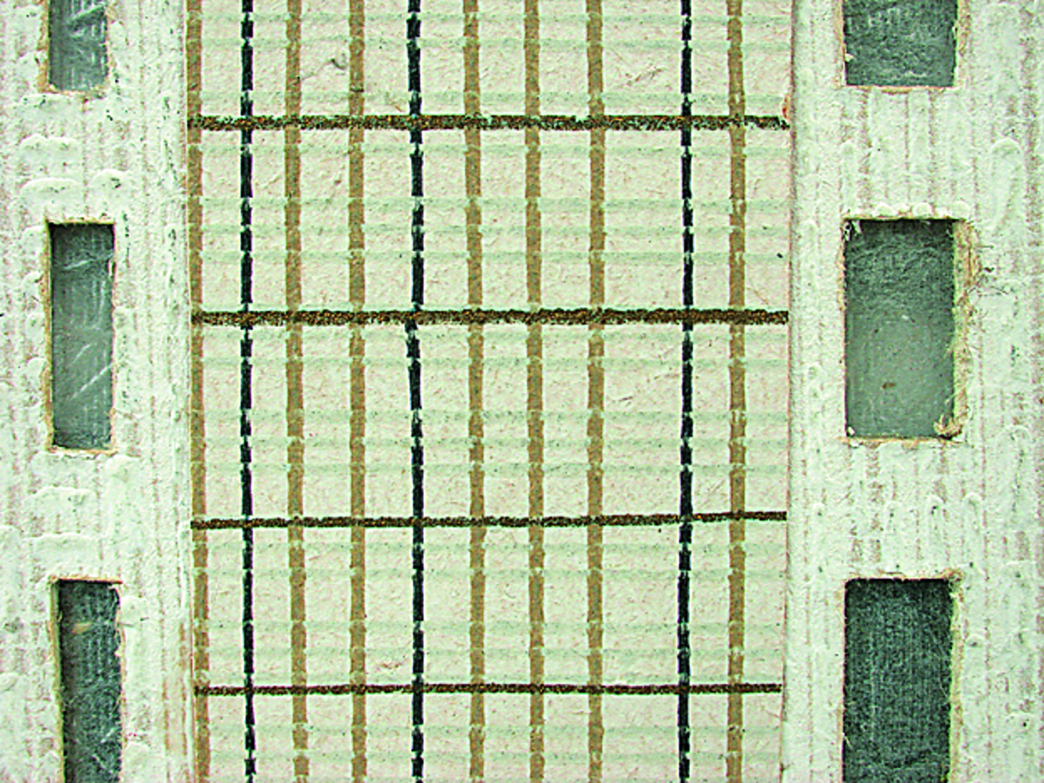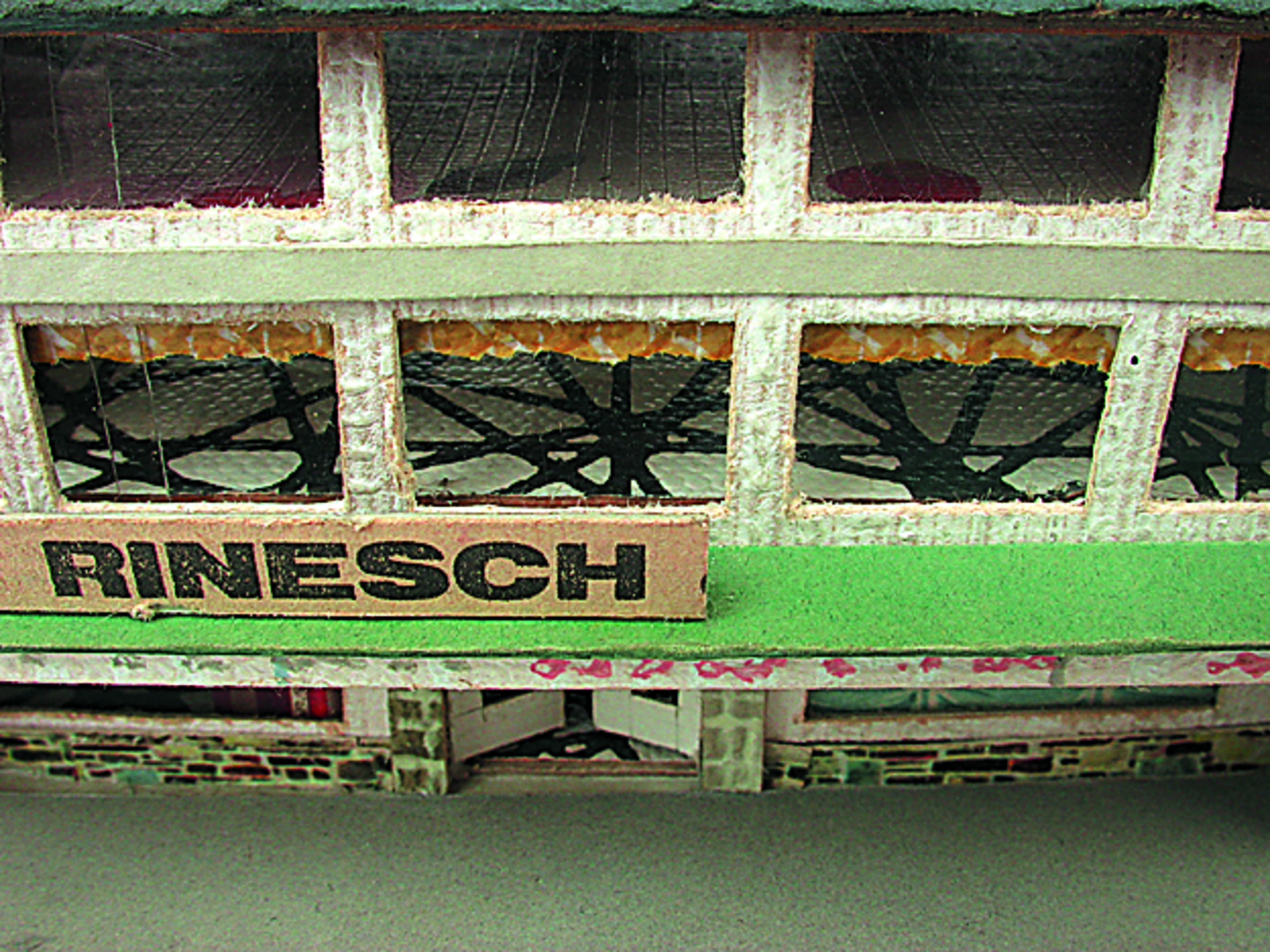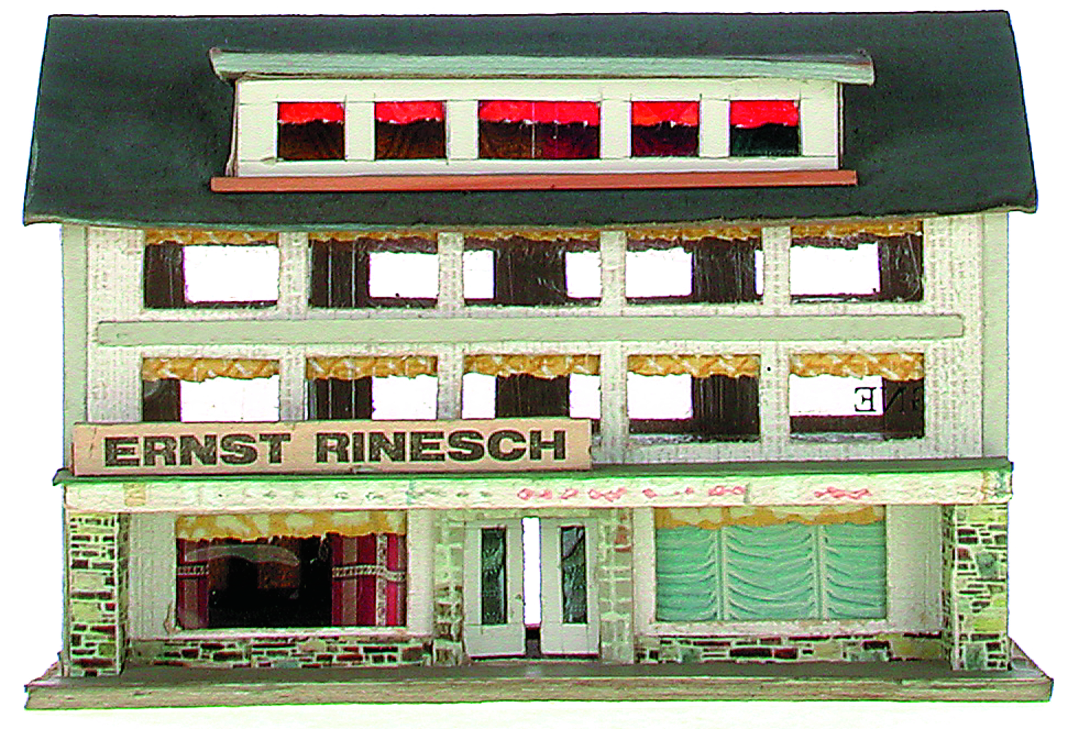 Anmerkung der Redaktion: Nicht von jedem Haus sind alle einzelnen verwendeten Materialien dokumentiert. Tatsächlich verbaute der Bastler auch Zigarettenschachteln, Spinnenpapier, Pappmaschee, Tapetenreste, Bunt- und Silberpapiere, Stoffe, Synthetikfasern, d-c-fix-Folien, Schriftproben, Zeitungsschnipsel und ausgewertete Illustrierte, Kartonagen, Holzabfälle aller Art, Uhu, Holzleim und Tapetenkleister.