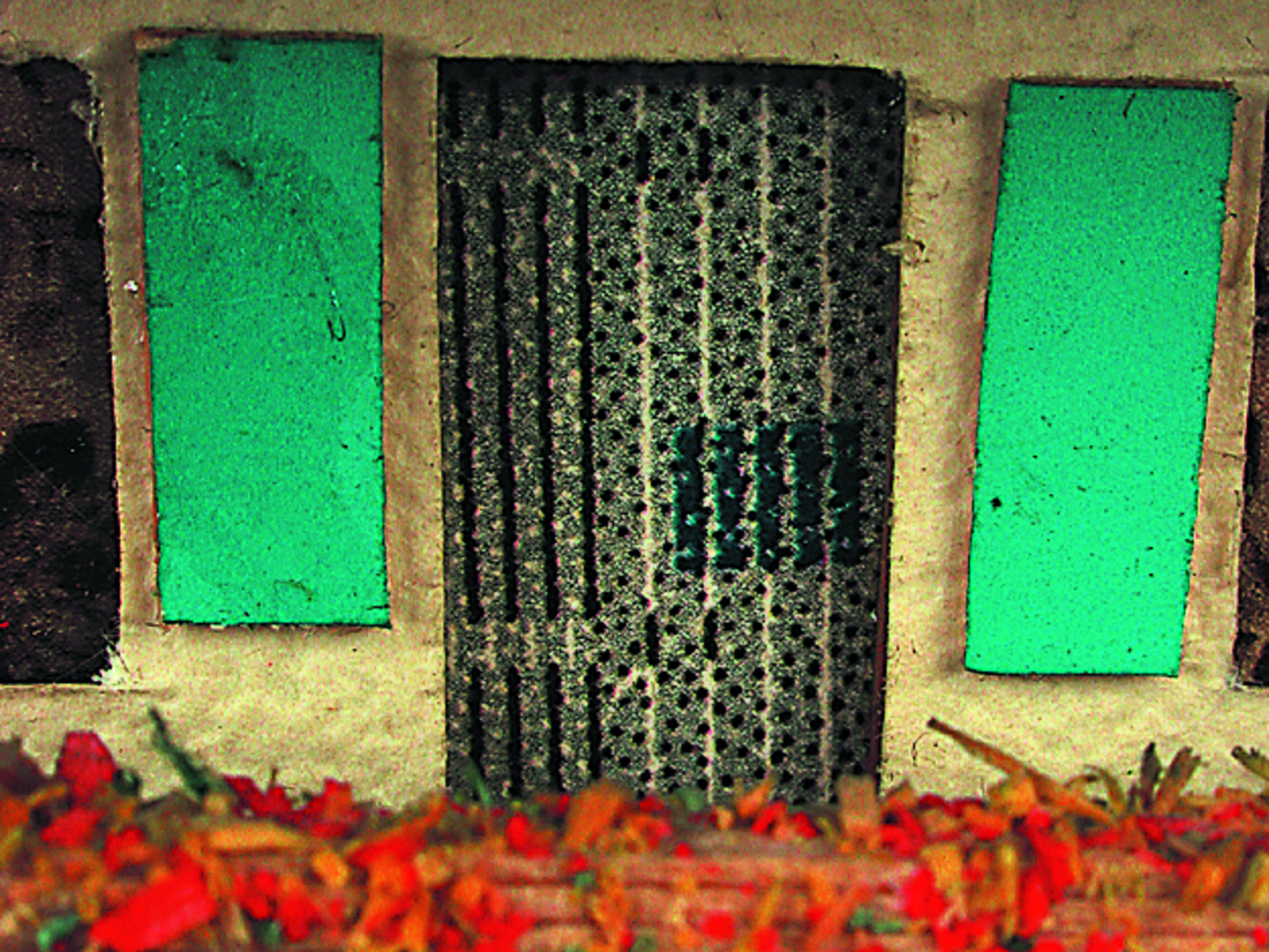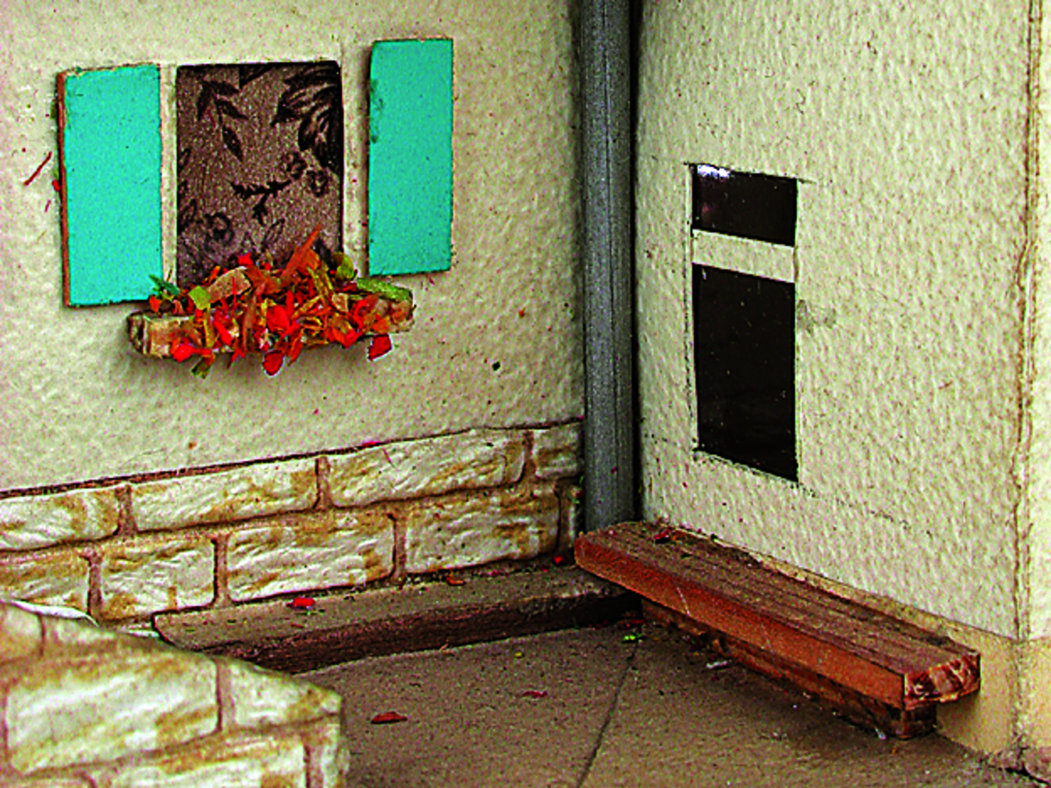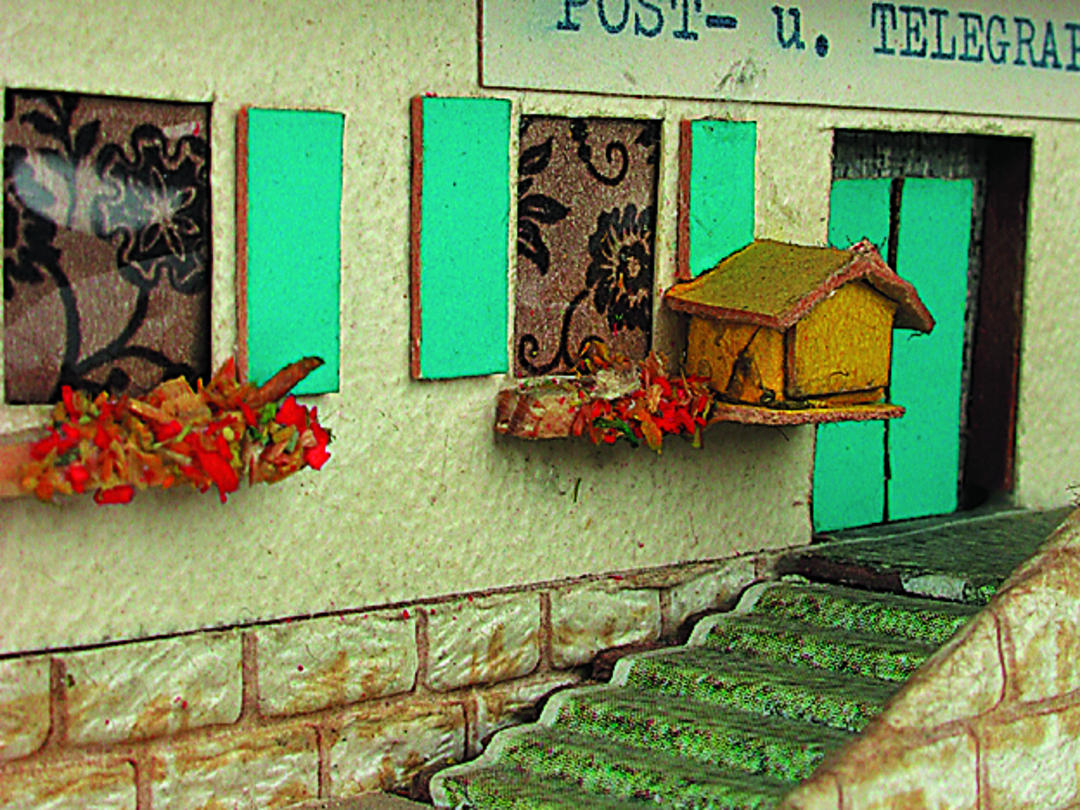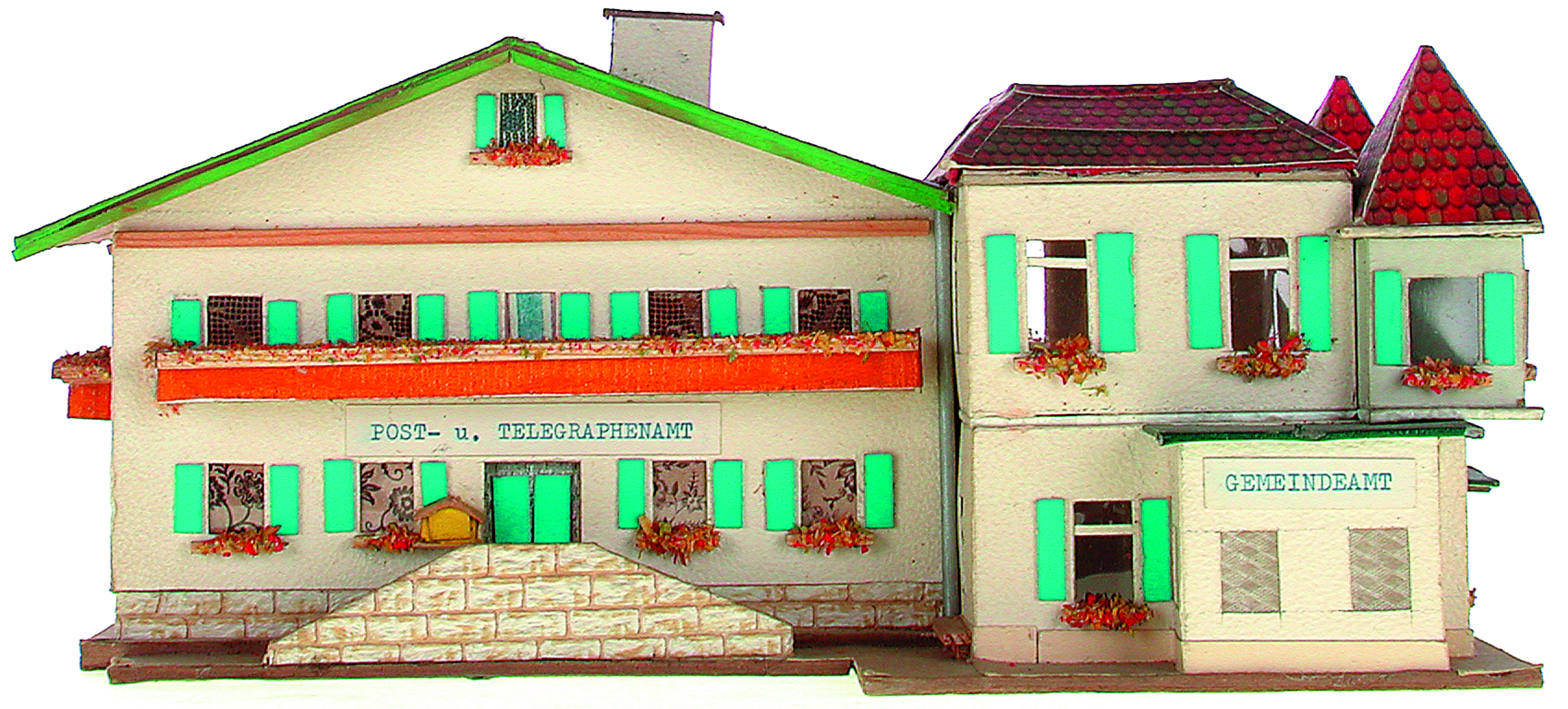 Anmerkung der Redaktion: Nicht von jedem Haus sind alle einzelnen verwendeten Materialien dokumentiert. Tatsächlich verbaute der Bastler auch Zigarettenschachteln, Spinnenpapier, Pappmaschee, Tapetenreste, Bunt- und Silberpapiere, Stoffe, Synthetikfasern, d-c-fix-Folien, Schriftproben, Zeitungsschnipsel und ausgewertete Illustrierte, Kartonagen, Holzabfälle aller Art, Uhu, Holzleim und Tapetenkleister.