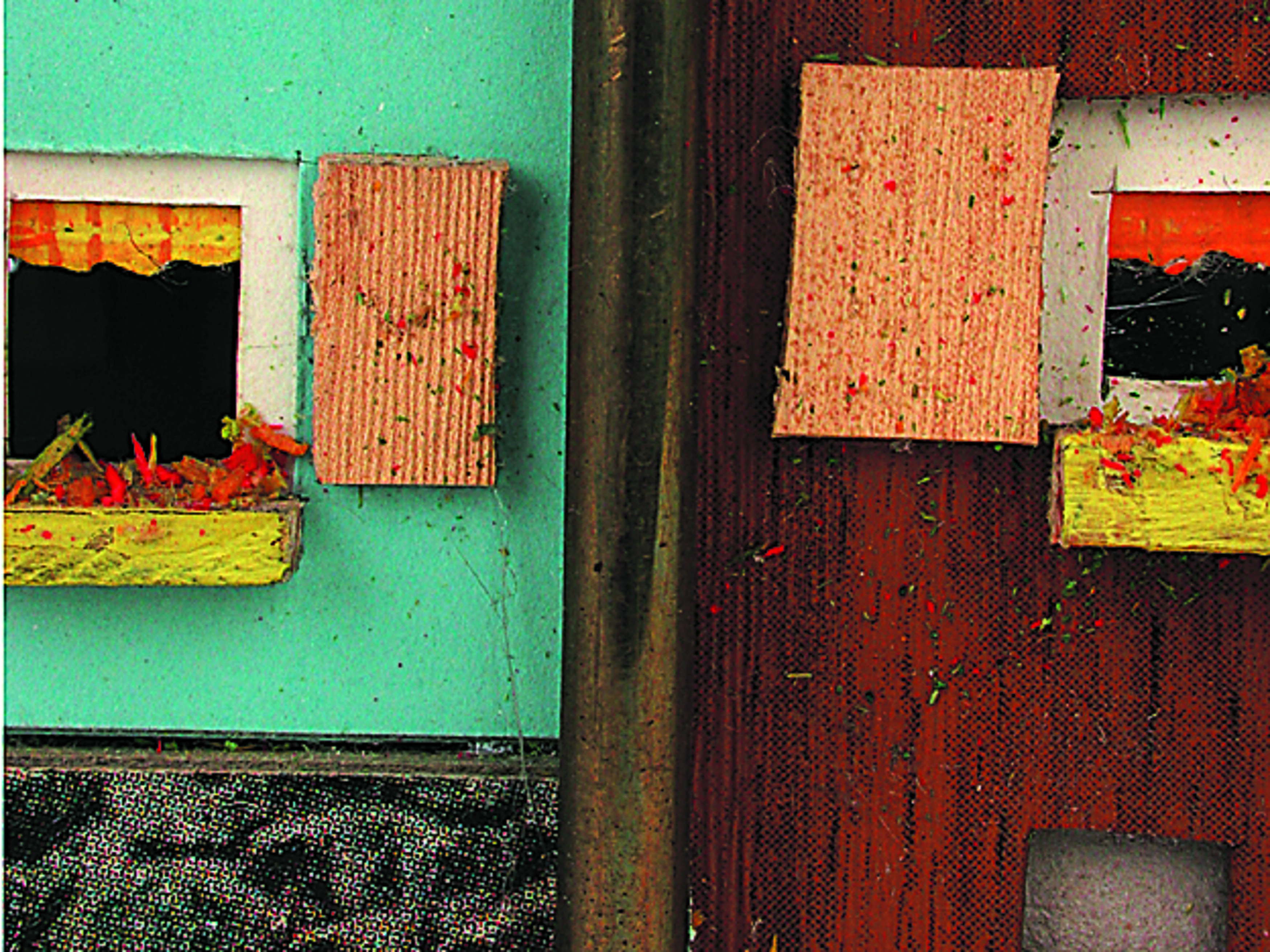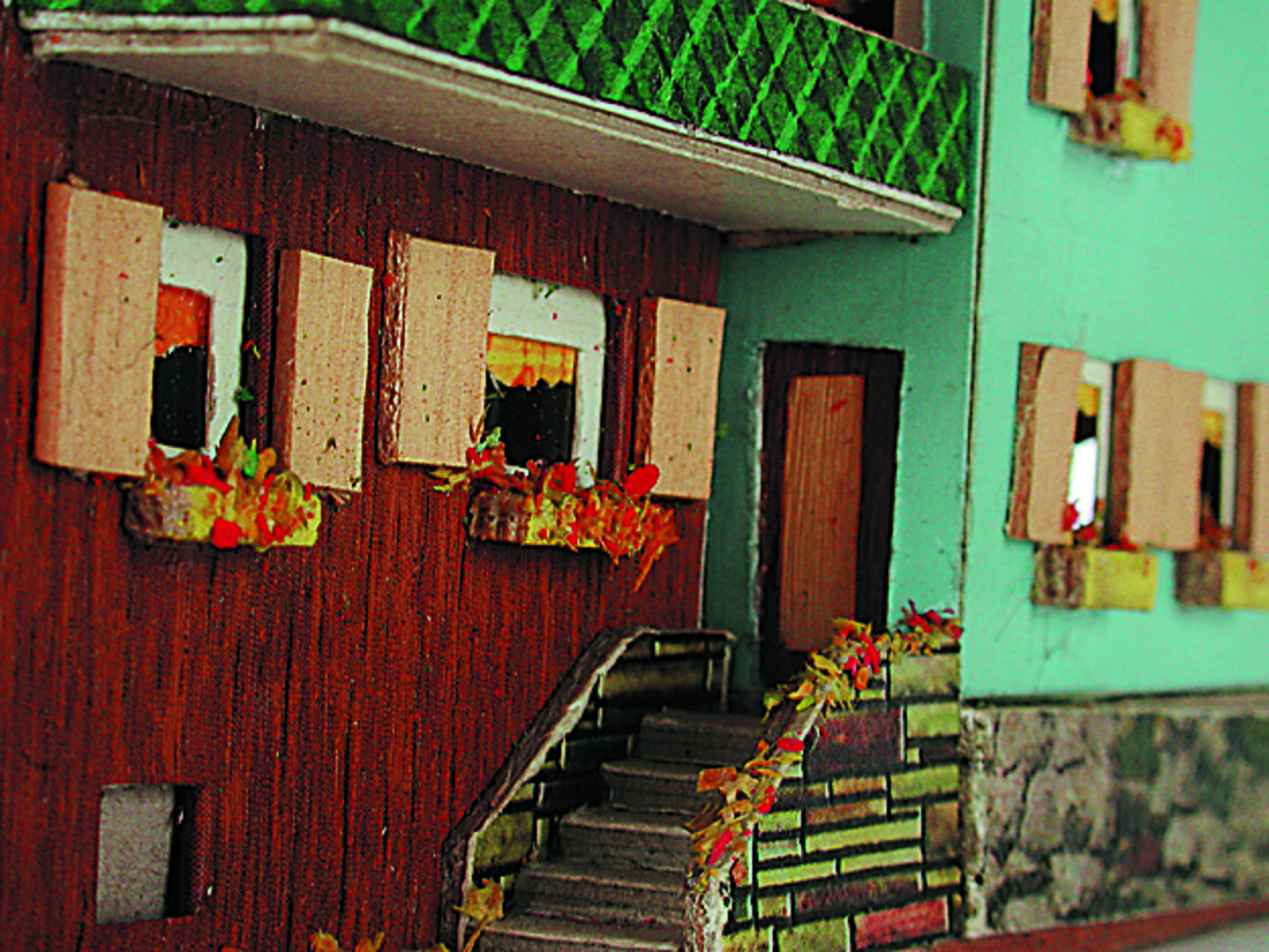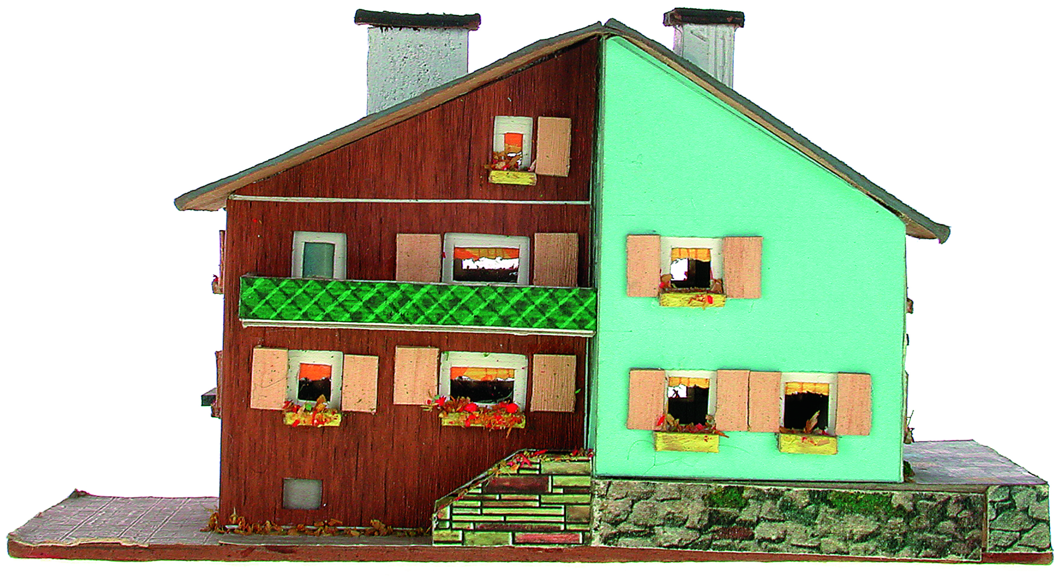 Anmerkung der Redaktion: Nicht von jedem Haus sind alle einzelnen verwendeten Materialien dokumentiert. Tatsächlich verbaute der Bastler auch Zigarettenschachteln, Spinnenpapier, Pappmaschee, Tapetenreste, Bunt- und Silberpapiere, Stoffe, Synthetikfasern, d-c-fix-Folien, Schriftproben, Zeitungsschnipsel und ausgewertete Illustrierte, Kartonagen, Holzabfälle aller Art, Uhu, Holzleim und Tapetenkleister.