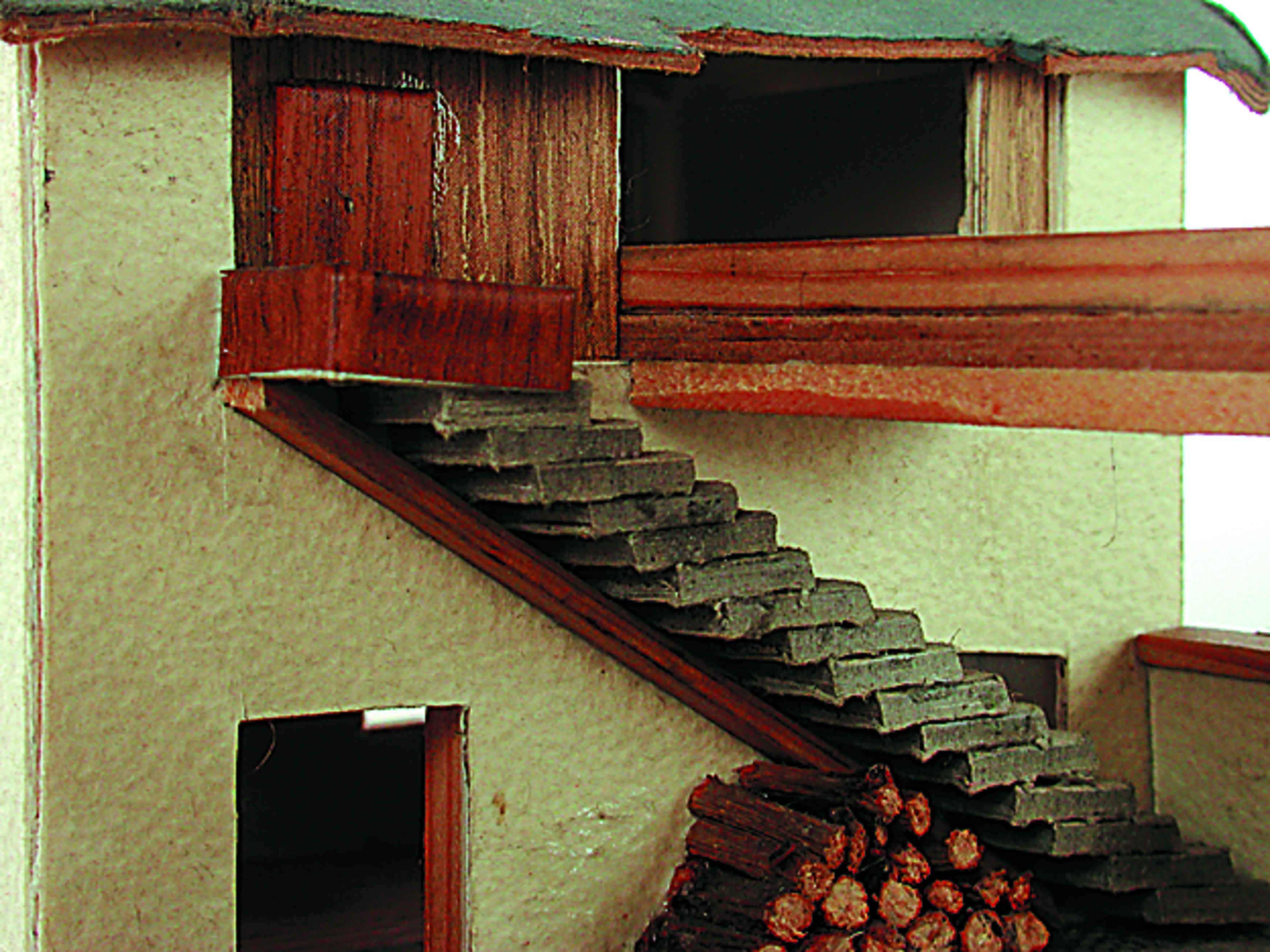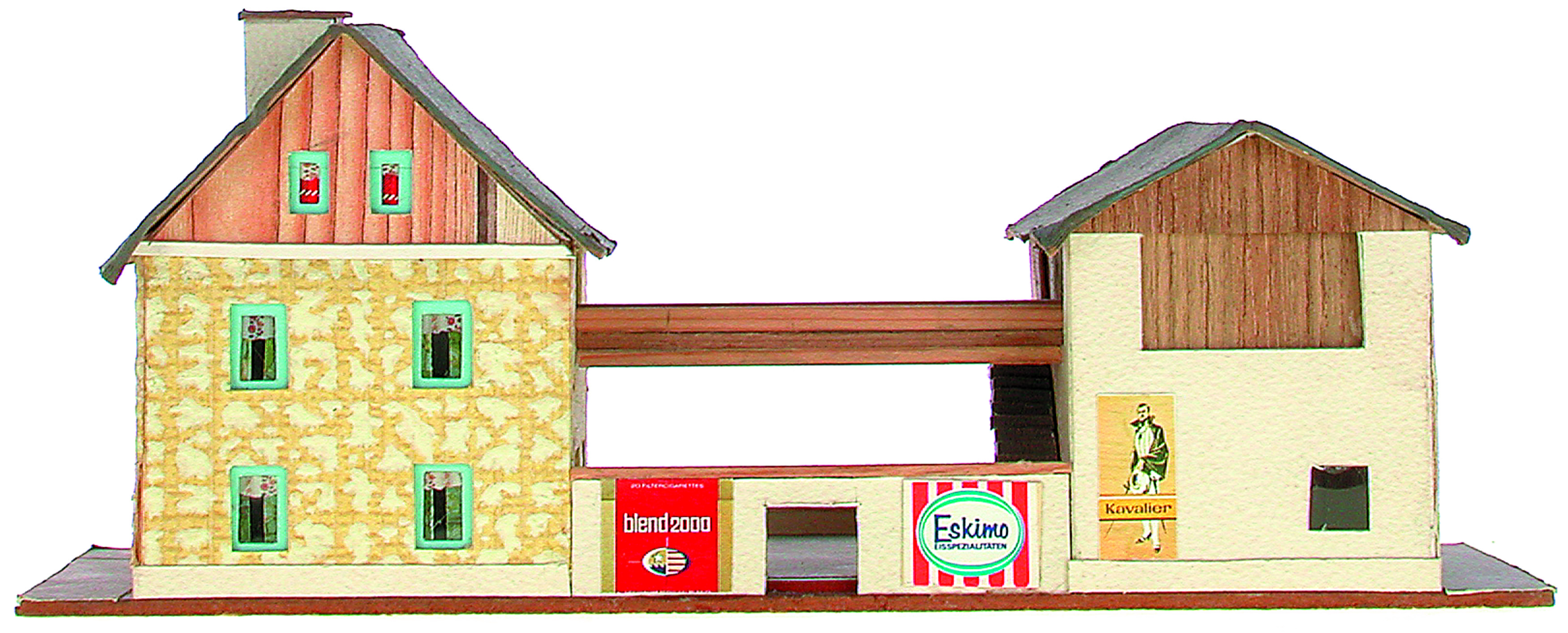 Anmerkung der Redaktion: Nicht von jedem Haus sind alle einzelnen verwendeten Materialien dokumentiert. Tatsächlich verbaute der Bastler auch Zigarettenschachteln, Spinnenpapier, Pappmaschee, Tapetenreste, Bunt- und Silberpapiere, Stoffe, Synthetikfasern, d-c-fix-Folien, Schriftproben, Zeitungsschnipsel und ausgewertete Illustrierte, Kartonagen, Holzabfälle aller Art, Uhu, Holzleim und Tapetenkleister.