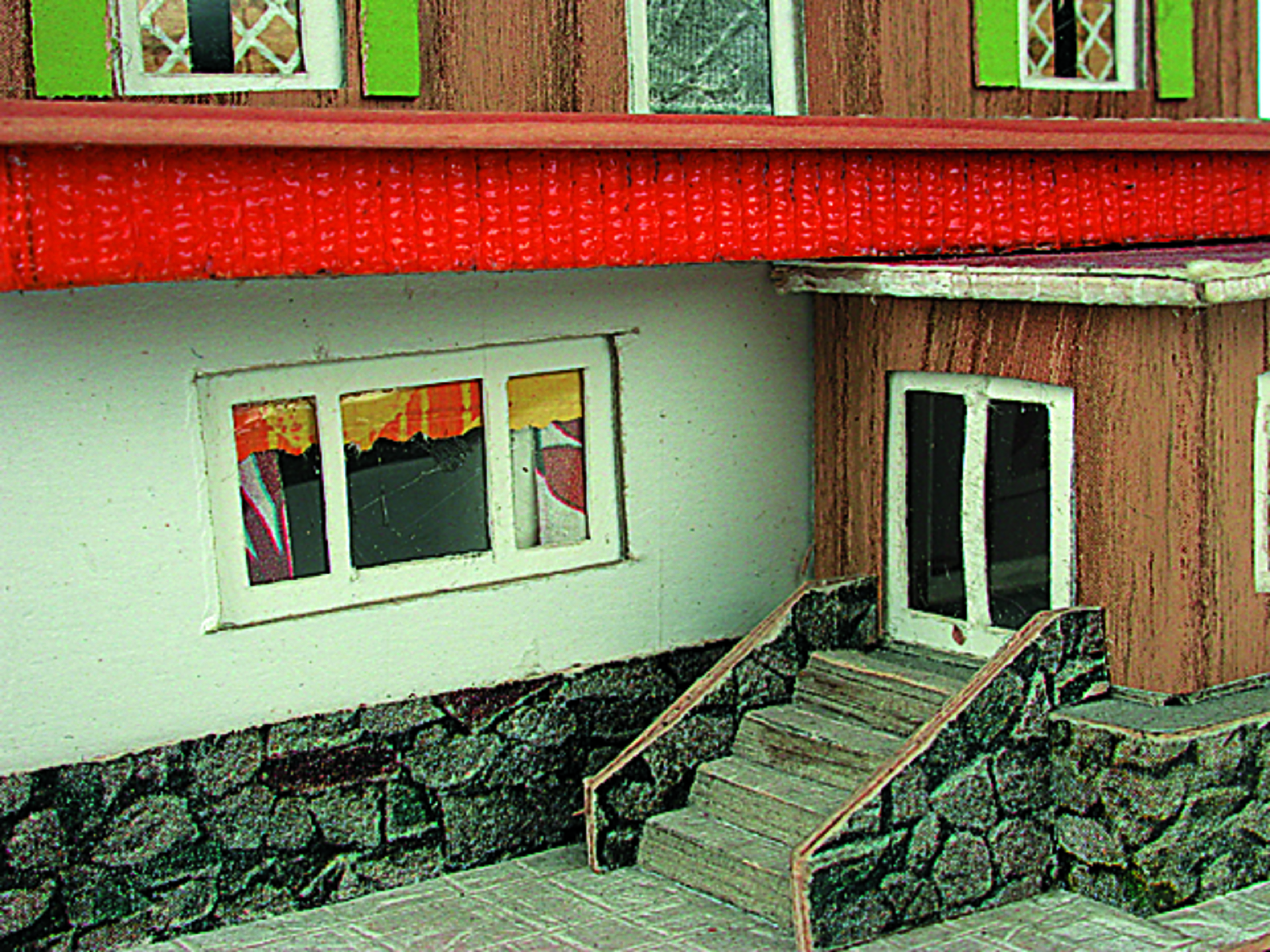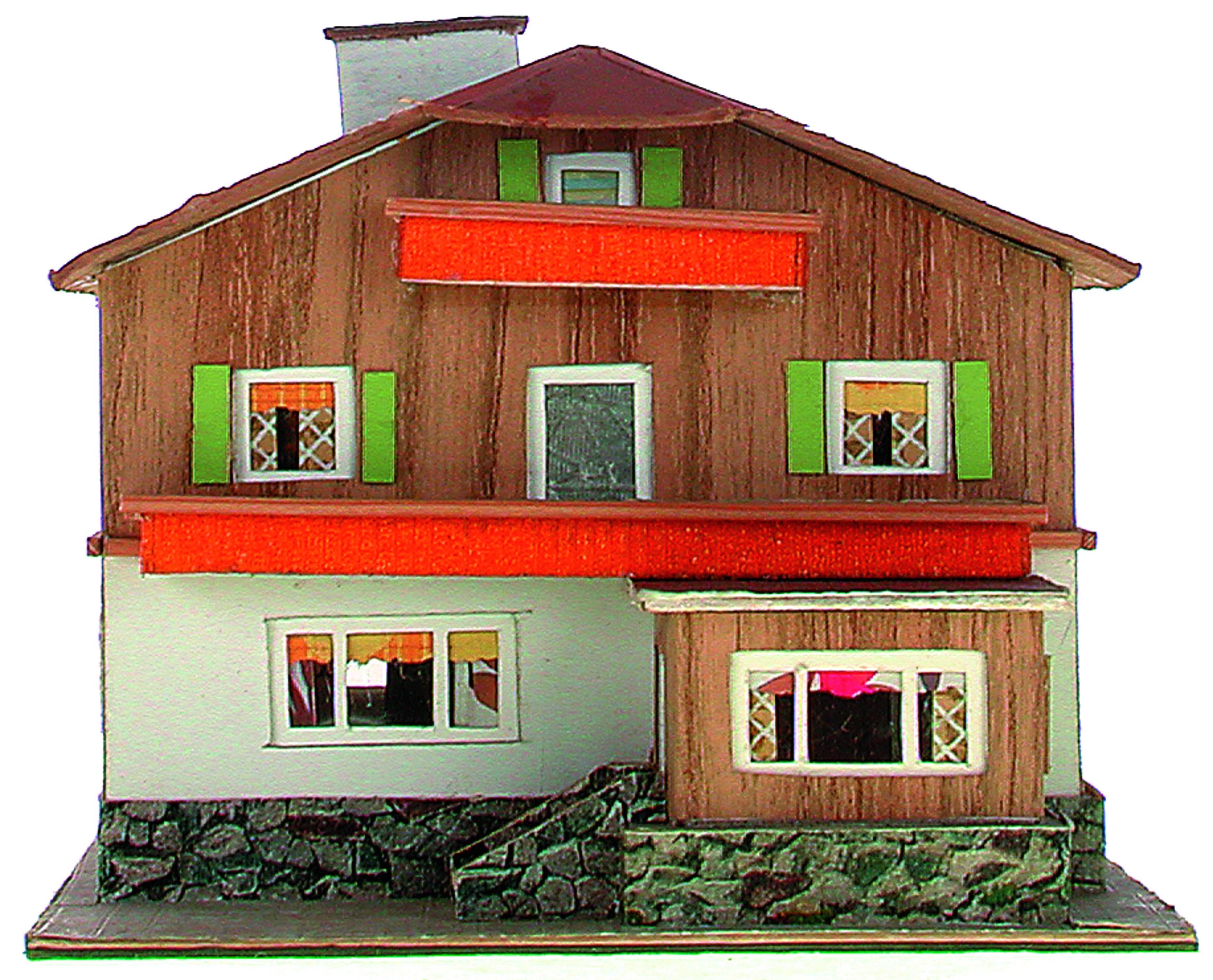 Anmerkung der Redaktion: Nicht von jedem Haus sind alle einzelnen verwendeten Materialien dokumentiert. Tatsächlich verbaute der Bastler auch Zigarettenschachteln, Spinnenpapier, Pappmaschee, Tapetenreste, Bunt- und Silberpapiere, Stoffe, Synthetikfasern, d-c-fix-Folien, Schriftproben, Zeitungsschnipsel und ausgewertete Illustrierte, Kartonagen, Holzabfälle aller Art, Uhu, Holzleim und Tapetenkleister.
