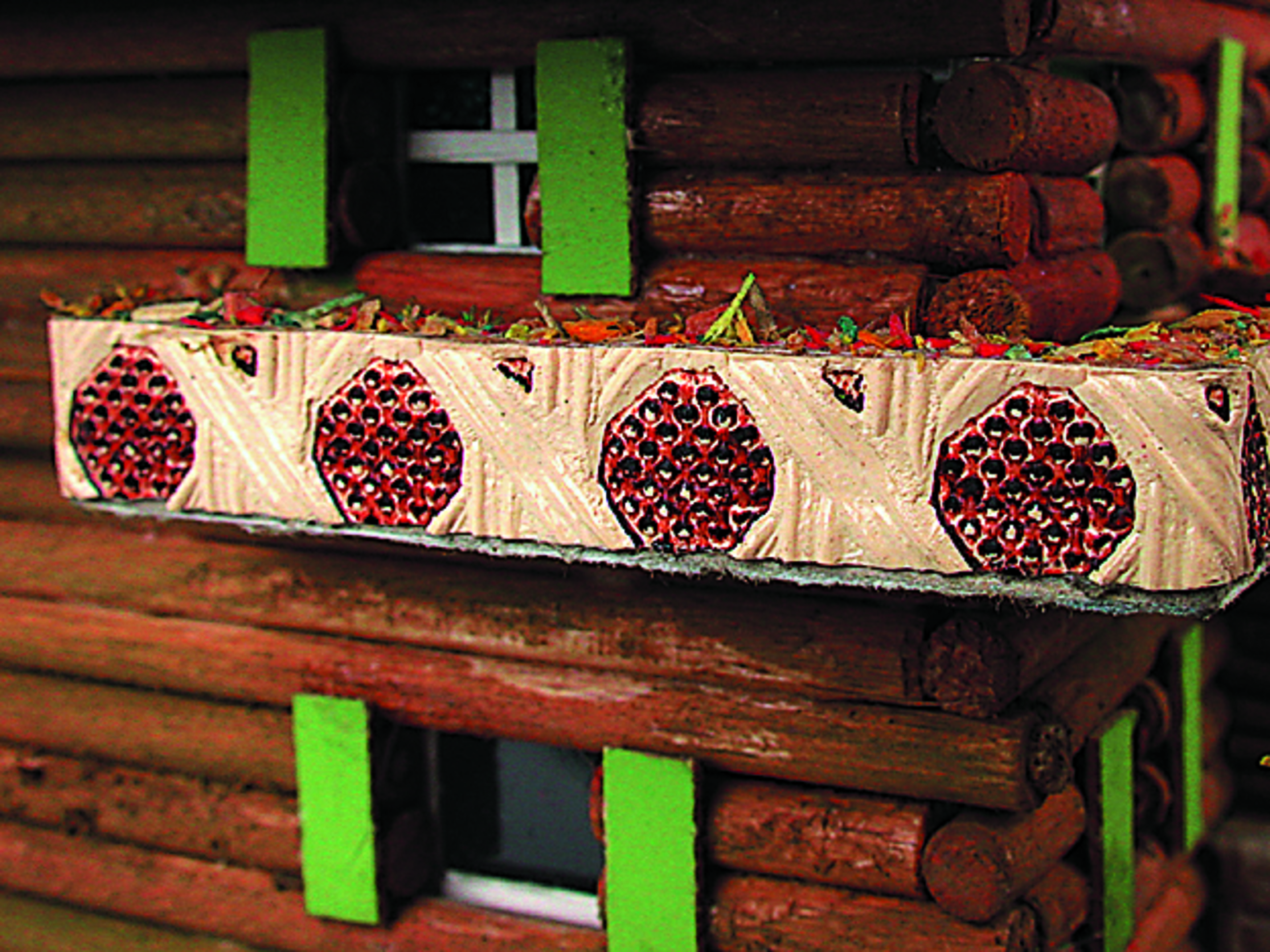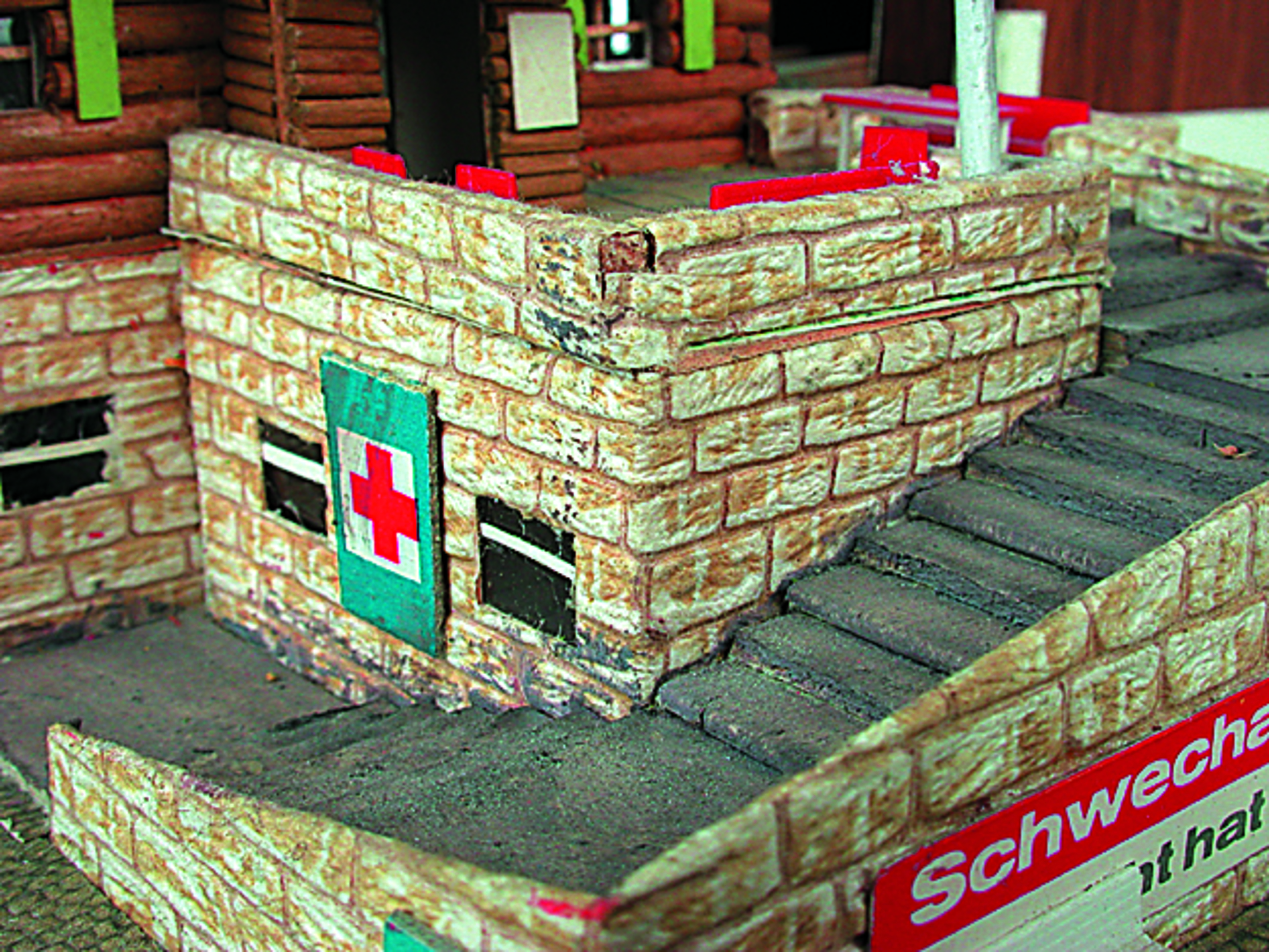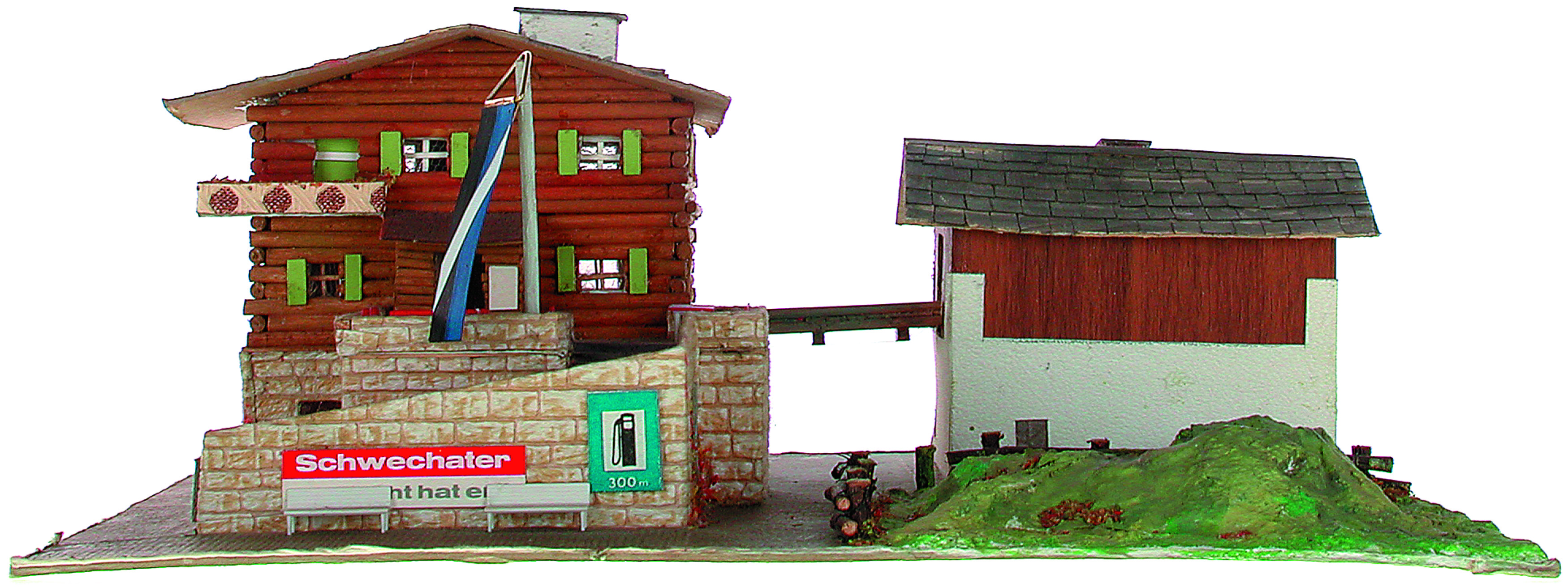Anmerkung der Redaktion: Nicht von jedem Haus sind alle einzelnen verwendeten Materialien dokumentiert. Tatsächlich verbaute der Bastler auch Zigarettenschachteln, Spinnenpapier, Pappmaschee, Tapetenreste, Bunt- und Silberpapiere, Stoffe, Synthetikfasern, d-c-fix-Folien, Schriftproben, Zeitungsschnipsel und ausgewertete Illustrierte, Kartonagen, Holzabfälle aller Art, Uhu, Holzleim und Tapetenkleister.