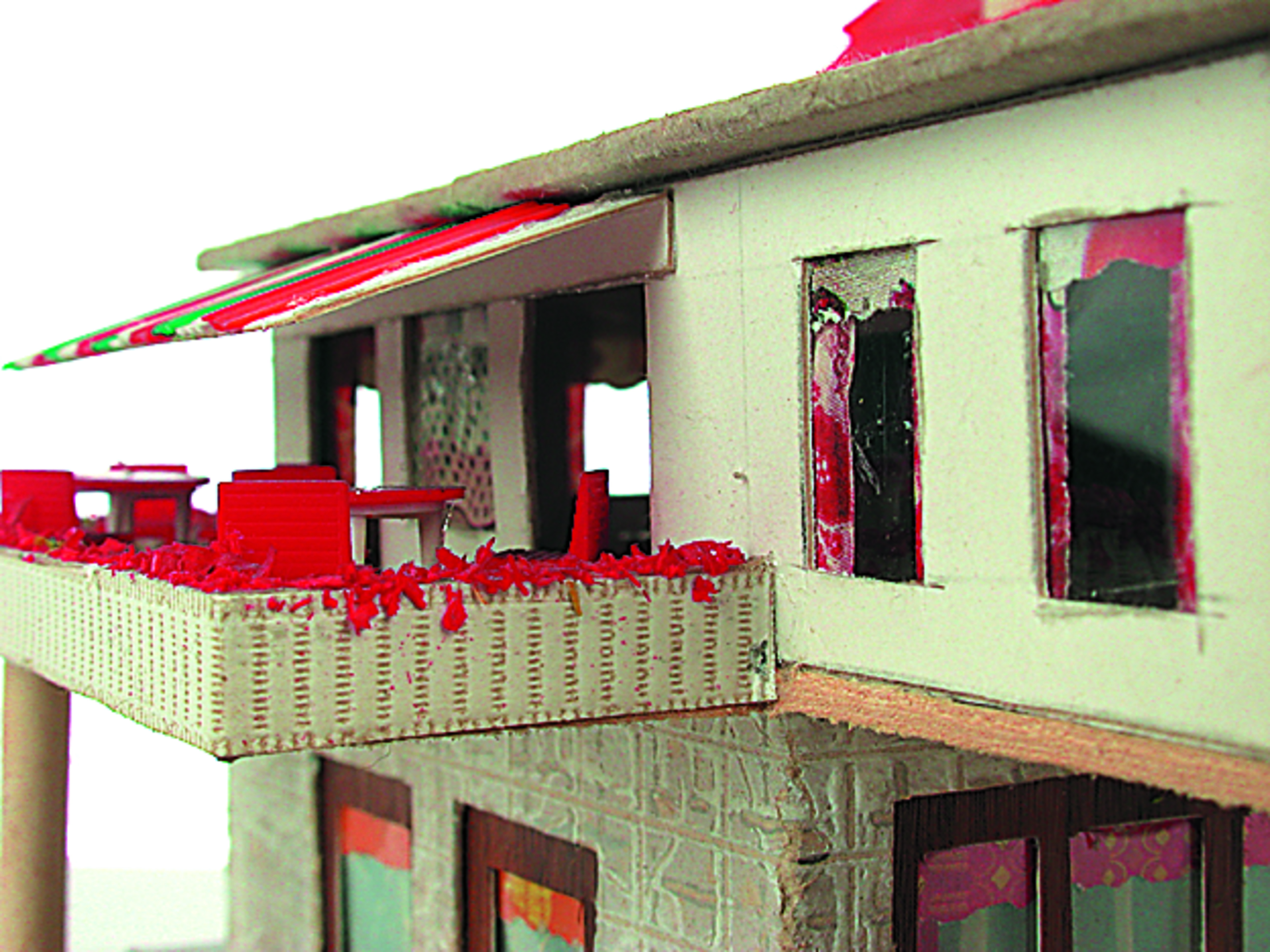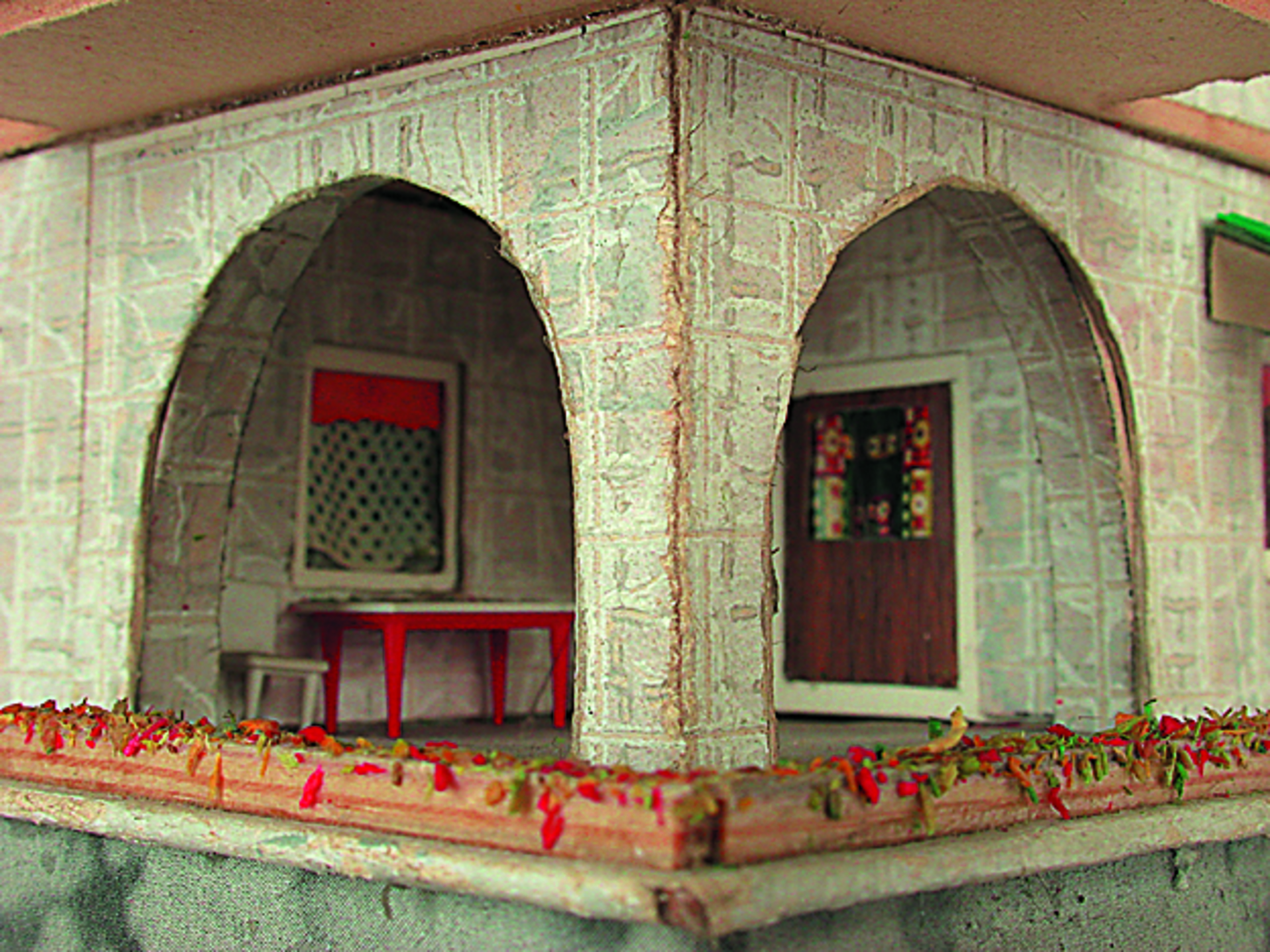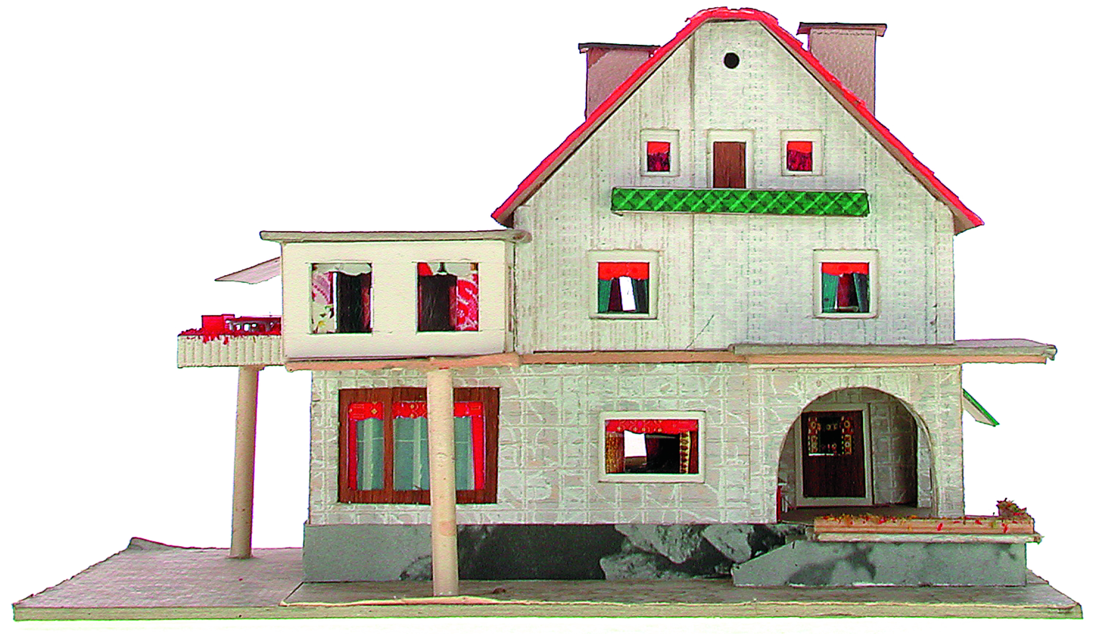 Anmerkung der Redaktion: Nicht von jedem Haus sind alle einzelnen verwendeten Materialien dokumentiert. Tatsächlich verbaute der Bastler auch Zigarettenschachteln, Spinnenpapier, Pappmaschee, Tapetenreste, Bunt- und Silberpapiere, Stoffe, Synthetikfasern, d-c-fix-Folien, Schriftproben, Zeitungsschnipsel und ausgewertete Illustrierte, Kartonagen, Holzabfälle aller Art, Uhu, Holzleim und Tapetenkleister.