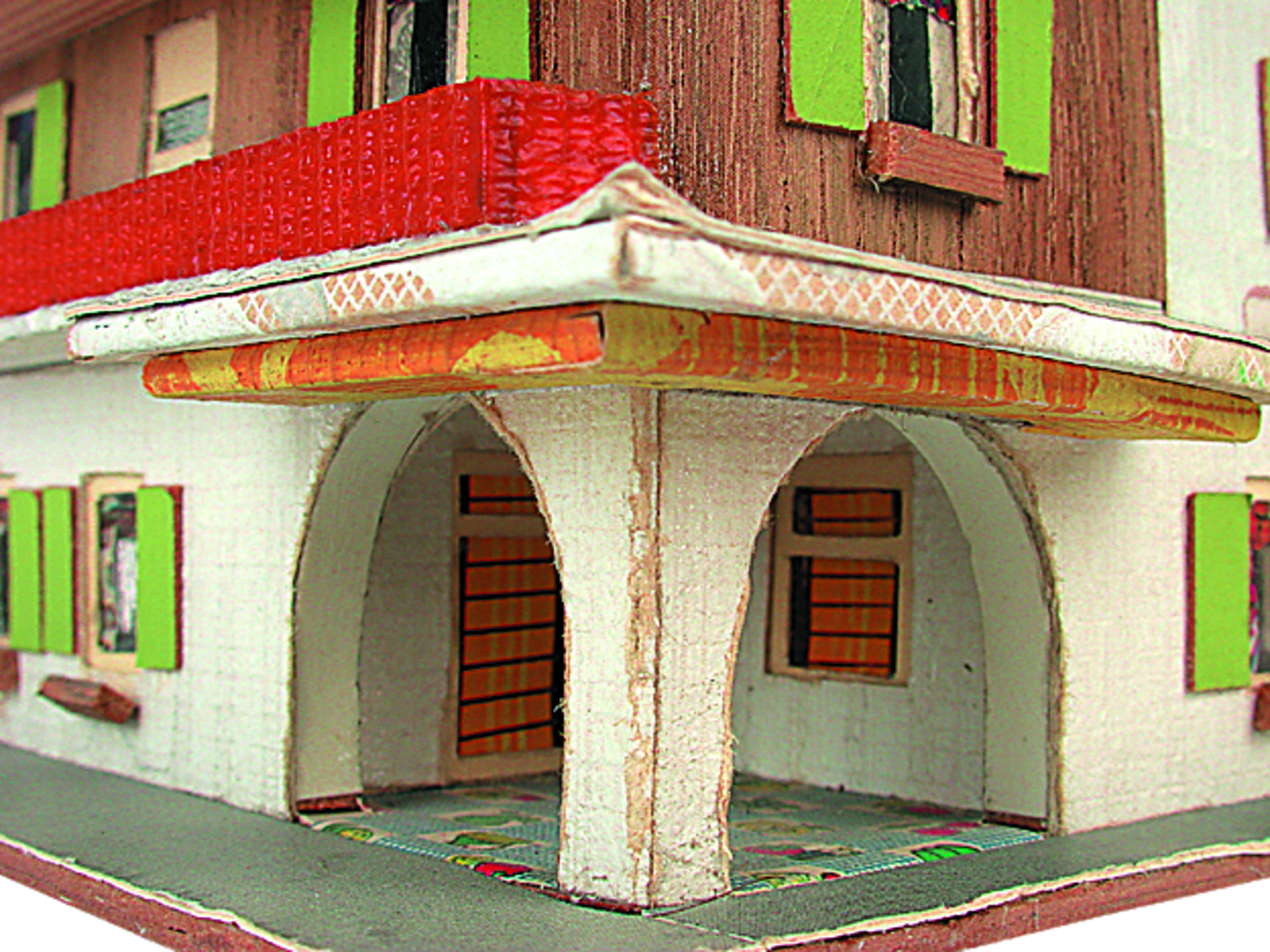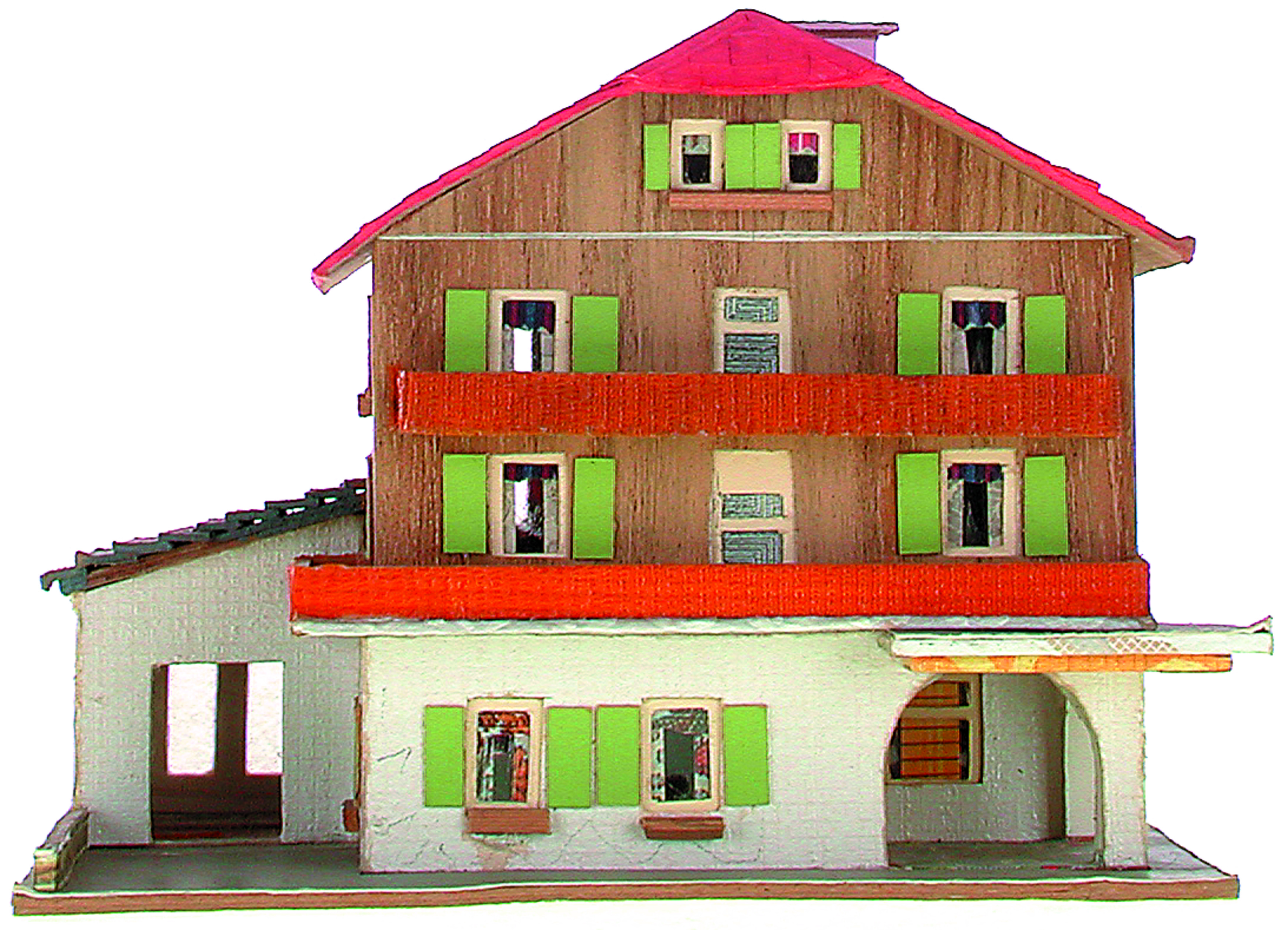 Anmerkung der Redaktion: Nicht von jedem Haus sind alle einzelnen verwendeten Materialien dokumentiert. Tatsächlich verbaute der Bastler auch Zigarettenschachteln, Spinnenpapier, Pappmaschee, Tapetenreste, Bunt- und Silberpapiere, Stoffe, Synthetikfasern, d-c-fix-Folien, Schriftproben, Zeitungsschnipsel und ausgewertete Illustrierte, Kartonagen, Holzabfälle aller Art, Uhu, Holzleim und Tapetenkleister.