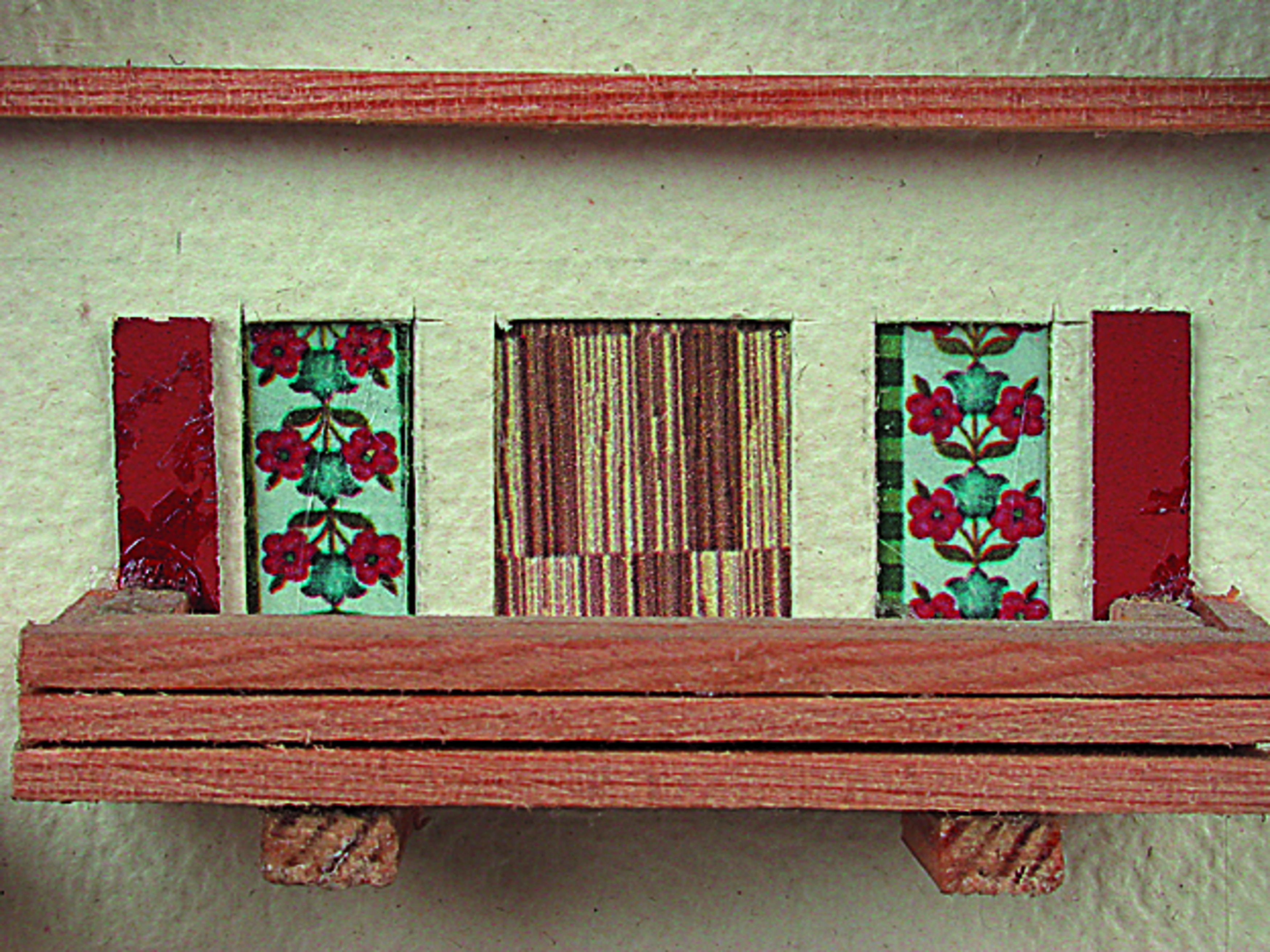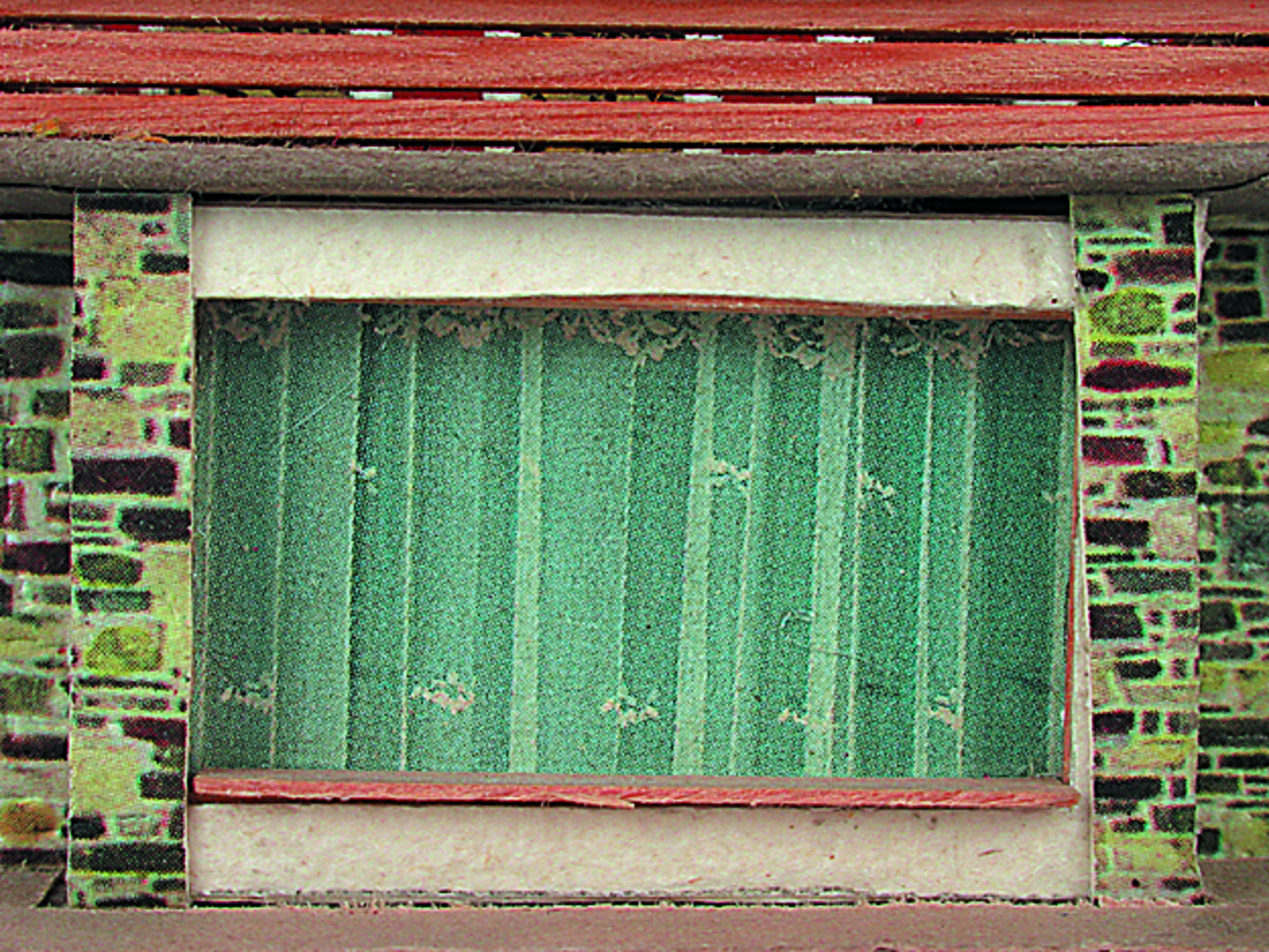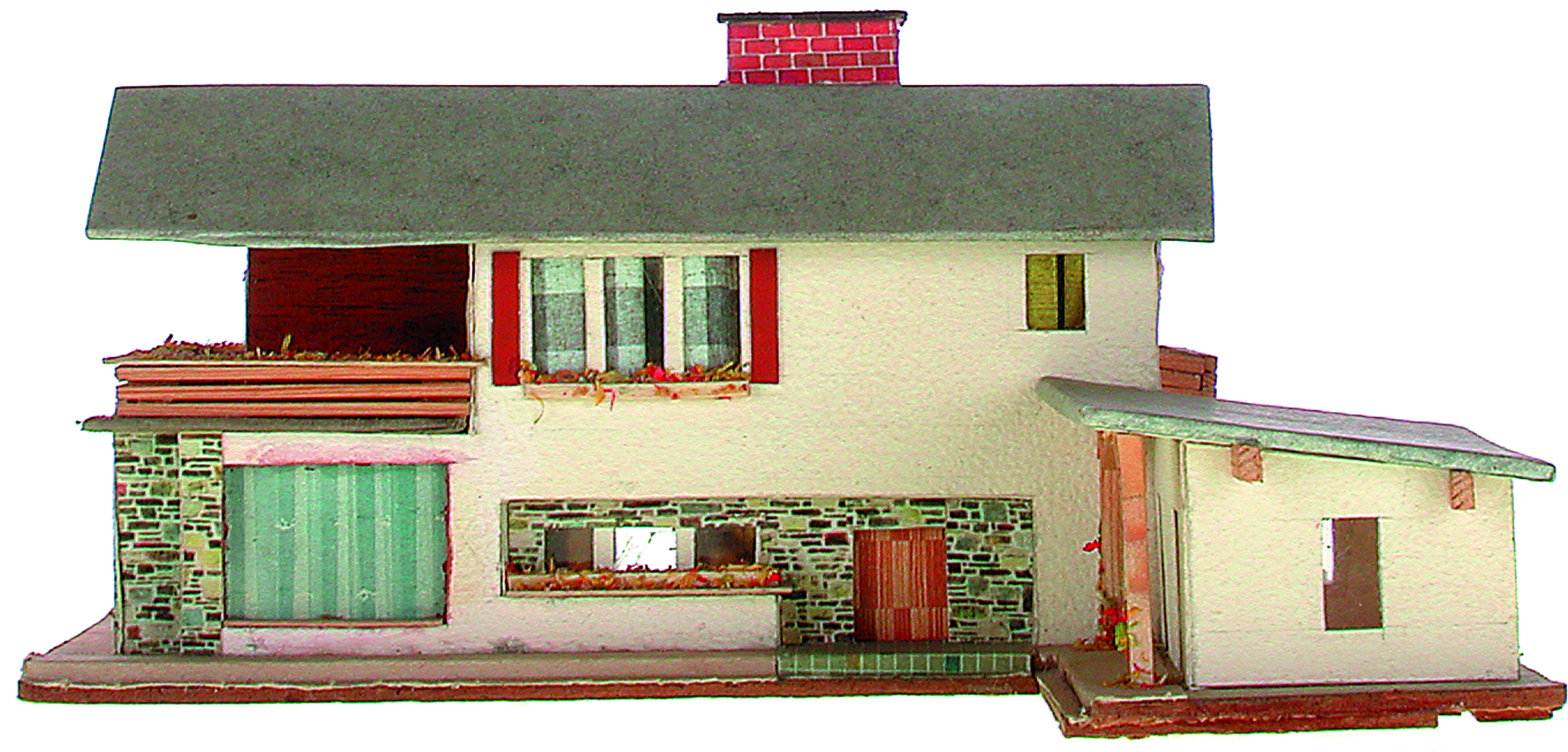 Anmerkung der Redaktion: Nicht von jedem Haus sind alle einzelnen verwendeten Materialien dokumentiert. Tatsächlich verbaute der Bastler auch Zigarettenschachteln, Spinnenpapier, Pappmaschee, Tapetenreste, Bunt- und Silberpapiere, Stoffe, Synthetikfasern, d-c-fix-Folien, Schriftproben, Zeitungsschnipsel und ausgewertete Illustrierte, Kartonagen, Holzabfälle aller Art, Uhu, Holzleim und Tapetenkleister.