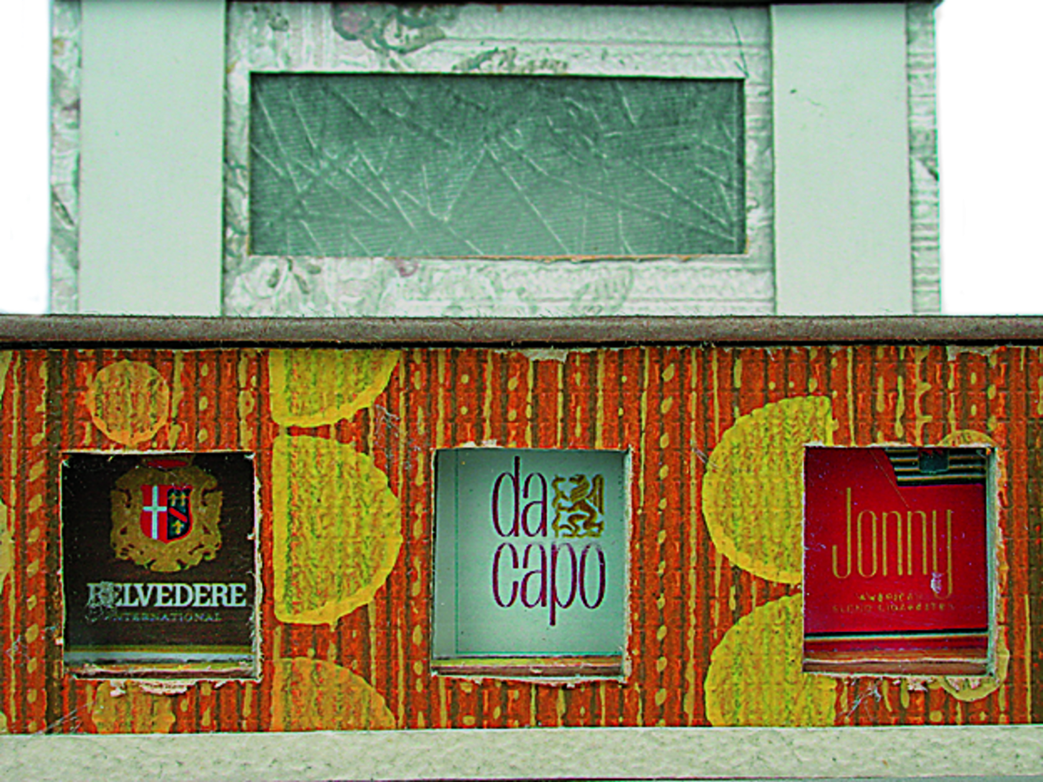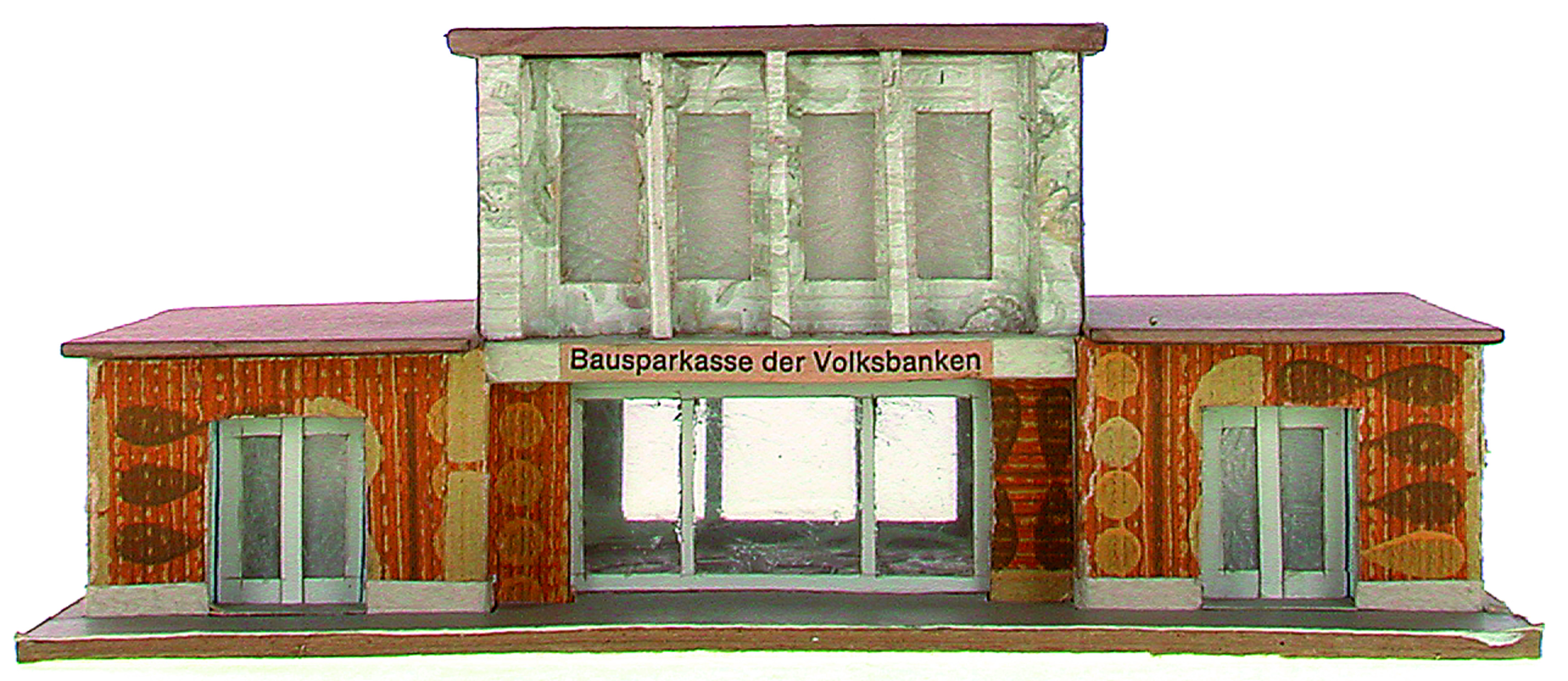Anmerkung der Redaktion: Nicht von jedem Haus sind alle einzelnen verwendeten Materialien dokumentiert. Tatsächlich verbaute der Bastler auch Zigarettenschachteln, Spinnenpapier, Pappmaschee, Tapetenreste, Bunt- und Silberpapiere, Stoffe, Synthetikfasern, d-c-fix-Folien, Schriftproben, Zeitungsschnipsel und ausgewertete Illustrierte, Kartonagen, Holzabfälle aller Art, Uhu, Holzleim und Tapetenkleister.