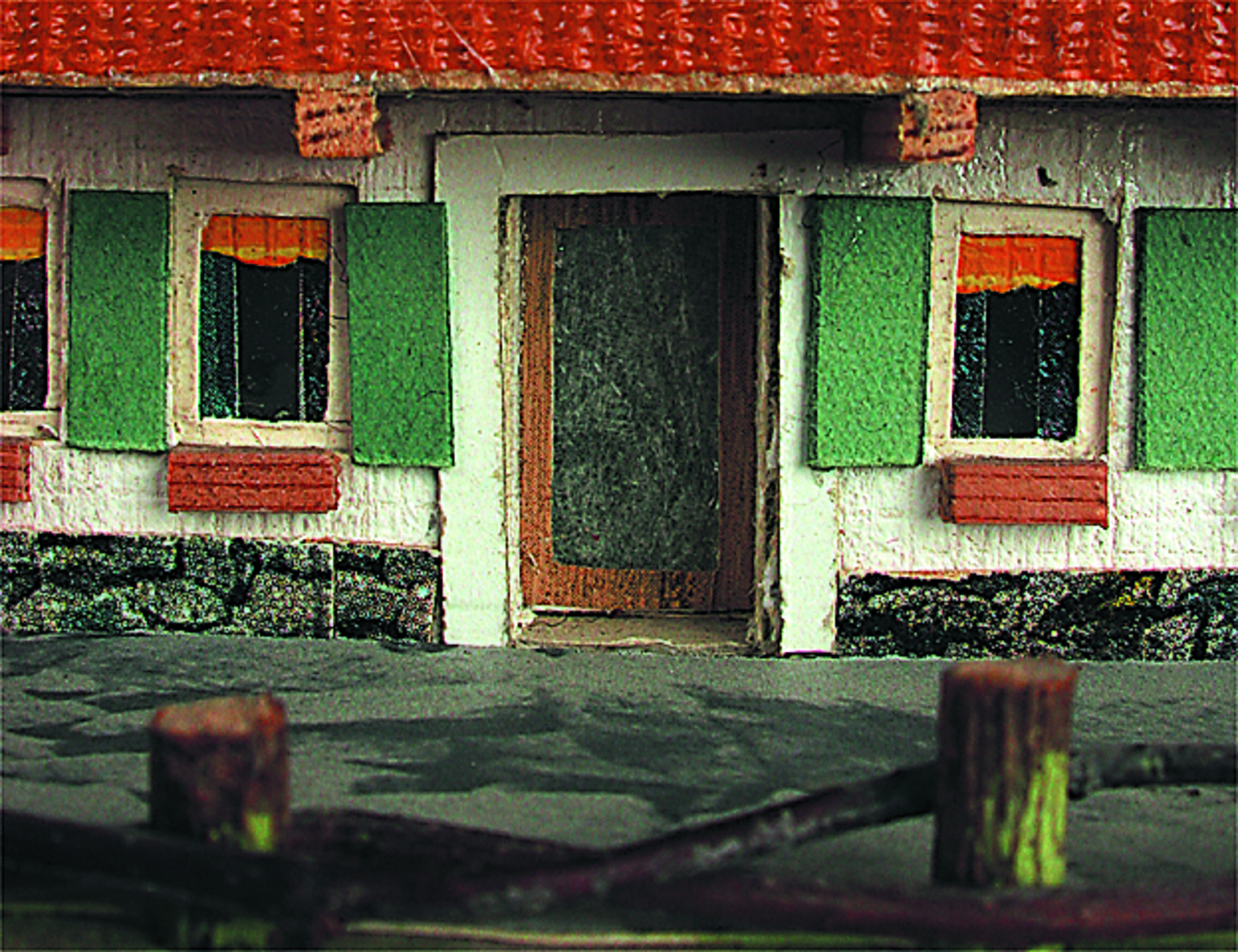 Anmerkung der Redaktion: Nicht von jedem Haus sind alle einzelnen verwendeten Materialien dokumentiert. Tatsächlich verbaute der Bastler auch Zigarettenschachteln, Spinnenpapier, Pappmaschee, Tapetenreste, Bunt- und Silberpapiere, Stoffe, Synthetikfasern, d-c-fix-Folien, Schriftproben, Zeitungsschnipsel und ausgewertete Illustrierte, Kartonagen, Holzabfälle aller Art, Uhu, Holzleim und Tapetenkleister.