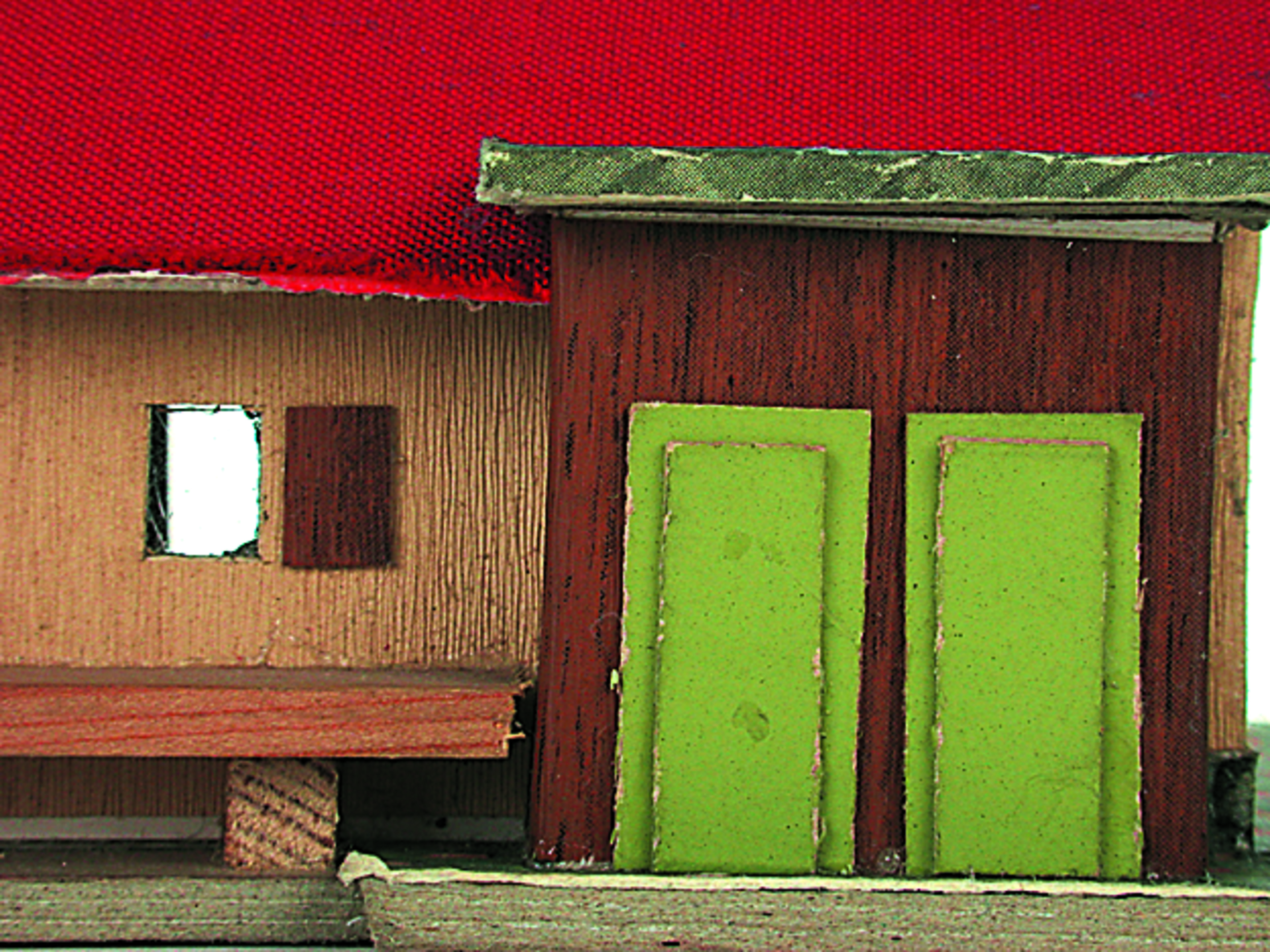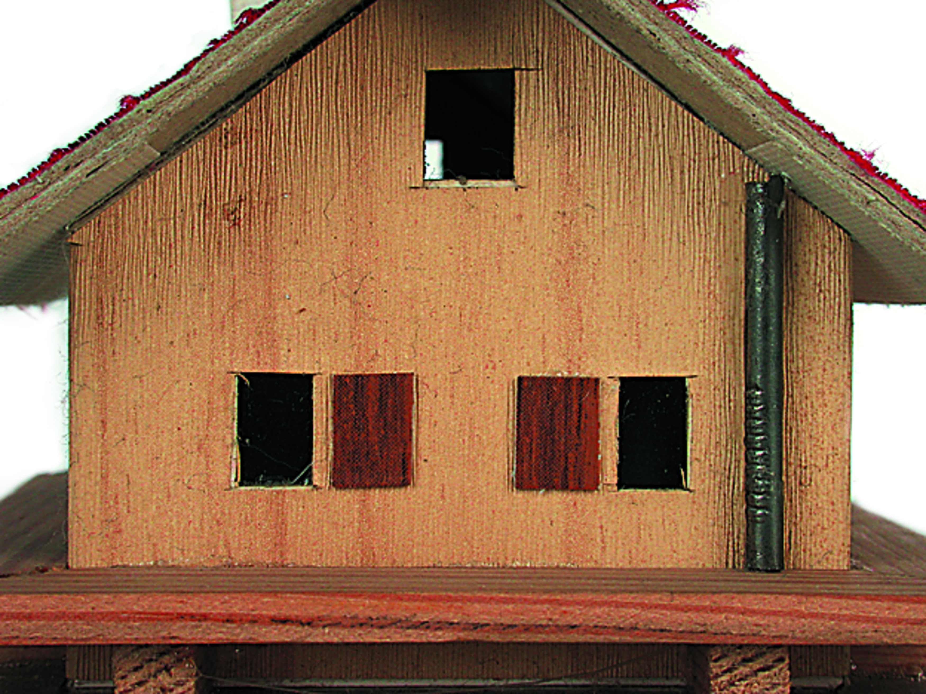 Anmerkung der Redaktion: Nicht von jedem Haus sind alle einzelnen verwendeten Materialien dokumentiert. Tatsächlich verbaute der Bastler auch Zigarettenschachteln, Spinnenpapier, Pappmaschee, Tapetenreste, Bunt- und Silberpapiere, Stoffe, Synthetikfasern, d-c-fix-Folien, Schriftproben, Zeitungsschnipsel und ausgewertete Illustrierte, Kartonagen, Holzabfälle aller Art, Uhu, Holzleim und Tapetenkleister.