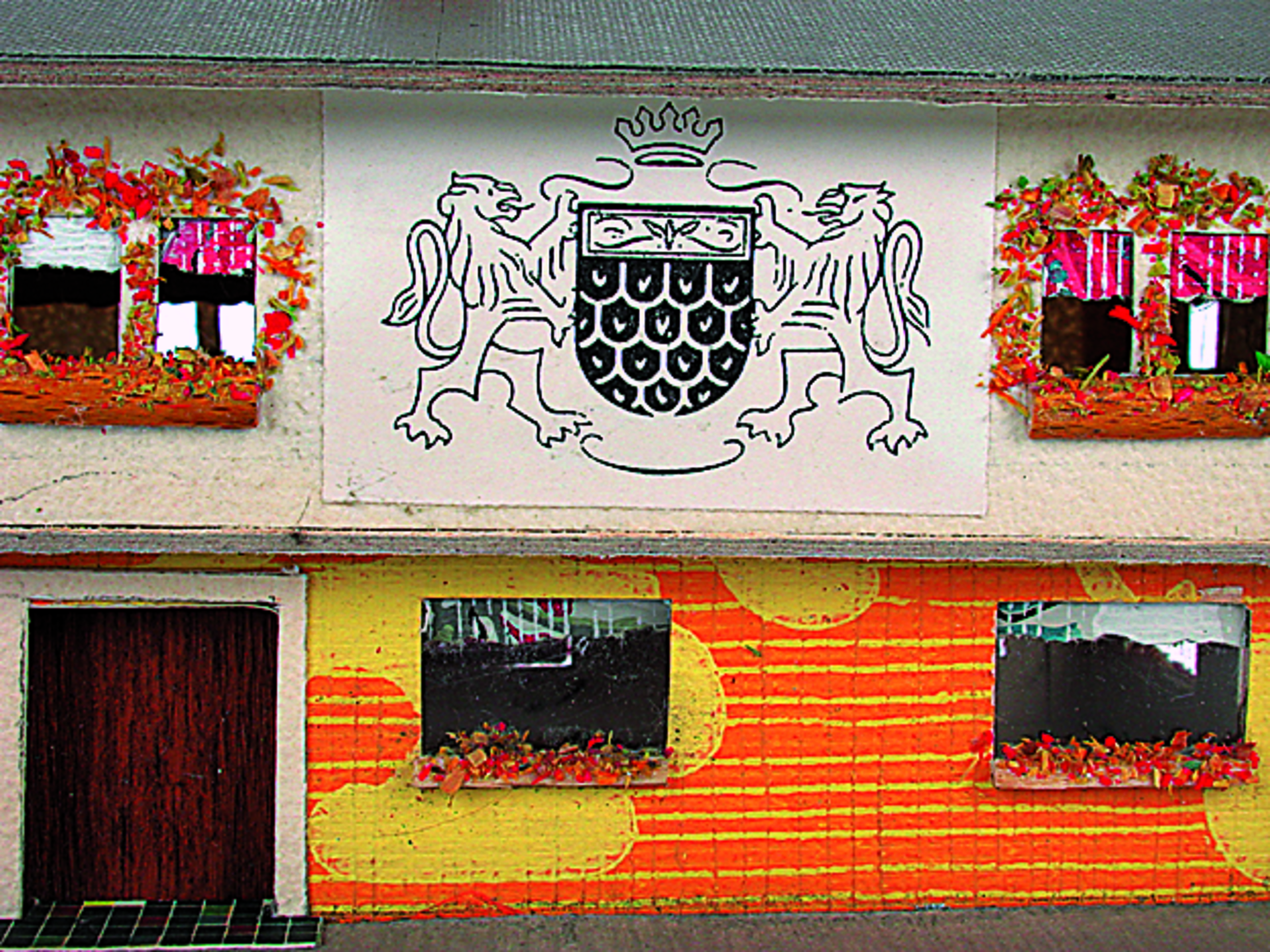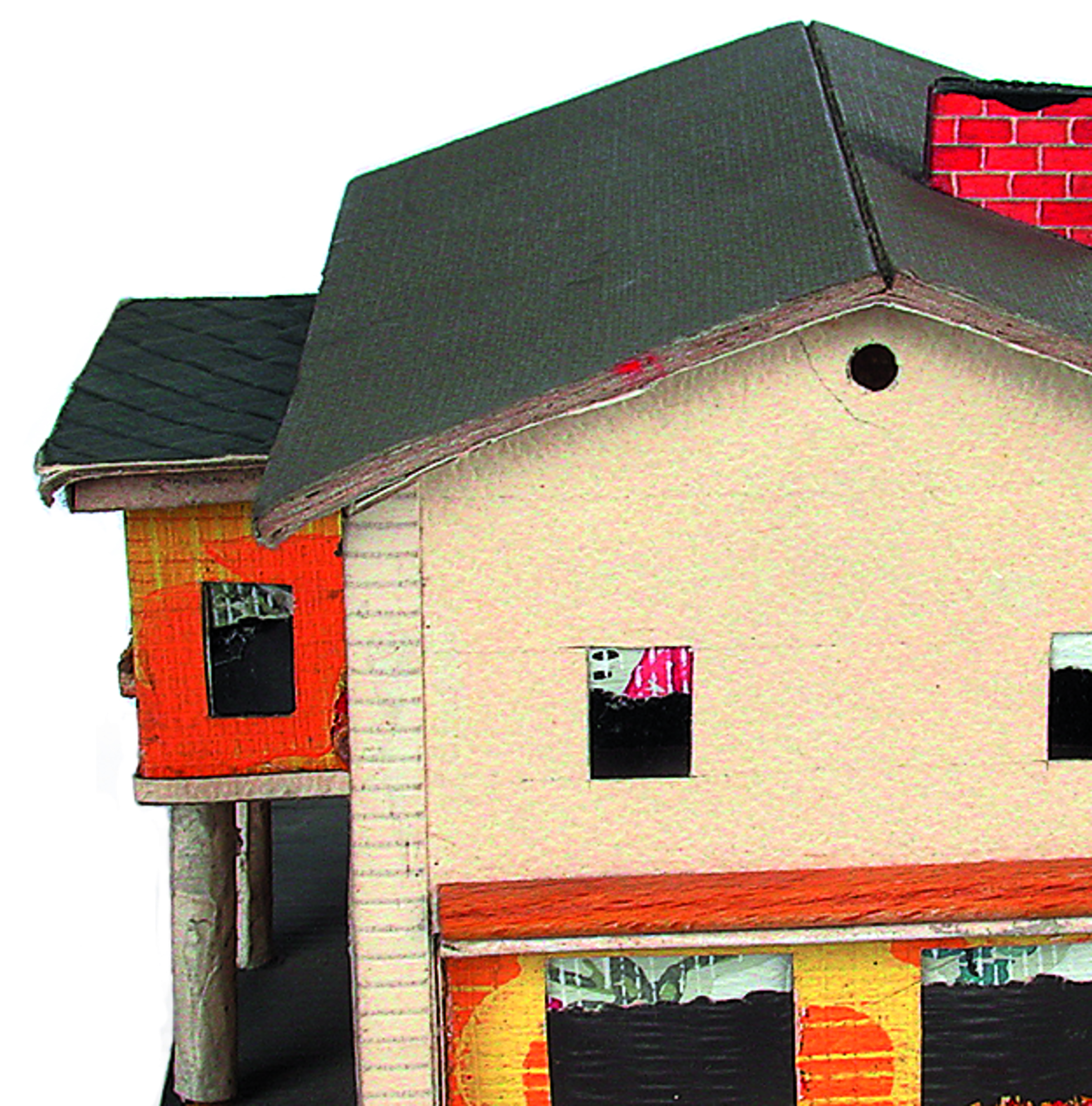 Anmerkung der Redaktion: Nicht von jedem Haus sind alle einzelnen verwendeten Materialien dokumentiert. Tatsächlich verbaute der Bastler auch Zigarettenschachteln, Spinnenpapier, Pappmaschee, Tapetenreste, Bunt- und Silberpapiere, Stoffe, Synthetikfasern, d-c-fix-Folien, Schriftproben, Zeitungsschnipsel und ausgewertete Illustrierte, Kartonagen, Holzabfälle aller Art, Uhu, Holzleim und Tapetenkleister.