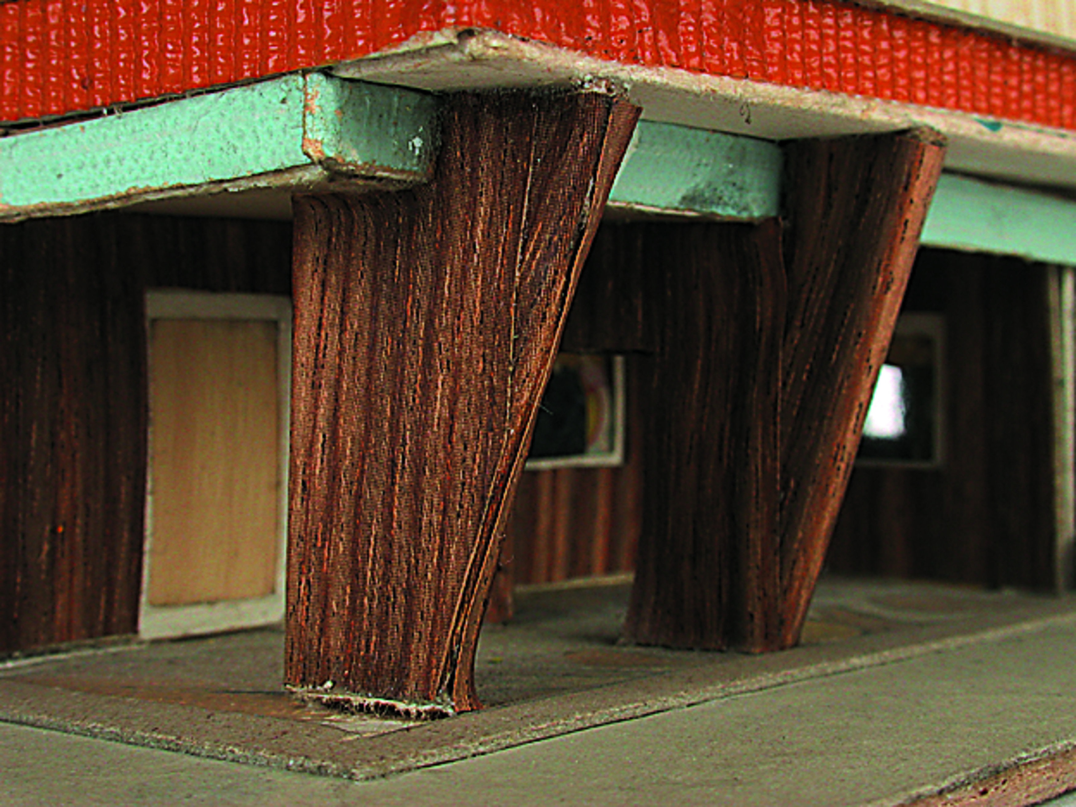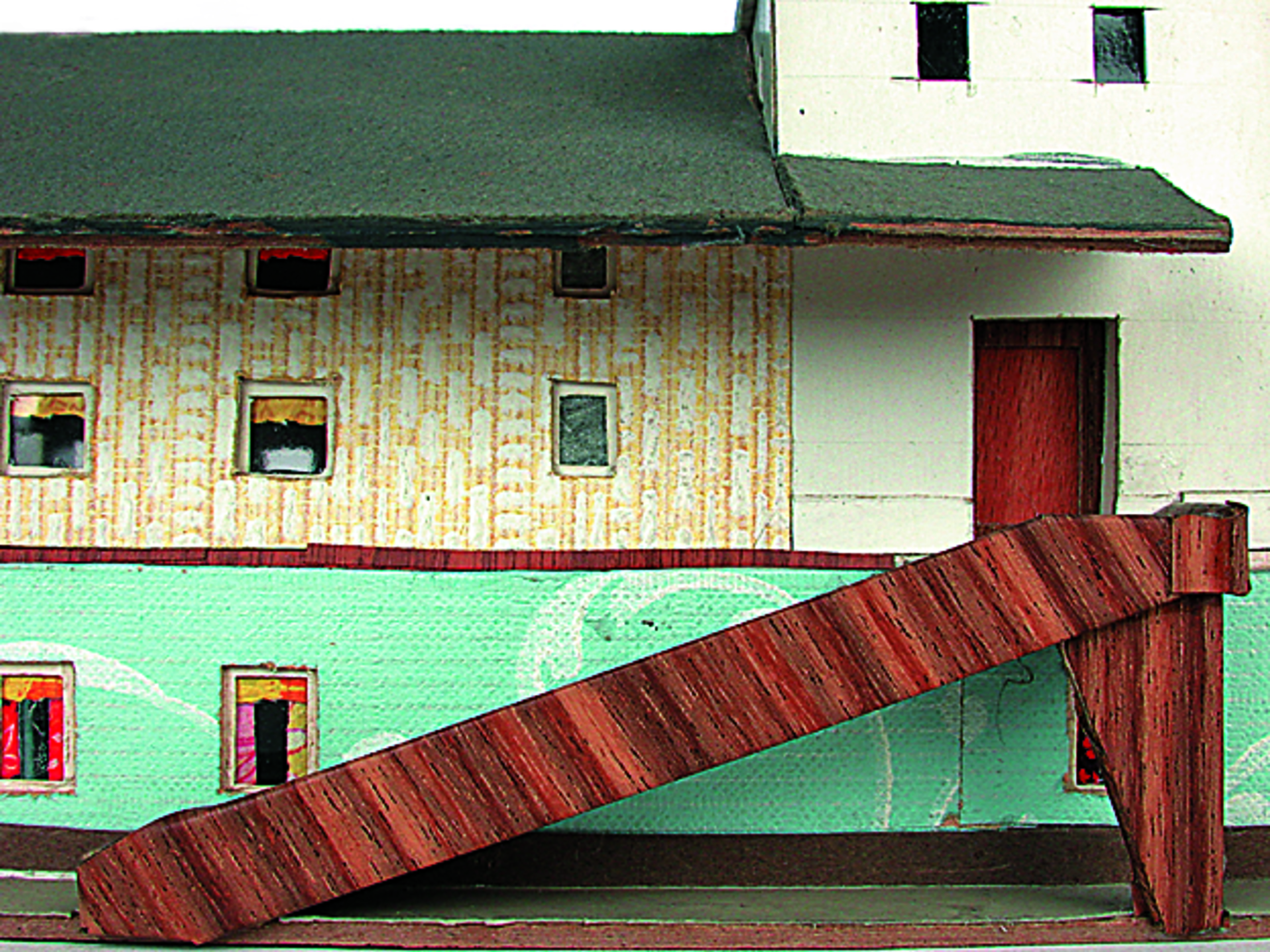 Anmerkung der Redaktion: Nicht von jedem Haus sind alle einzelnen verwendeten Materialien dokumentiert. Tatsächlich verbaute der Bastler auch Zigarettenschachteln, Spinnenpapier, Pappmaschee, Tapetenreste, Bunt- und Silberpapiere, Stoffe, Synthetikfasern, d-c-fix-Folien, Schriftproben, Zeitungsschnipsel und ausgewertete Illustrierte, Kartonagen, Holzabfälle aller Art, Uhu, Holzleim und Tapetenkleister.