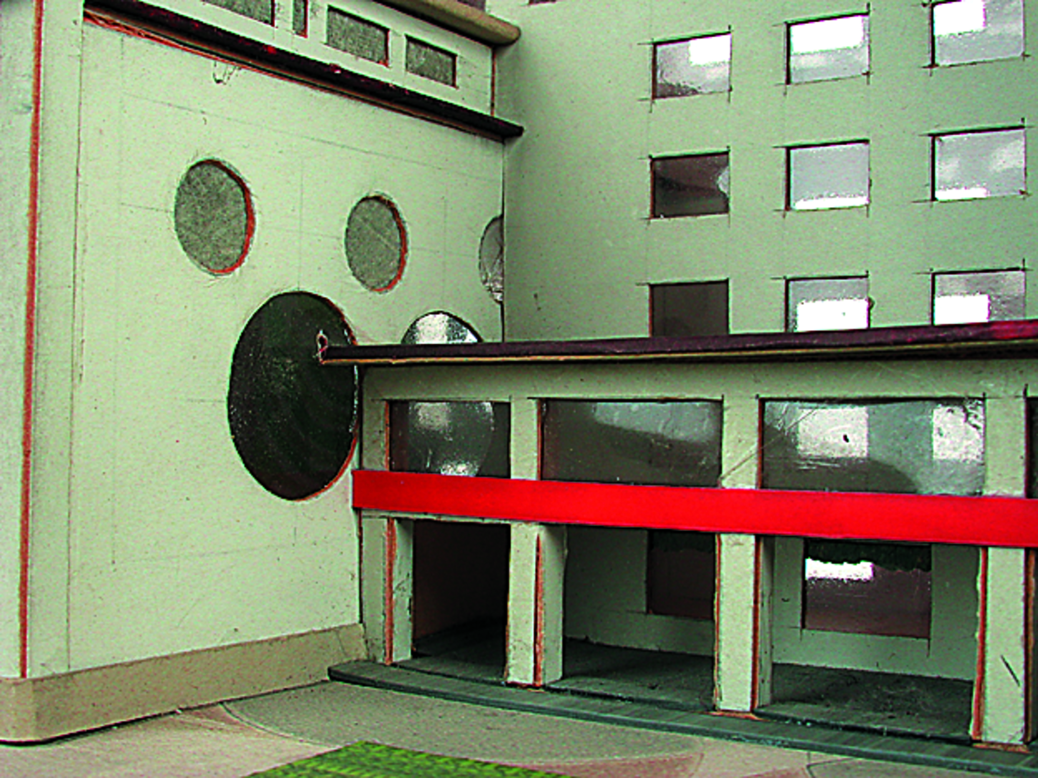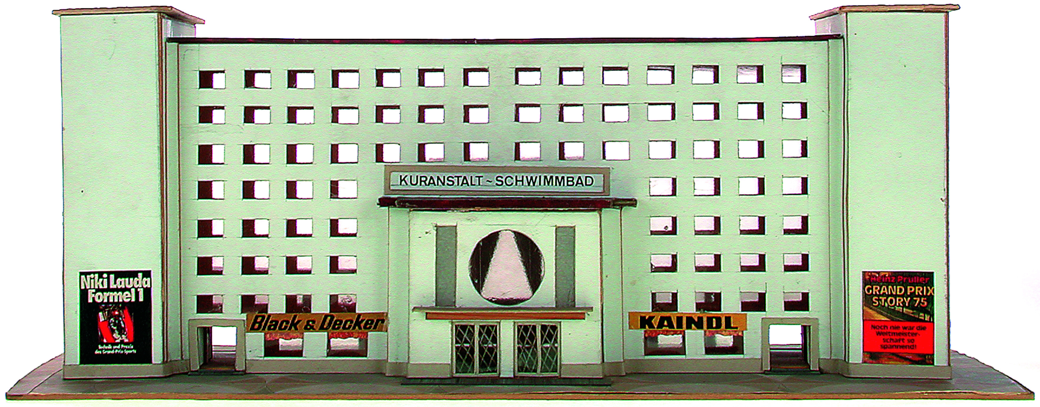 Anmerkung der Redaktion: Nicht von jedem Haus sind alle einzelnen verwendeten Materialien dokumentiert. Tatsächlich verbaute der Bastler auch Zigarettenschachteln, Spinnenpapier, Pappmaschee, Tapetenreste, Bunt- und Silberpapiere, Stoffe, Synthetikfasern, d-c-fix-Folien, Schriftproben, Zeitungsschnipsel und ausgewertete Illustrierte, Kartonagen, Holzabfälle aller Art, Uhu, Holzleim und Tapetenkleister.